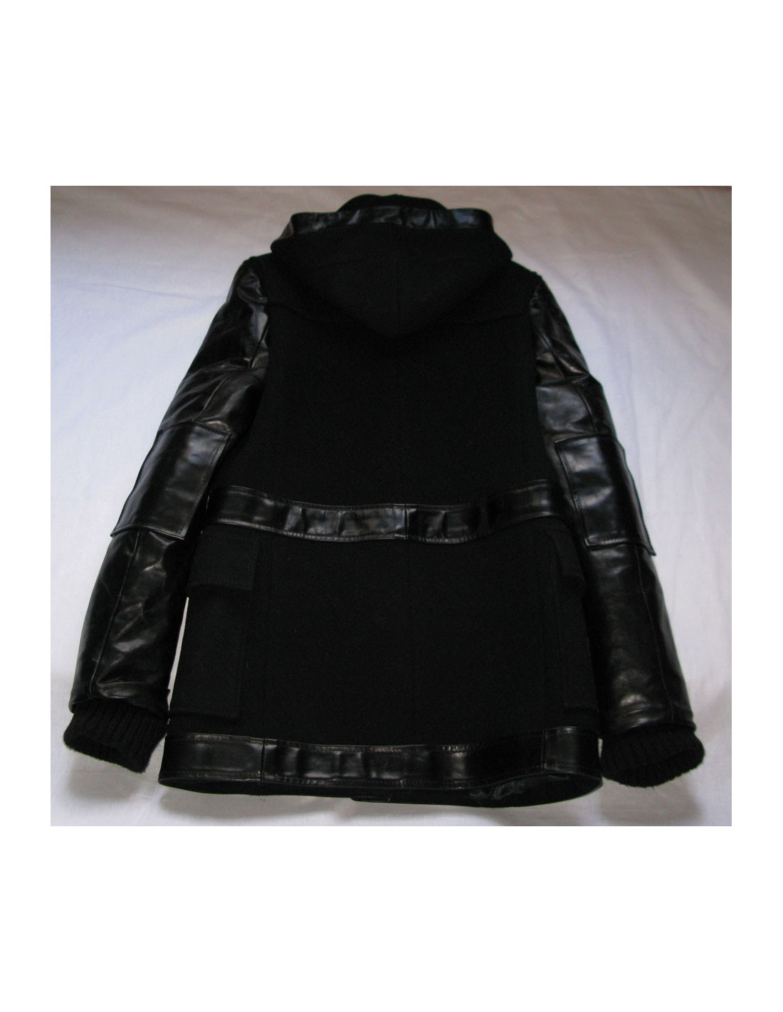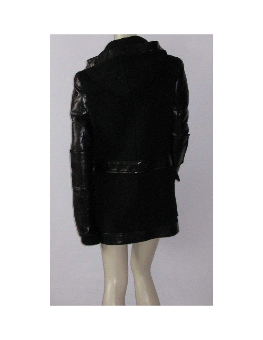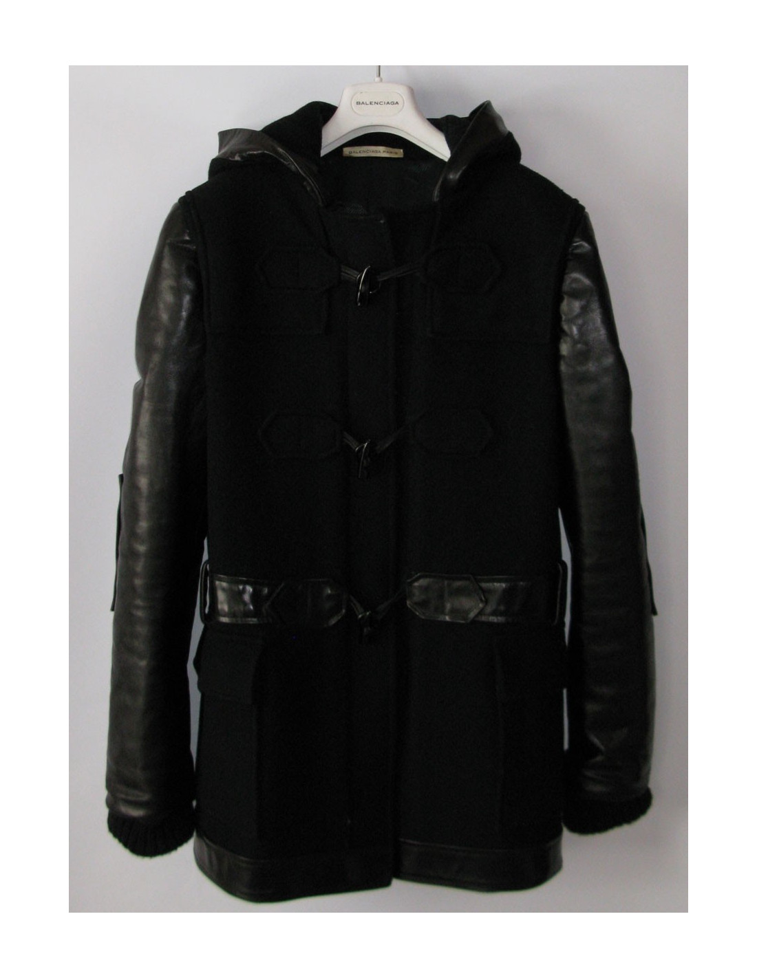 caban noir Balenciaga Unisexe, longueur trois quarts en laine épaisse, coupe droite, manches longues, larges poches plaquées, 3 attaches en "brandebourgs" système de fermeture faite de petites cornes noires qui s'enfilent dans un anneau noir attachées par un lien en cuir noir. Application en cuir sur le contour de la capuche, autour de la taille (ornés de 2 passants en cuir) et sur l'ourlet du manteau. Le caban est en laine, les manches sont en cuir et sur chaque manche il y a un empiècement en cuir.
