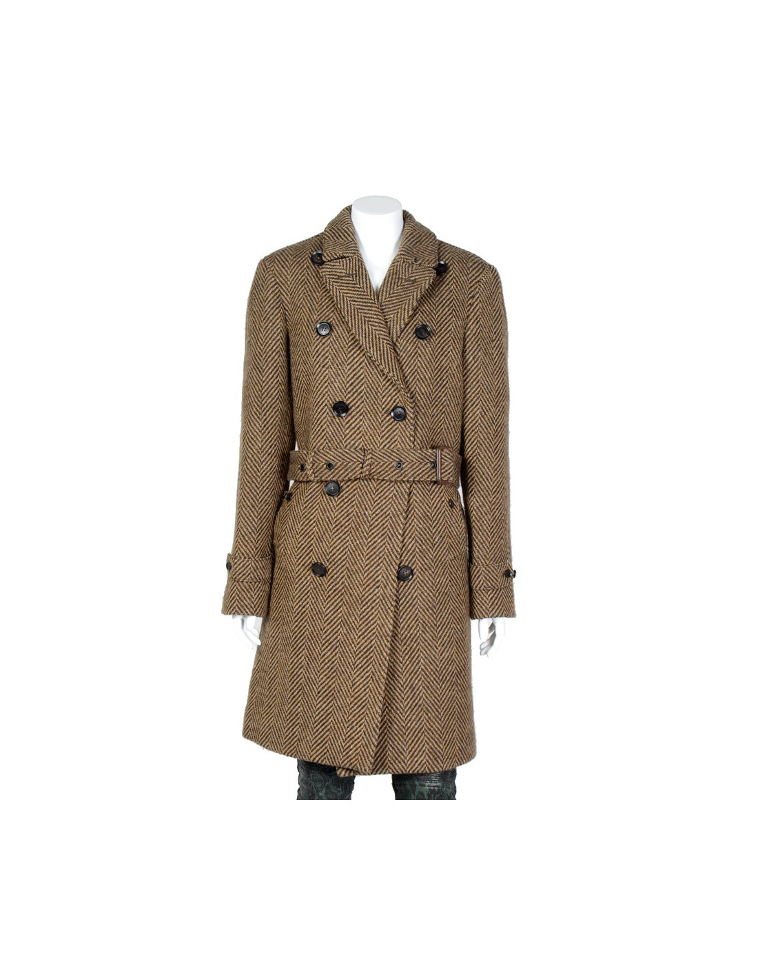 Manteau Burberry Prorsum laine chevron marron T46. Trench ceinturé chevron marron foncé et clair. Ceinture à boucle. Deux poches avant. Une fente au bas de dos. Doublure intérieure noir. Très bon état.