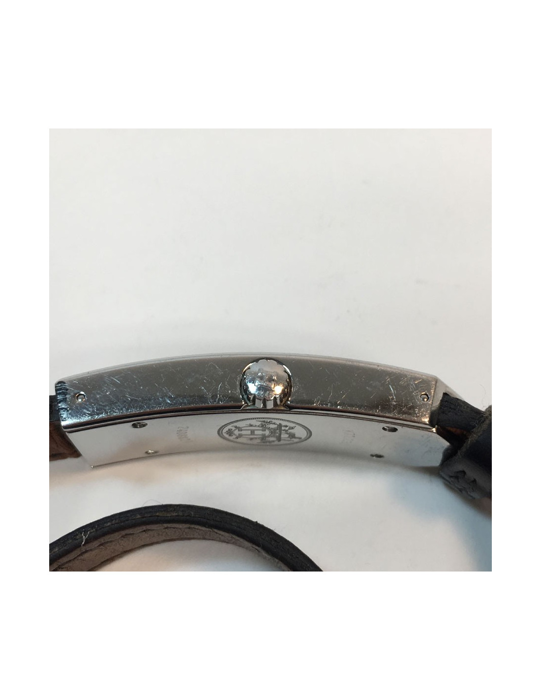 Acier, 4 brillants comme rivets, cadran blanc. Mouvement à quartz.
