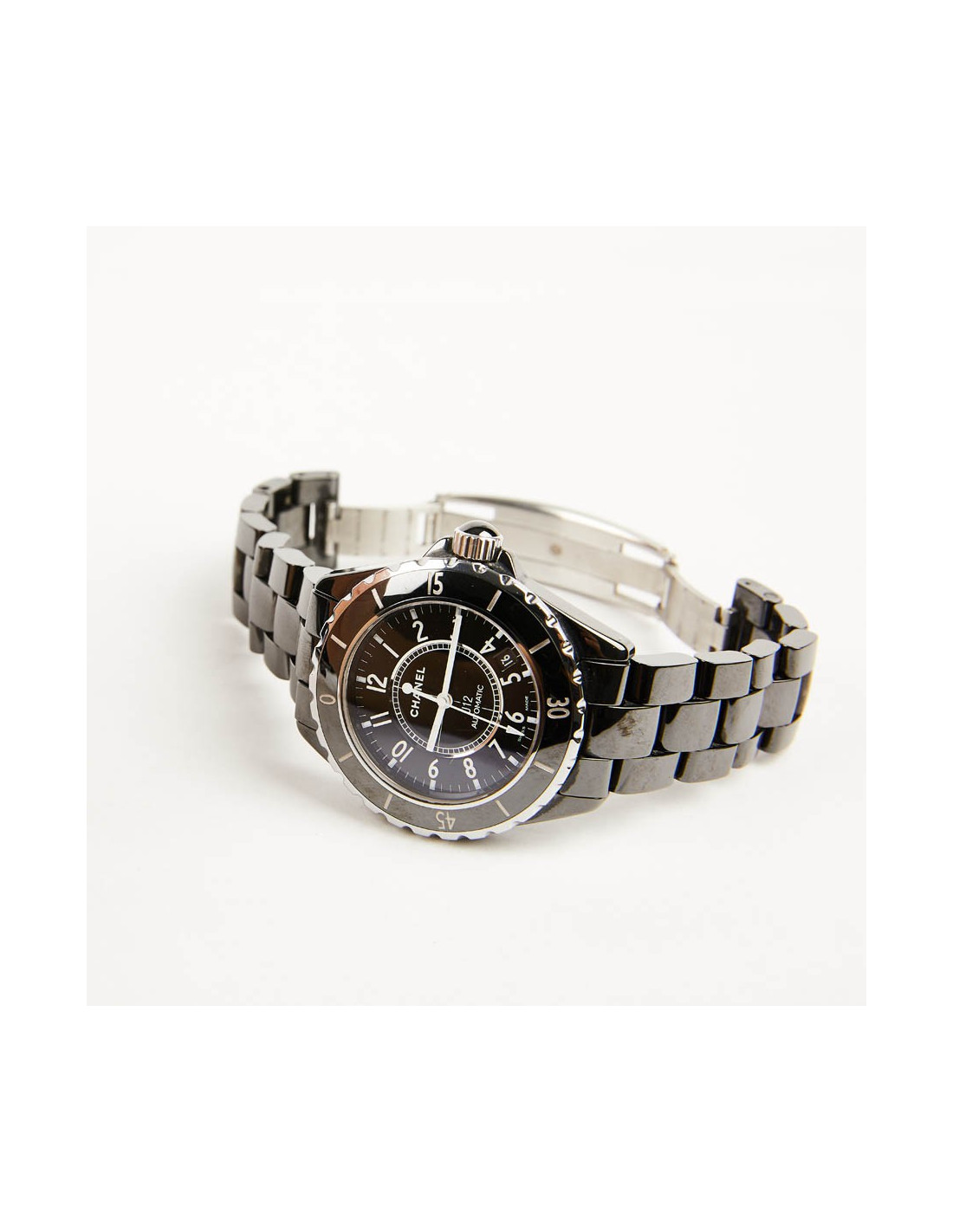 Cette montre J12 CHANEL, boitier rond d'occasion est en céramique noire. Elle a un bracelet jubilé fait d'une succession de maillons. Elle est étanche à 200 mètres. Elle a un mouvement automatique. Elle est en parfait état d'usage. Aucune micro-rayure. Le lancement de la montre J12 est né de l'imagination de Jacques Helleu Directeur artistique parfums et horlogerie de la Maison Chanel en 2000, décédé en 2007 après une quarantaine d'années au service de la marque. Depuis ce bijou est devenu un objet iconique. La montre se décline en plusieurs modèles, blanche ou noire, simple et épurée ou sertie de diamants, automatique ou à quartz. Elle a un cadran noir avec minuterie chemin de fer, et un mouvement automatique. Les chiffres arabes et les aiguilles sont luminescents, avec une trotteuse centrale. le bracelet est en céramique