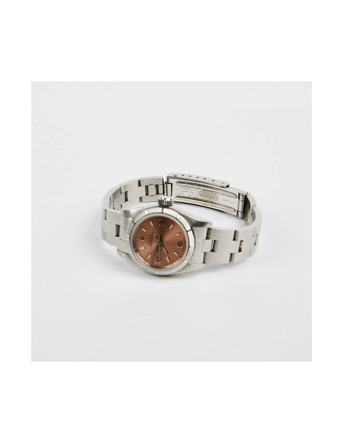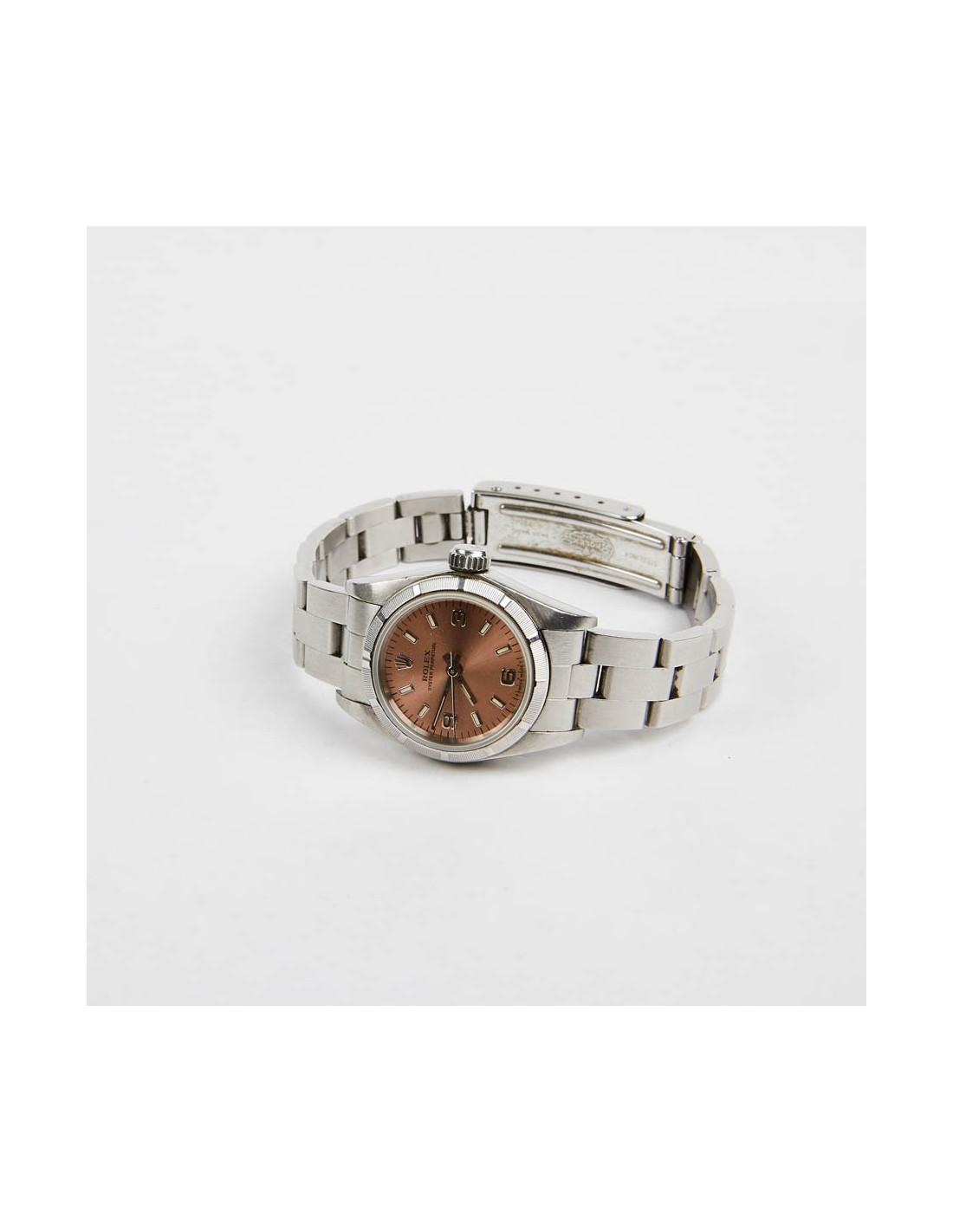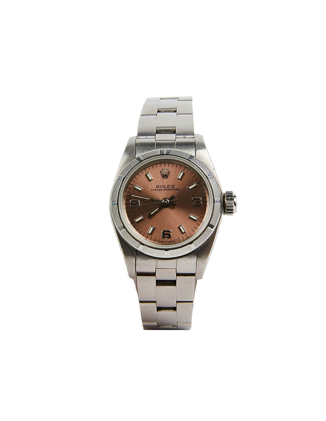 Modèle emblématique de la marque Rolex, cette Oyster Perpetual est intemporelle. Elle fait suite à la Oyster qui fut la première montre bracelet étanche apparut en 1926. Celle-ci date de 1996. C'est un mouvement automatique. Son cadran saphir est légèrement bombé. Le fond du cadran est rose. De micro-rayures sont visibles. La montre est en parfait état d'usage.