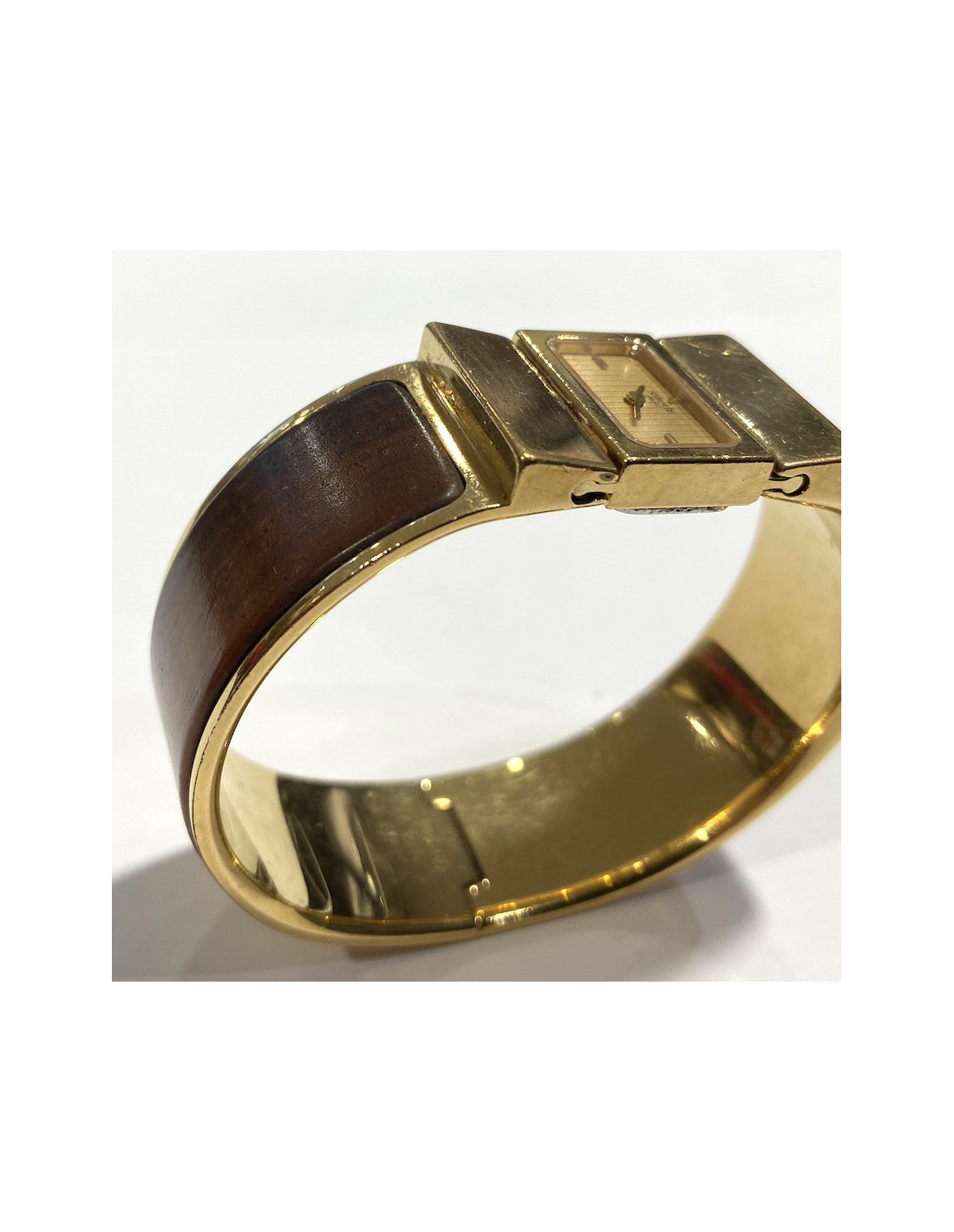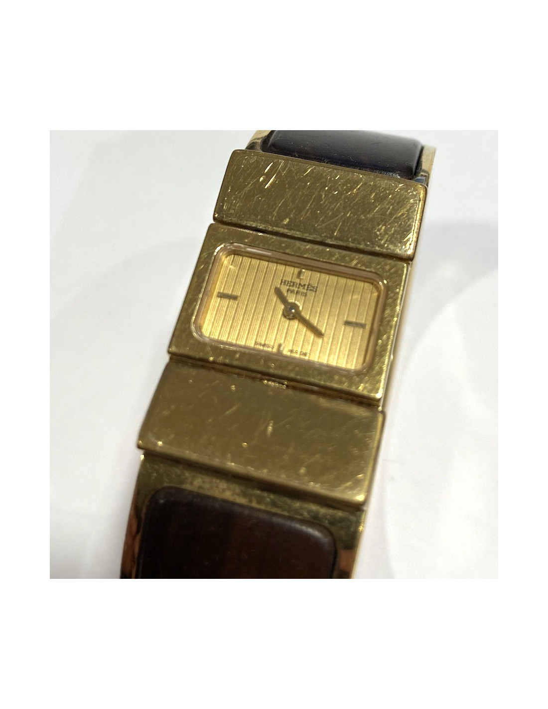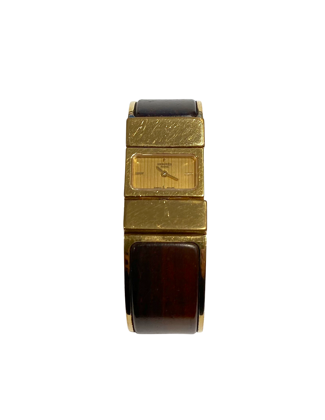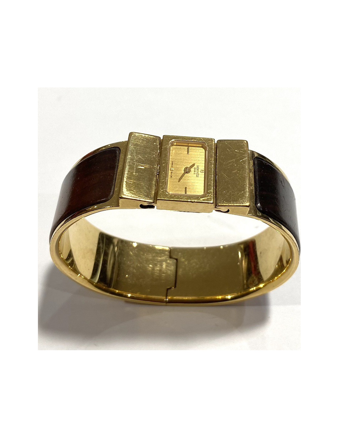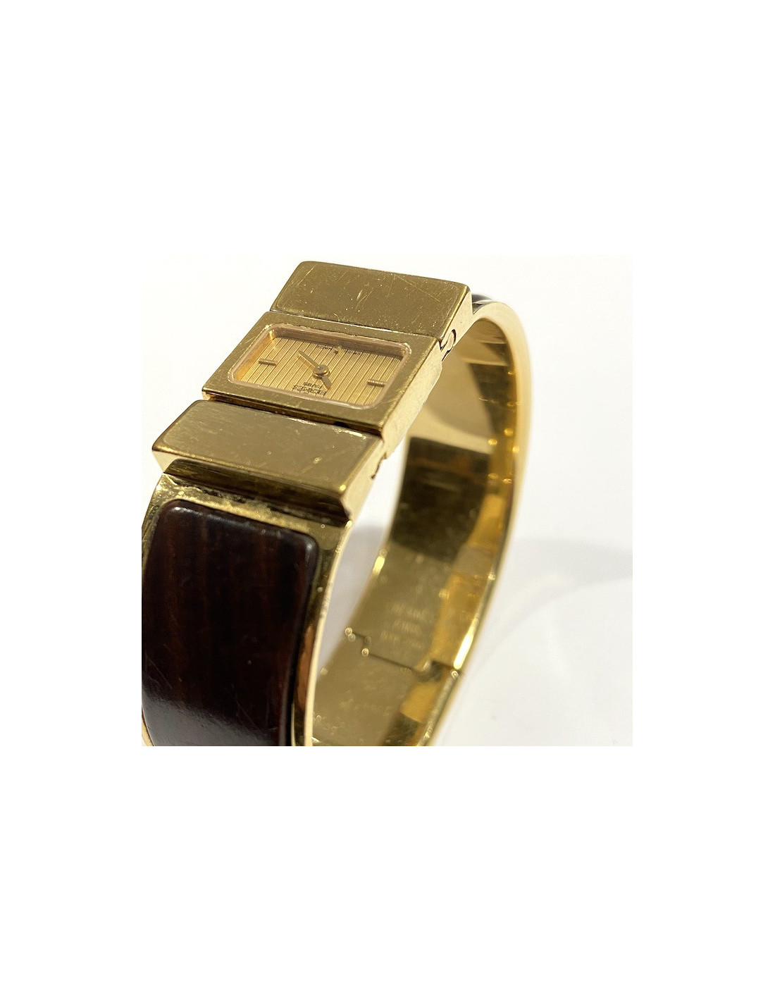 Ravissante montre Hermès, en laiton doré. Le bracelet est entouré de bois marron. C'est un mouvement à quartz. Elle n'a pas été révisée. A l'arrière du cadran signature "HERMES Paris"