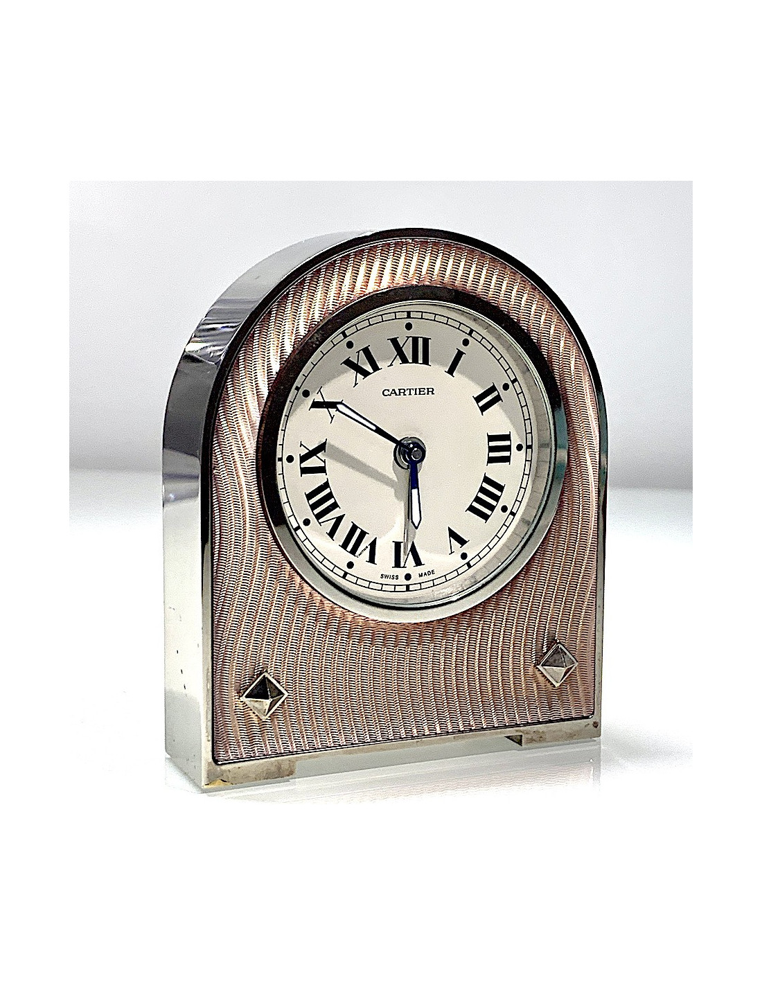 Le corps est en émail translucide rose à motif guilloché orné de cabochons argenté, une des 4 couleurs d'émail chère à CARTIER. Les 4 couleurs se composant du bleu, vert, violet et rose. Contour en acier.