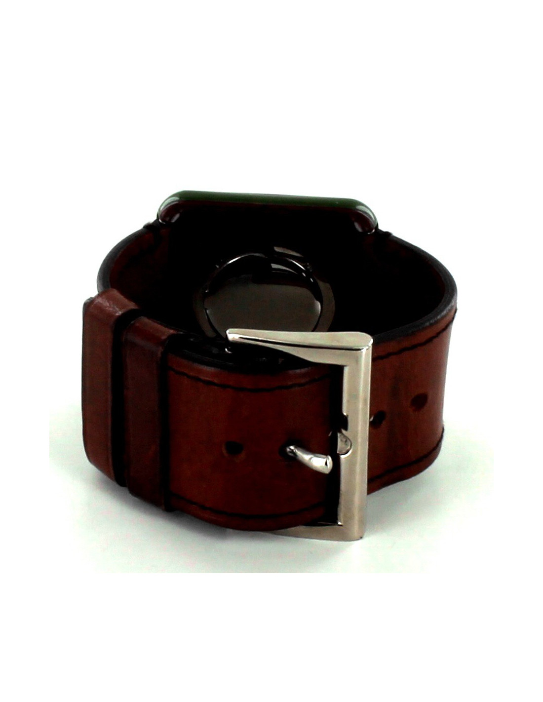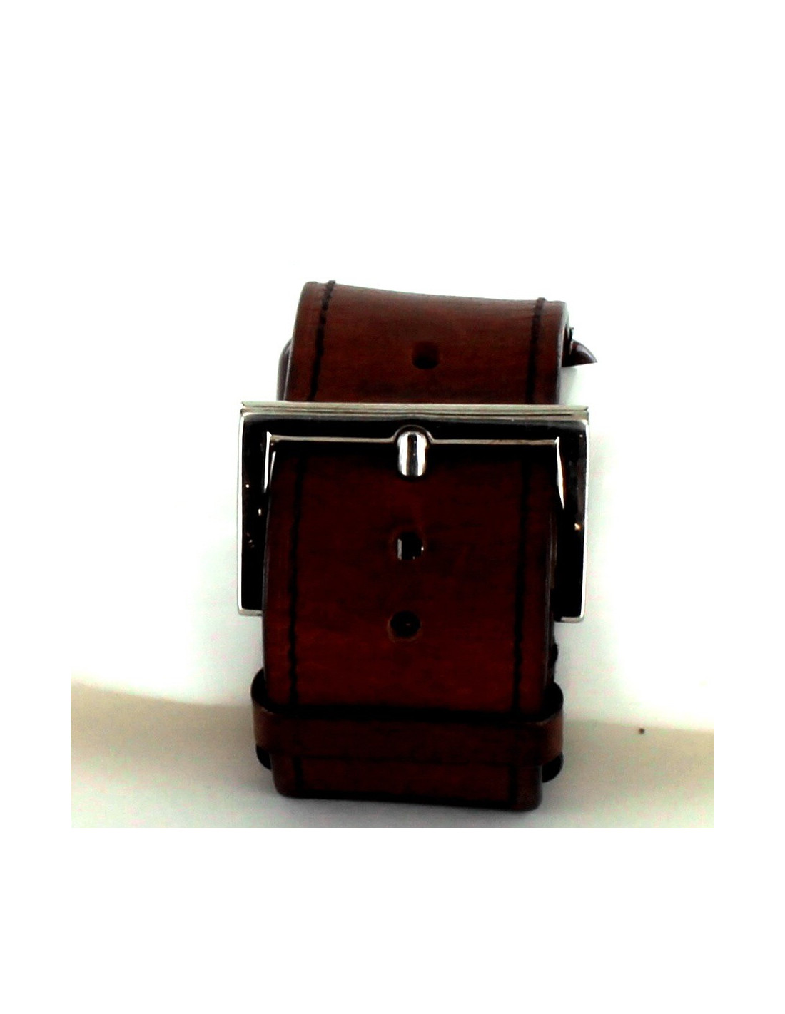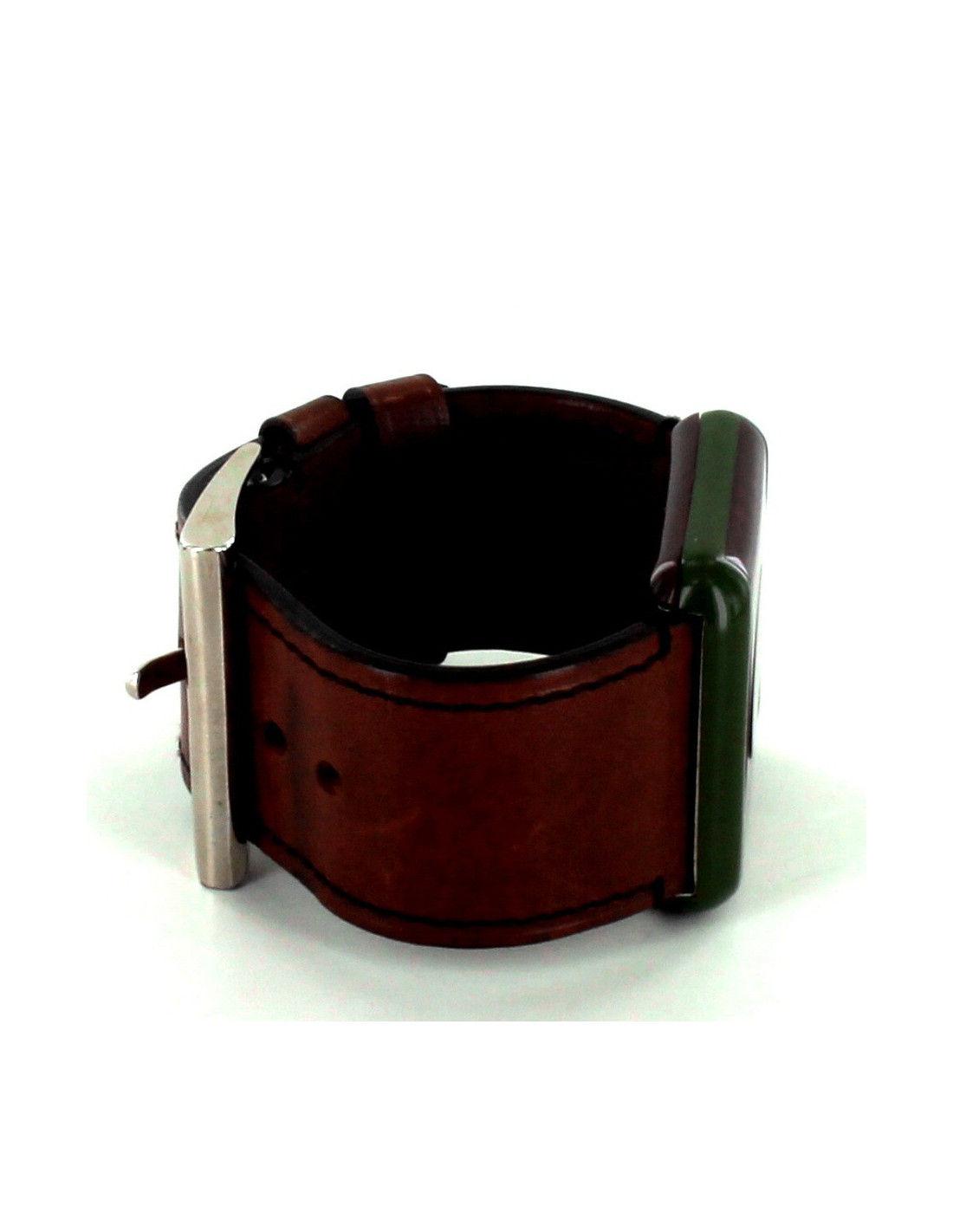 le bracelet est en cuir naturel avec des surpiqûres marron foncé dont la largeur est 3.5 cm