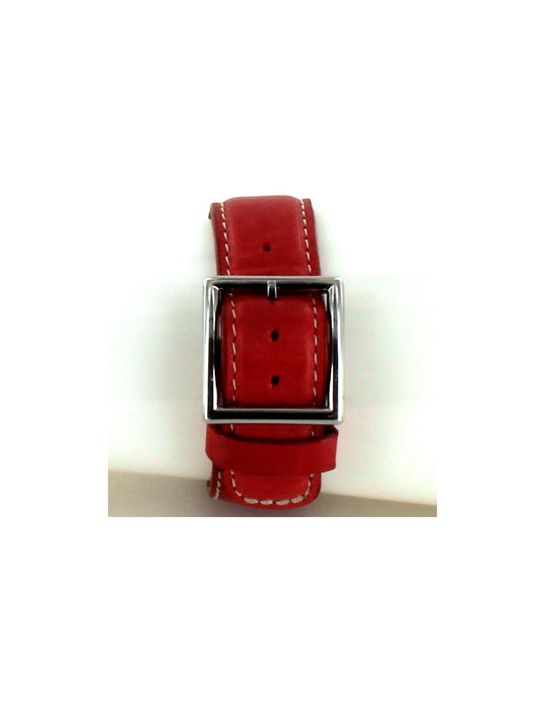 métal argenté, avec un bracelet en cuir rouge (quelques légères traces sur le cuir)