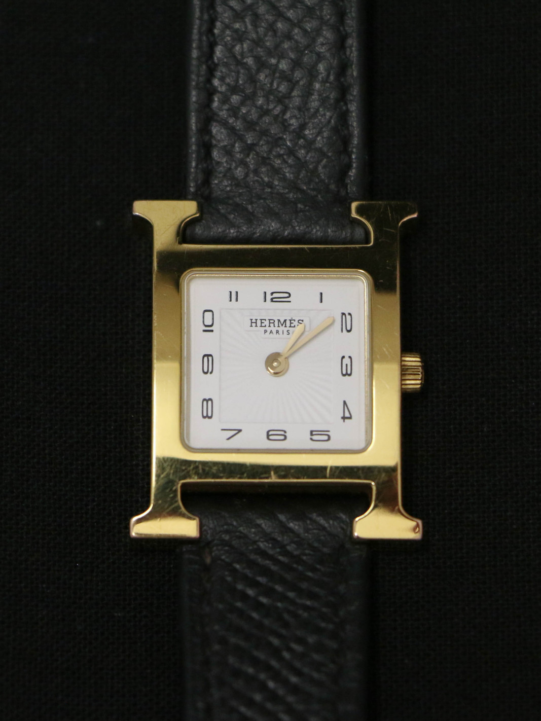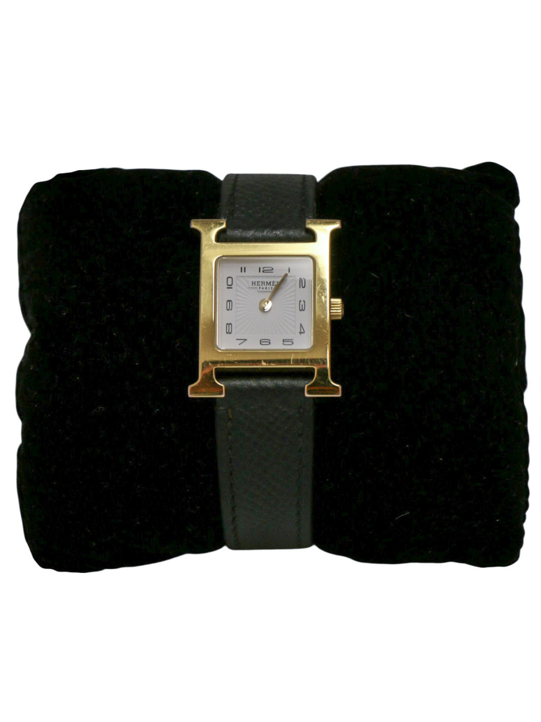 Élégante et intemporelle, la montre Hermès Heure H petit modèle incarne à merveille l’esprit de la Maison Hermès, où le design rencontre l’excellence artisanale. Avec son boîtier emblématique en forme de “H”, délicatement plaqué or jaune, ce modèle se distingue par une silhouette immédiatement reconnaissable, à la fois audacieuse et raffinée. Son cadran argenté opalin est signé “Hermès Paris” et “Swiss Made”. Le bracelet en cuir Epsom noir texturé, signature du savoir-faire maroquinier de la Maison, apporte une touche de sophistication supplémentaire et épouse élégamment le poignet.