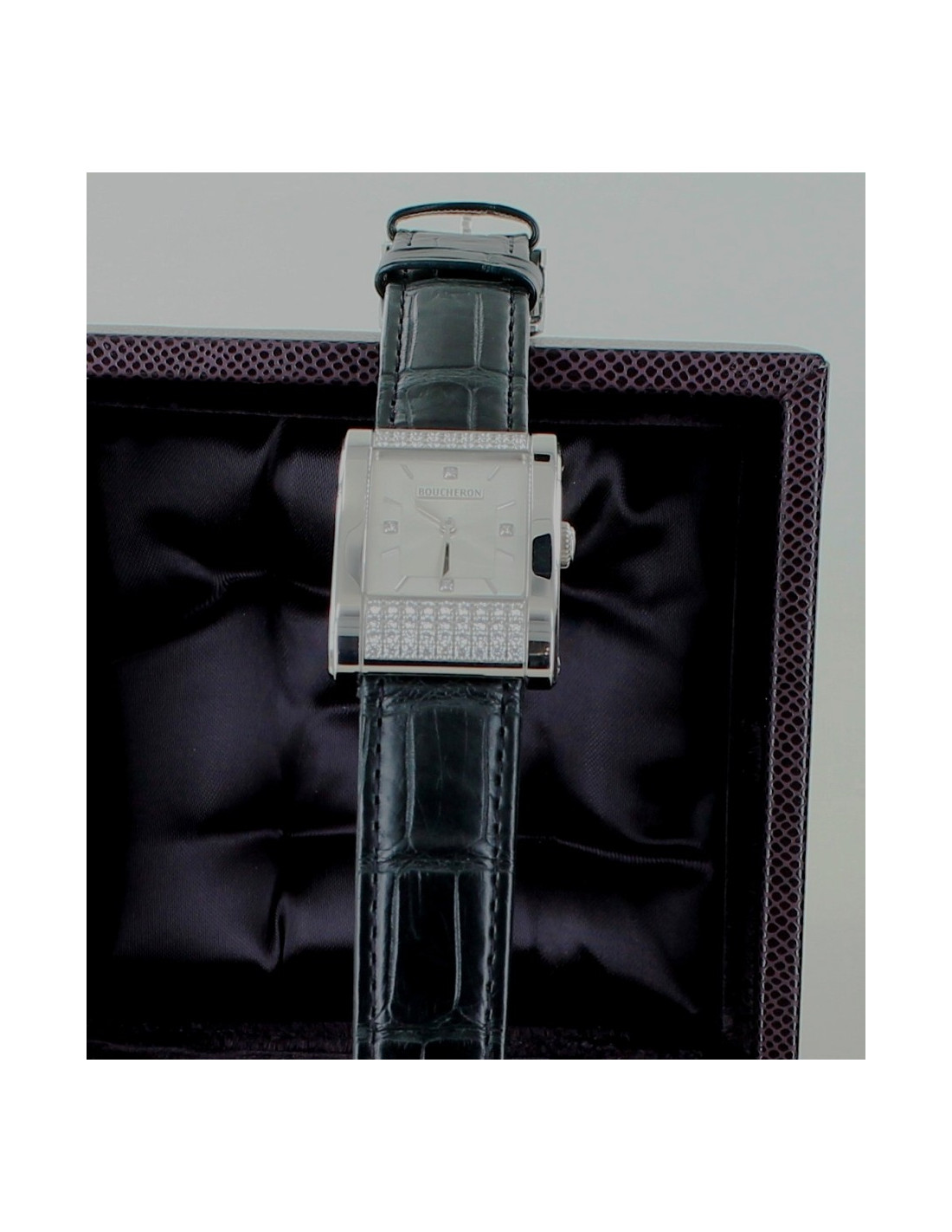 Montre "Reflet de la Maison Boucheron, en acier et diamants. 54 diamants composent cette montre, mouvement à quartz, fonctions : heure et minute, boitier acier serti de diamants, bracelet d'origine (très bon état) en crocodile noir et boucle ardillon en acier