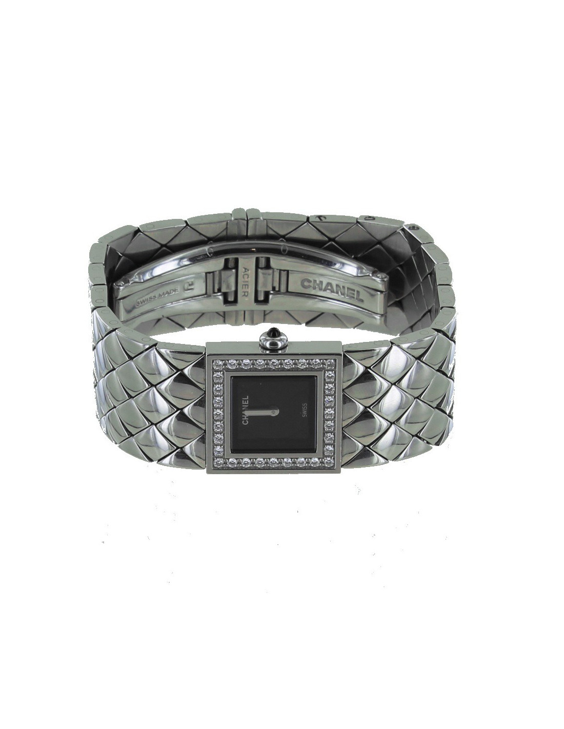 Magnifique montre matelassée en acier et diamants, pour femme Chanel. Collection : Timeless Chanel . La référence de cette montre : HO489 et son prix public est : 4500 euros.