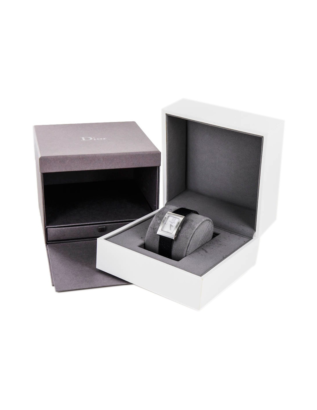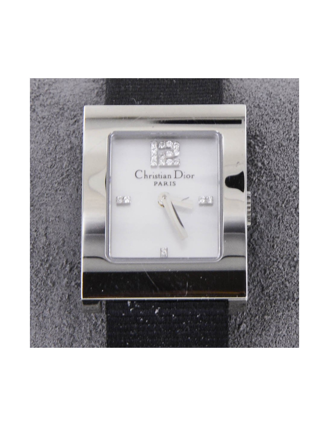 Montre Dior Collection "Malice", acier argent palladié, en très bon état. Elle a des micro rayures d'usage - bracelet en satin noir en très bon état, très peu porté, numéro de série gravé à l'arrière de la montre, Christian Dior Paris swiss made -, intérieur du cadran en nacre et chiffres en diamants. étanchéité :30 mètres - mesures de la montre : 2.5 cm x 1.9 cm - épaisseur au centre 0.5 cm - longueur totale au dernier trou 20 cm - largeur du bracelet 1.4 cm - certificat de garantie -certificat : 19 brillants (0.041 carats) - et 2 livrets - livrée dans son coffret et boite Dior