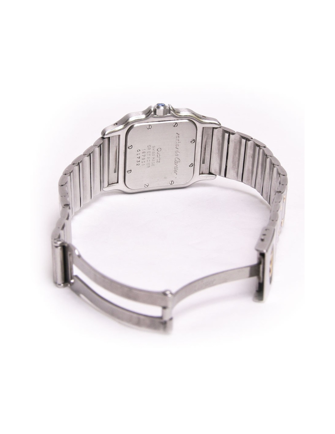 Le bracelet et en acier et vis en or jaune18 carats (micro rayures légères), avec une boucle deployante. Le mouvement est à quartz.