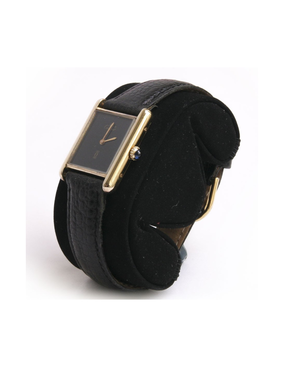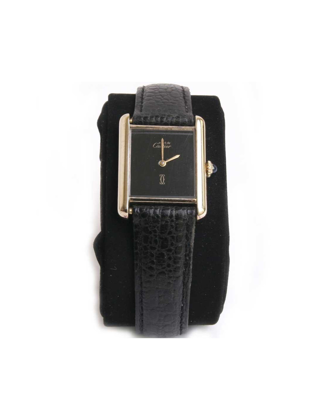 Célèbre montre Tank Must en vermeil Cartier pour femme, automatique, fabrication Suisse. Son boitier est rectangulaire 2 x 1.7 cm, et le verre avec intérieur noir en saphir sont signés Cartier et les aiguilles glaives sont en or.