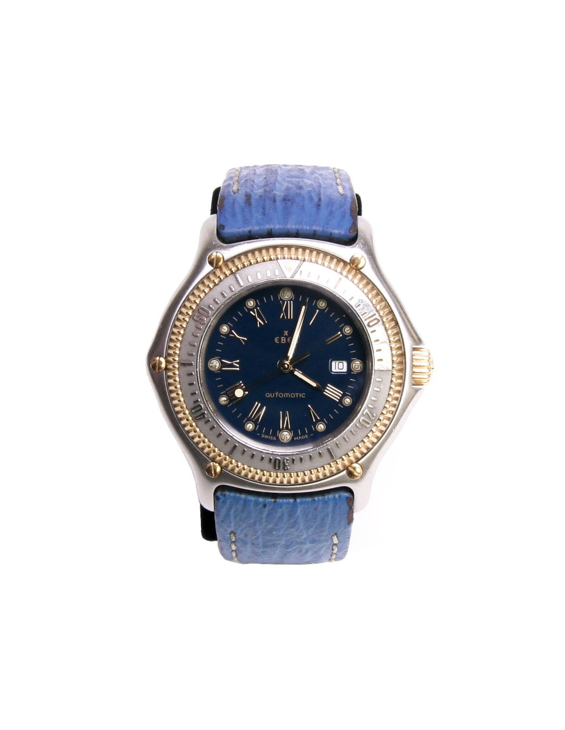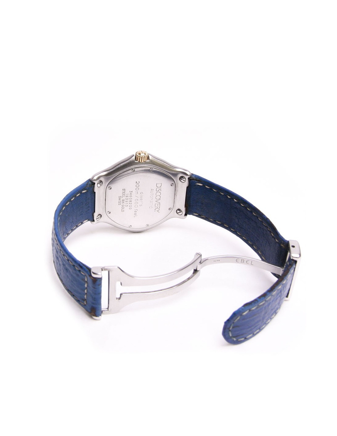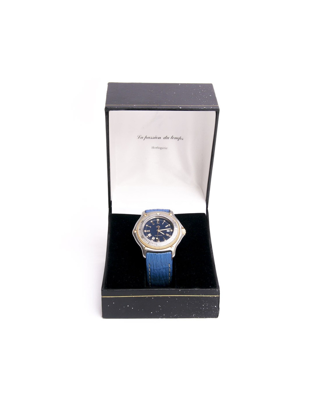 Cette montre est en or et en acier et bracelet en cuir bleu et piqûres sellier fil blanc et boucle déployante.