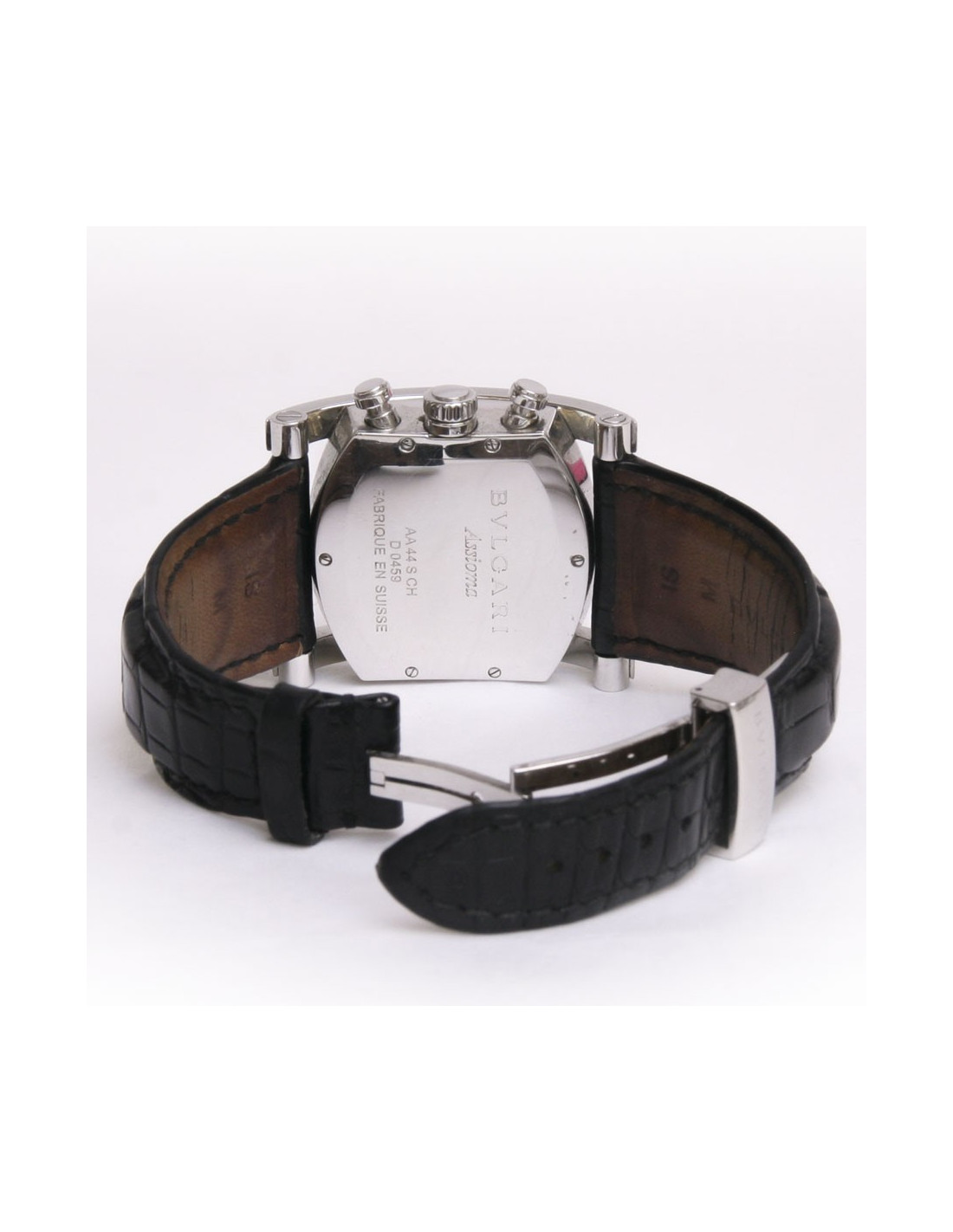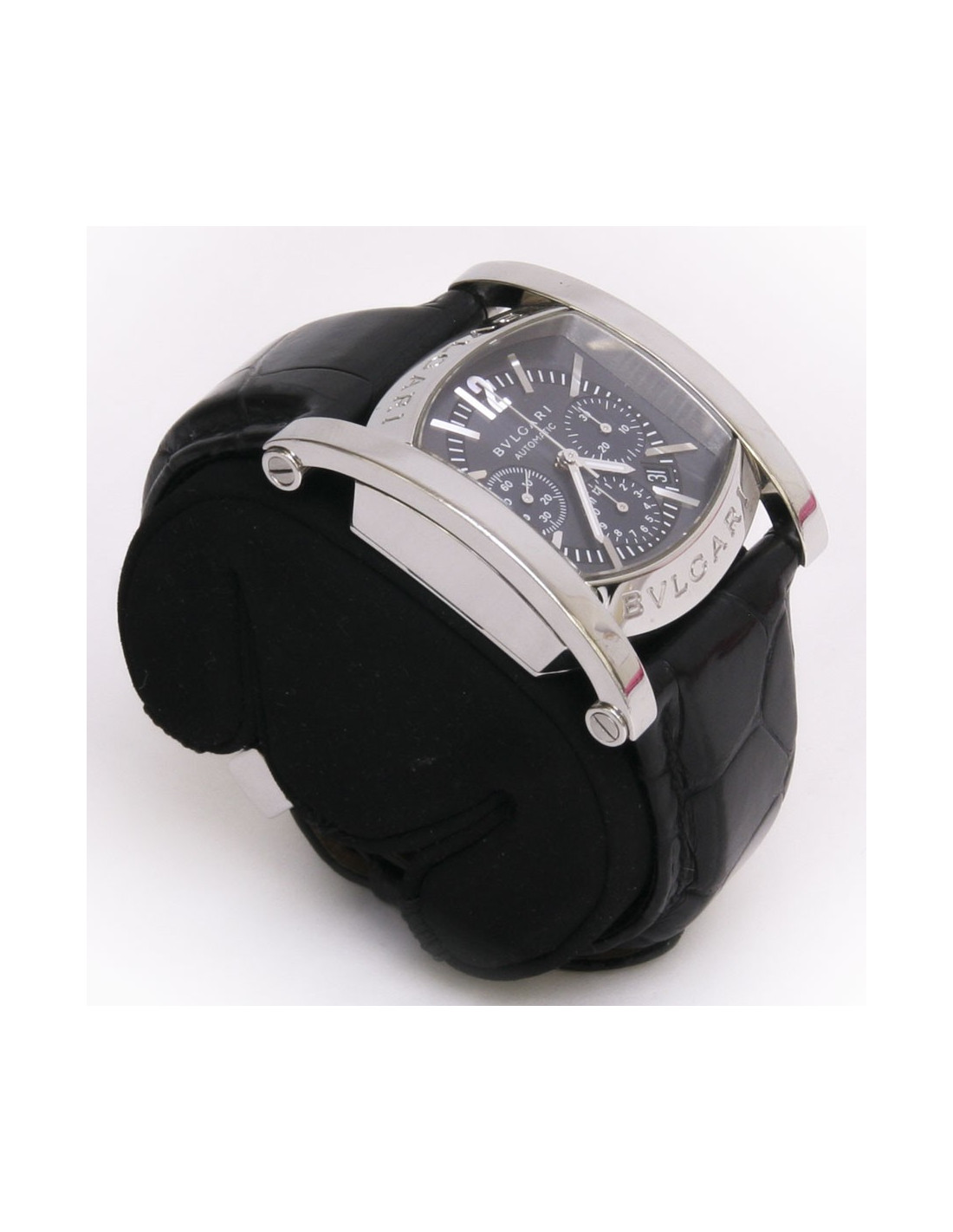 Mouvement : remontage automatique, le boitier est en acier 48 x 38 mm,épaisseur 1.1 cm., verre saphir, index argent et aiguilles argent, cadran noir, complications : chronographe, date,les aiguilles sont lumineuse, en excellent état de marche. Vendu sans garantie. Le bracelet est en crocodile noir avec une boucle déployante. Un deuxième bracelet articulé avec boucle déployante signé Bulgari. (maillons supplémentaires),étanchéité : 5 ATM, chiffres du cadran : sans chiffre.