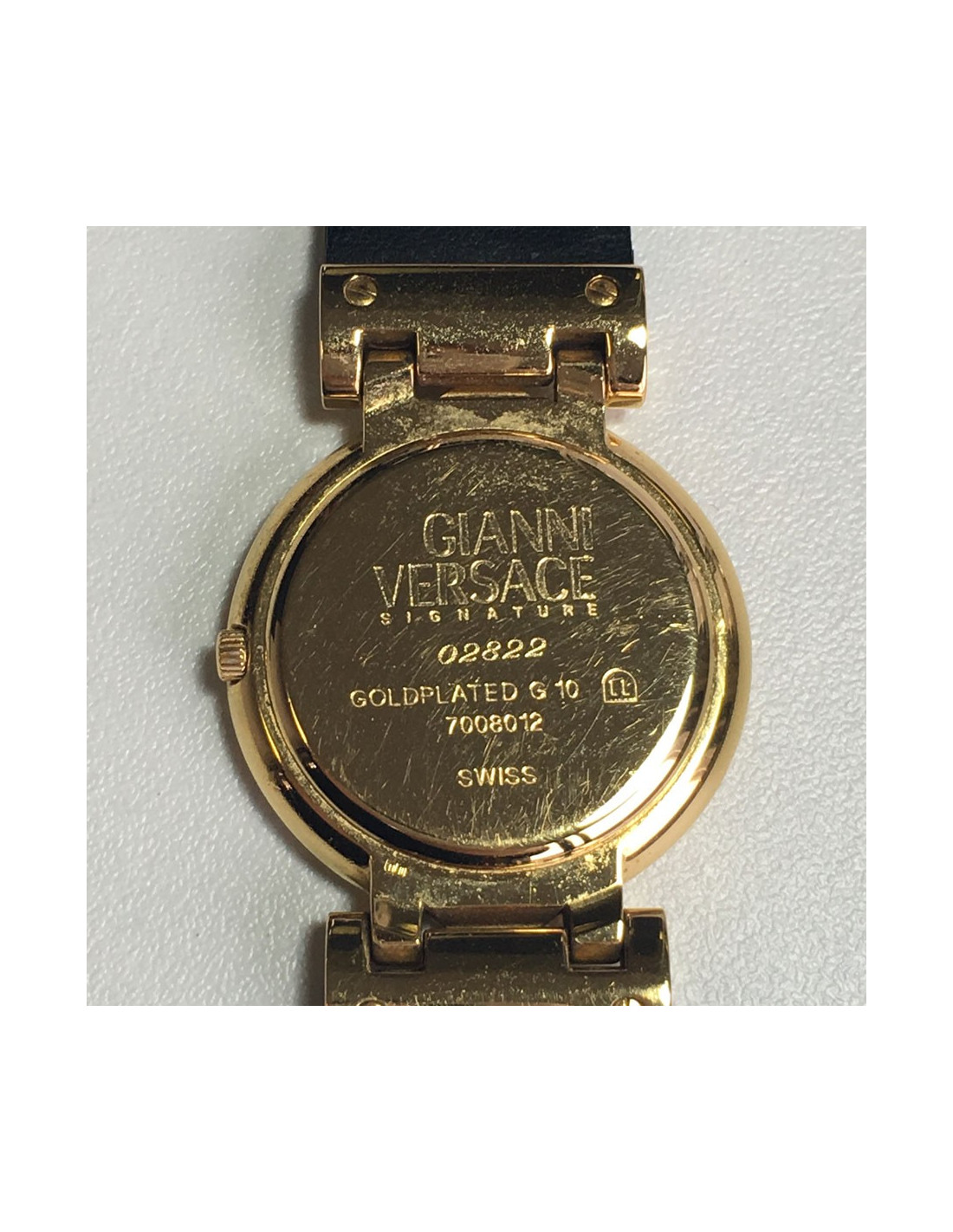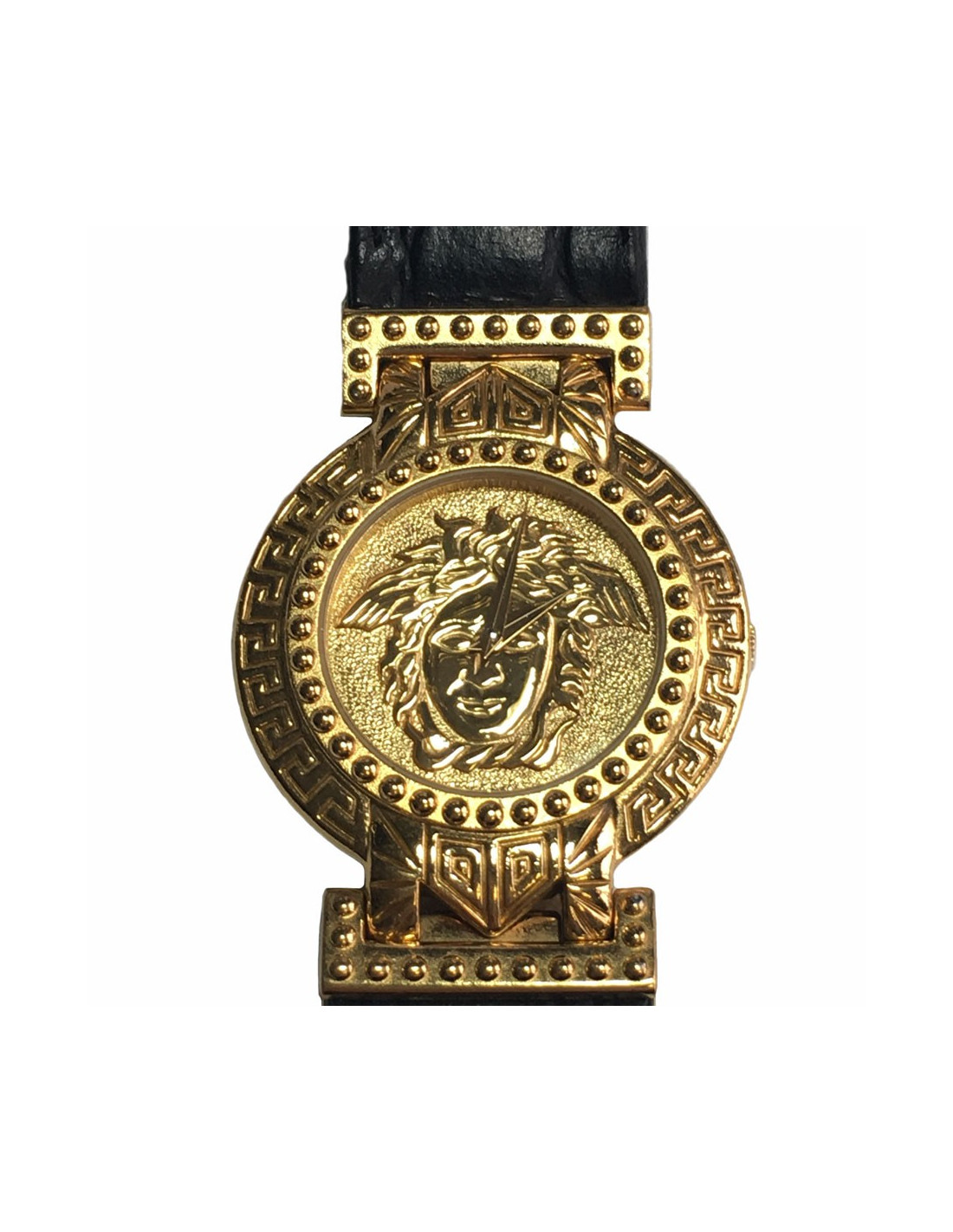 Montre GIANNI VERSACE "Signature Médusa". Boîtier rond plaqué or et bracelet en cuir noir façon croco. Mouvement suisse à quartz 2 aiguilles. Numéro d'édition gravé au dos du boîtier: 02822