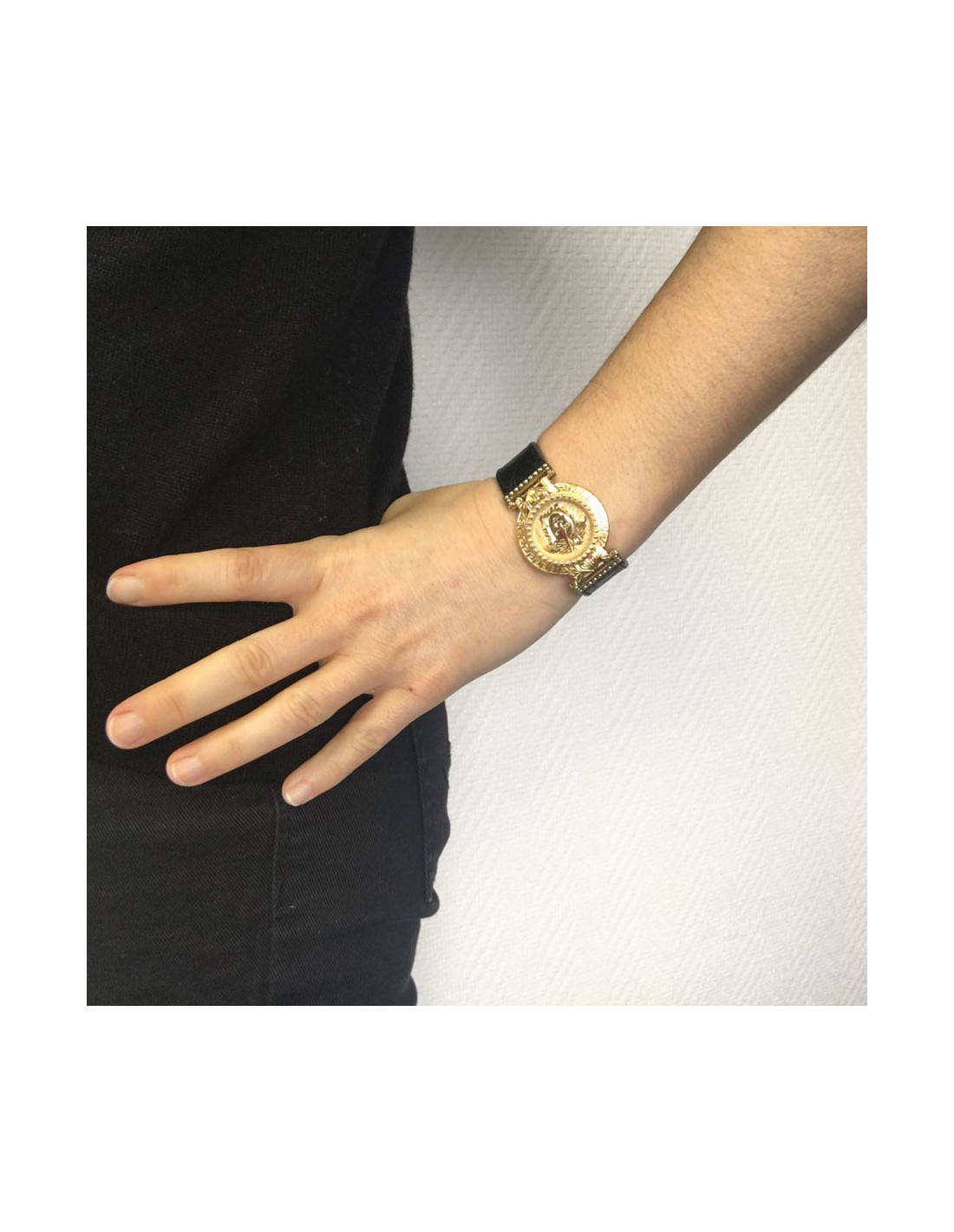 Bracelet en cuir noir façon croco.