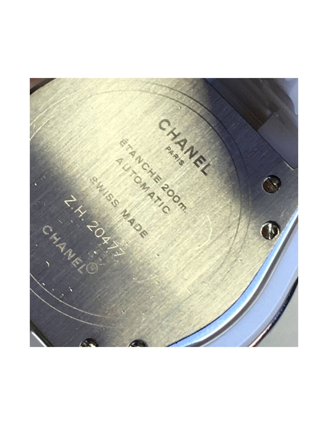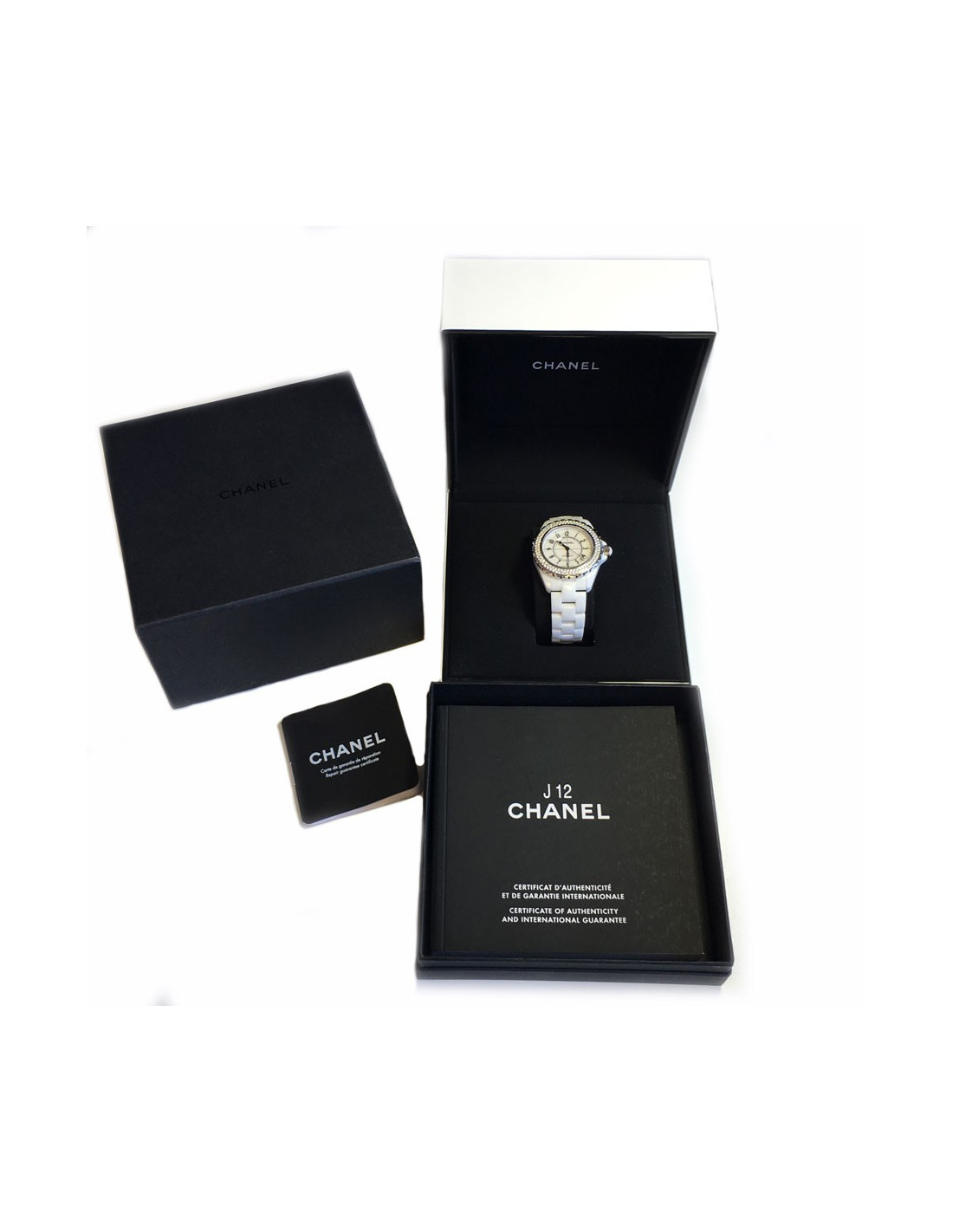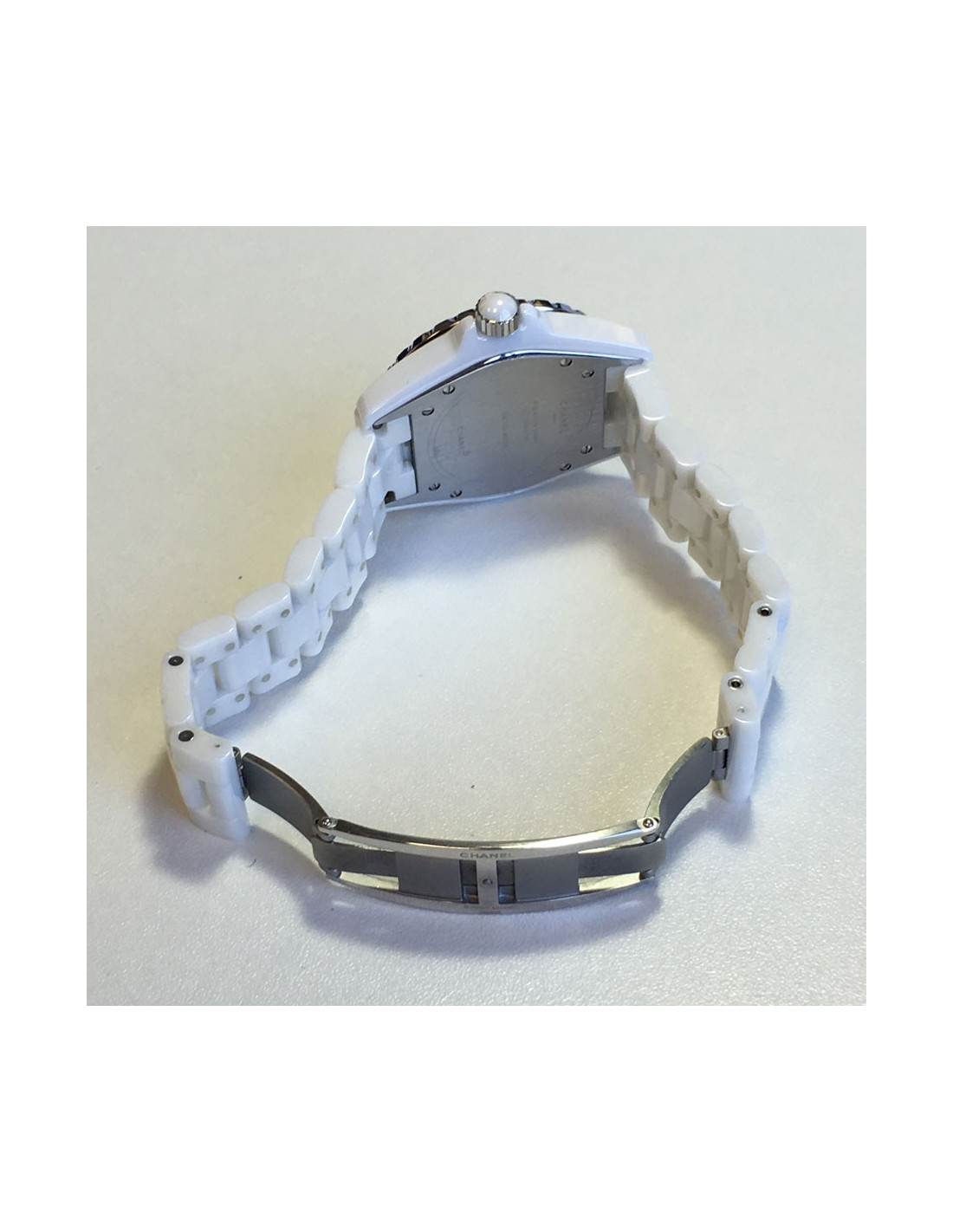 Montre J12 CHANEL en céramique blanche et diamants. Lunette sertie de 2 rangs de diamants taille brillant (1,6 cts). Le cadran est rond à fond blanc; chiffres arabes noirs, dateur à 4 h 30 Mouvement mécanique à remontage automatique. H0969. Numéro de série: ZH20... Diamètre: 38mm.
