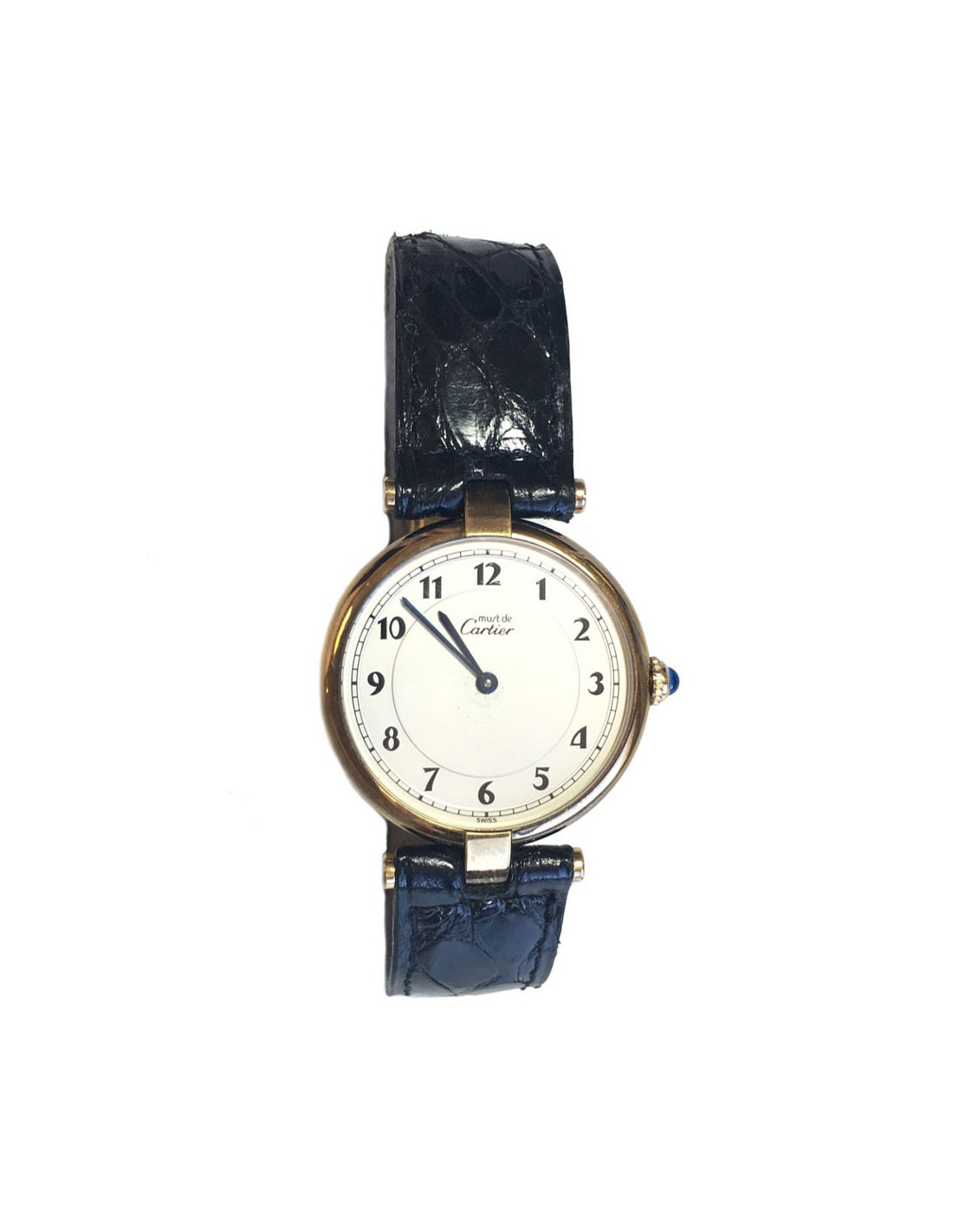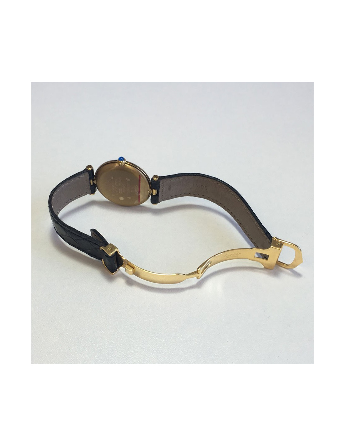 Montre Must de Cartier pour femme, en vermeil (argent recouvert d'or) avec boitier rond avec boucle déployante. cadran couleur argent.La couronne du remontoir sertie d'un cabochon de saphir. Mouvement à quartz avec chiffres arabe.