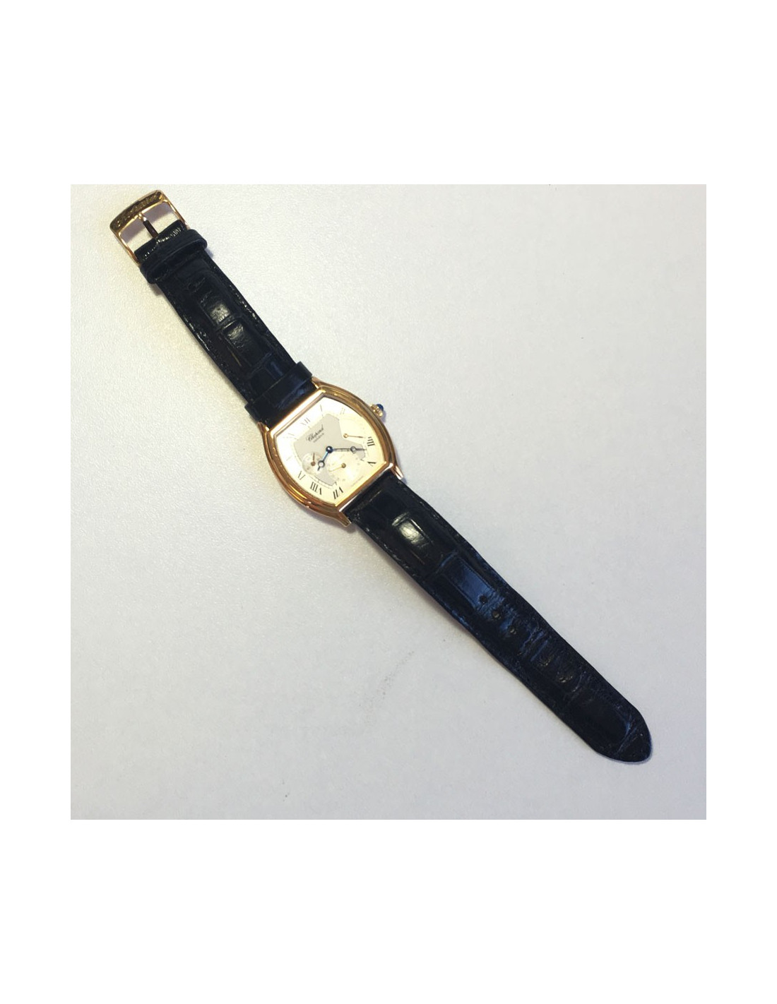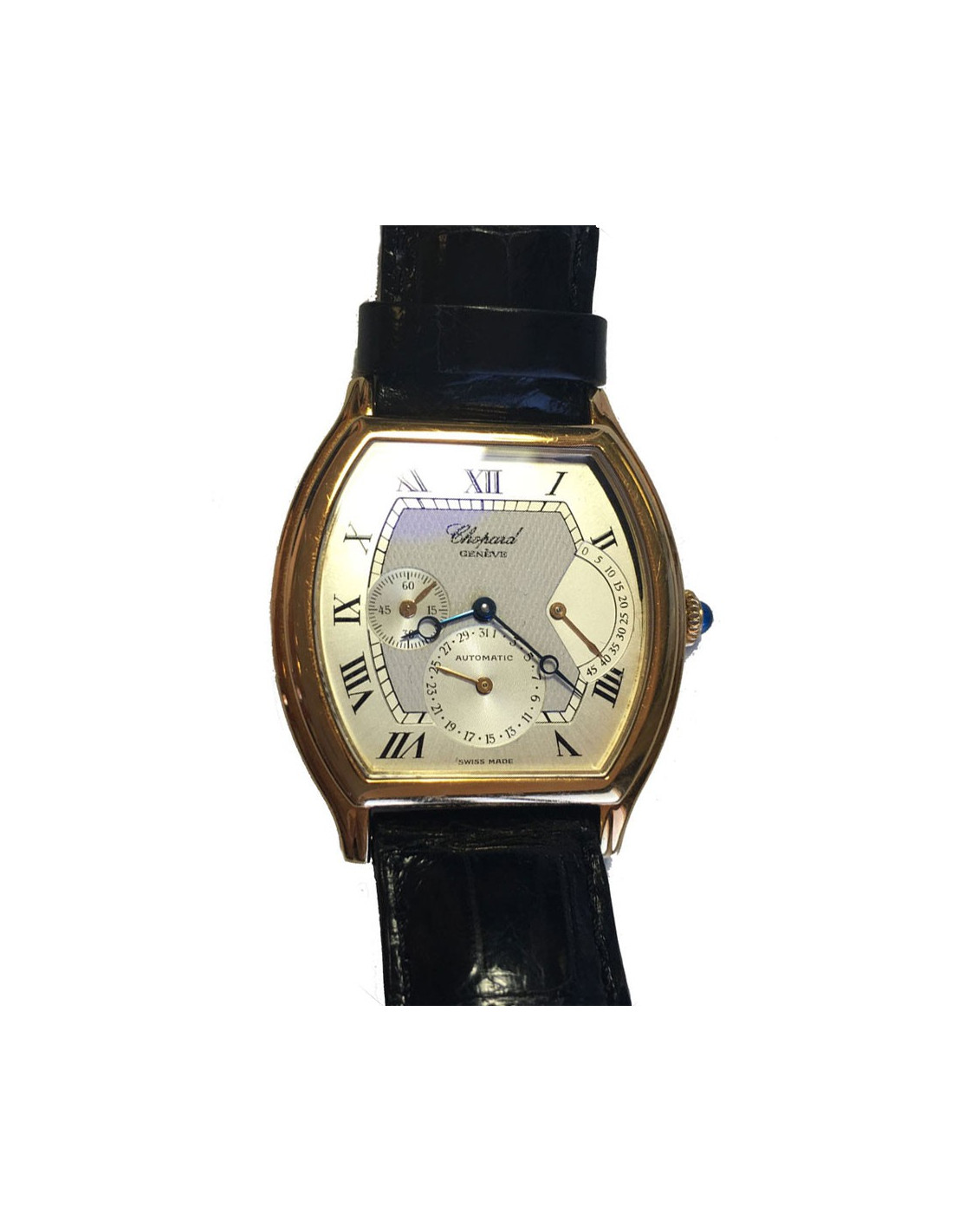 Elle est automatique et le bracelet est en cuir crocodile noir. Le boitier est en forme tonneau, en or jaune.