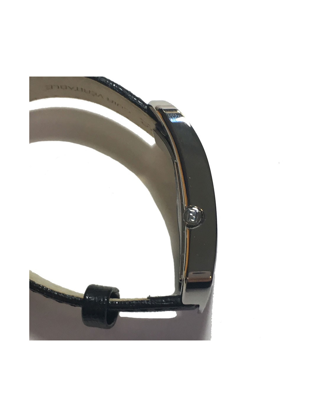Cadran nacré. Deux diamants sur le cadran. Bracelet en cuir noir. Boucle en acier argenté. Glace saphir. Mouvement à quartz.