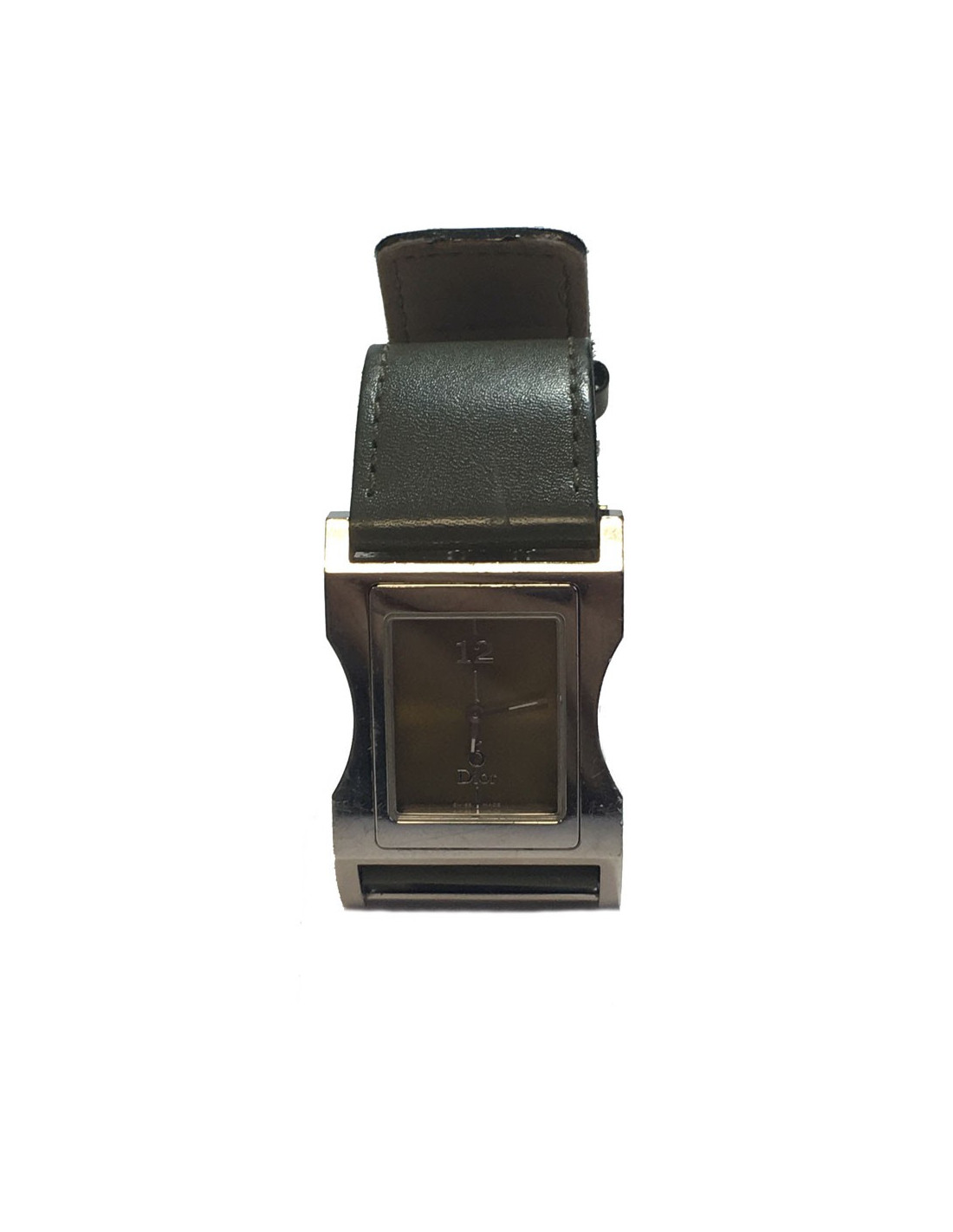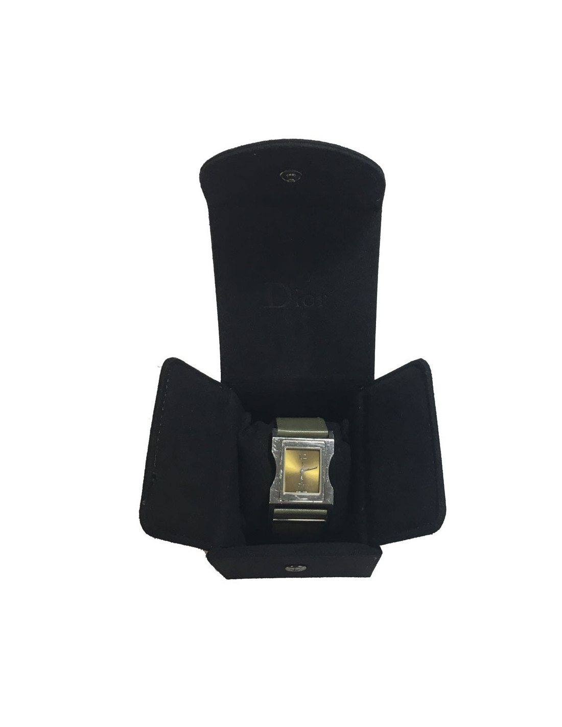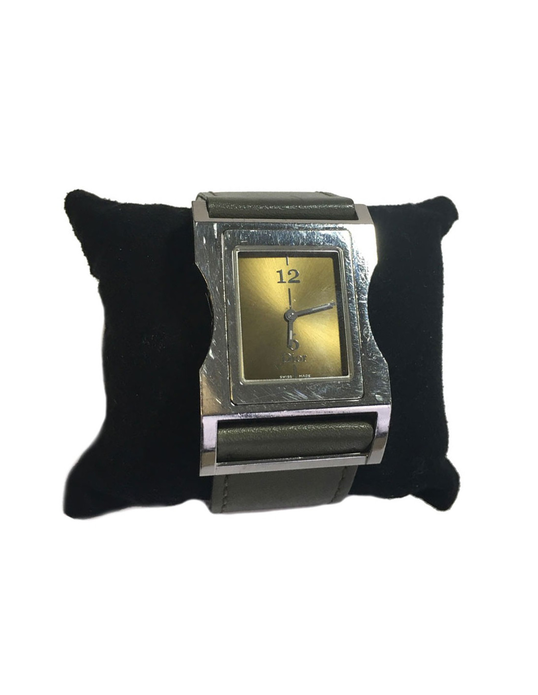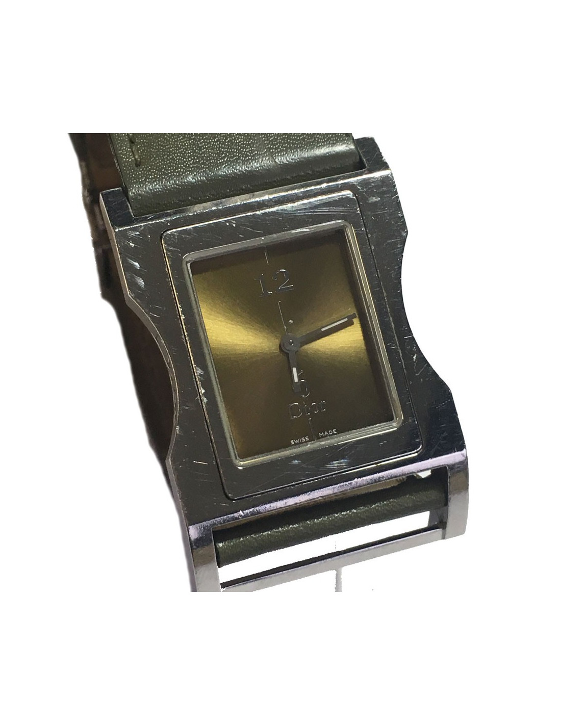 Montre DIOR homme carré en acier et bracelet en cuir kaki. Couleur du cadran: or. Mouvement à quartz. Boucle argentée déployante.