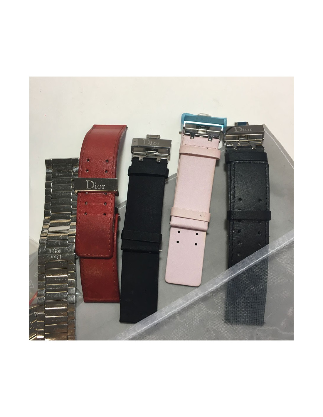 Livrée dans son écrin DIOR avec 5 bracelets de rechange (4 en cuir et 1 en acier) dans leur pochon