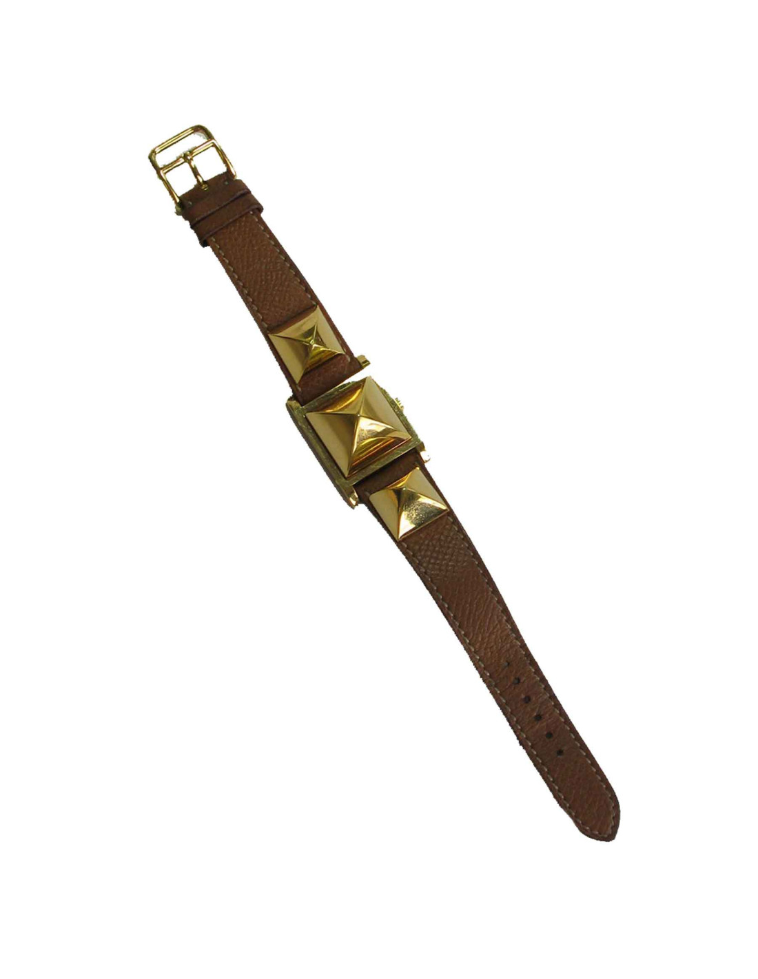 Montre Médor Hermès PM en plaqué or, bracelet en cuir grainé gold. Cadran doré opalin, mouvement quartz.