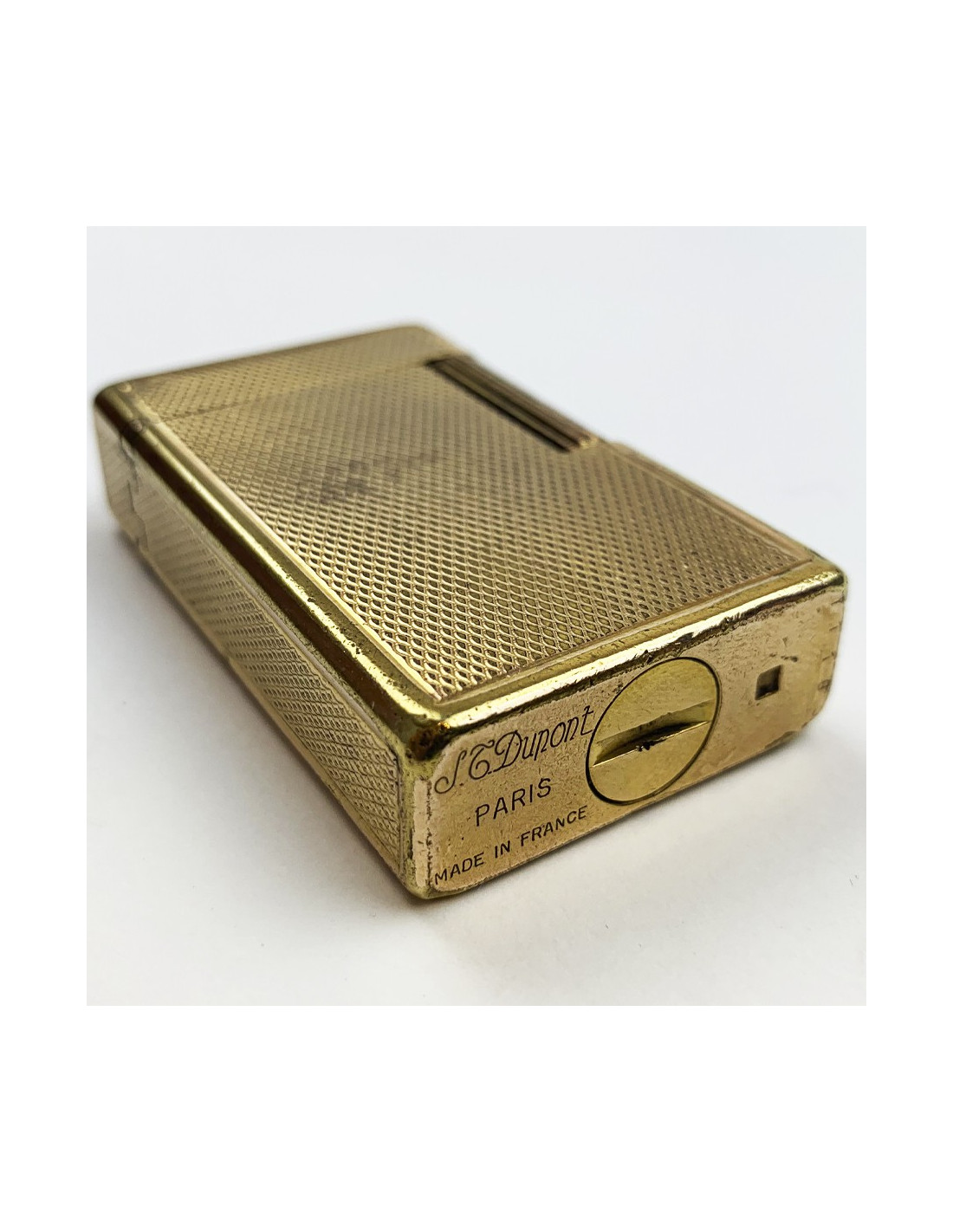 Le briquet est en bon état. Marques sur la dorure de chacune des faces mais rien qui n'enlève au look du briquet (cf photo). Ceci dit, il faudra changer la pierre et l'alimenter en gaz. Il mesure 5.5 centimètres de hauteur pour 3.3 centimètres de largeur. Présence de la pastille de la marque et de la mention Made In France.