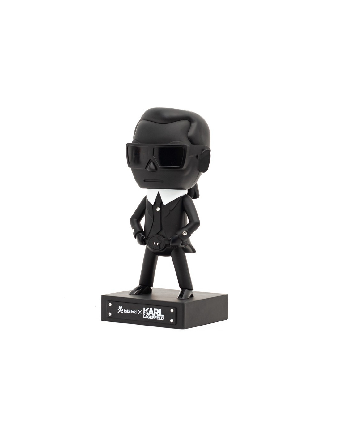 Association avec la marque italienne TOKIDOKI pour représenter Karl Lagerfeld fidèle à son style : chemise blanche col cheminée, veste et lunettes de soleil, le tout noir mat et col blanc.