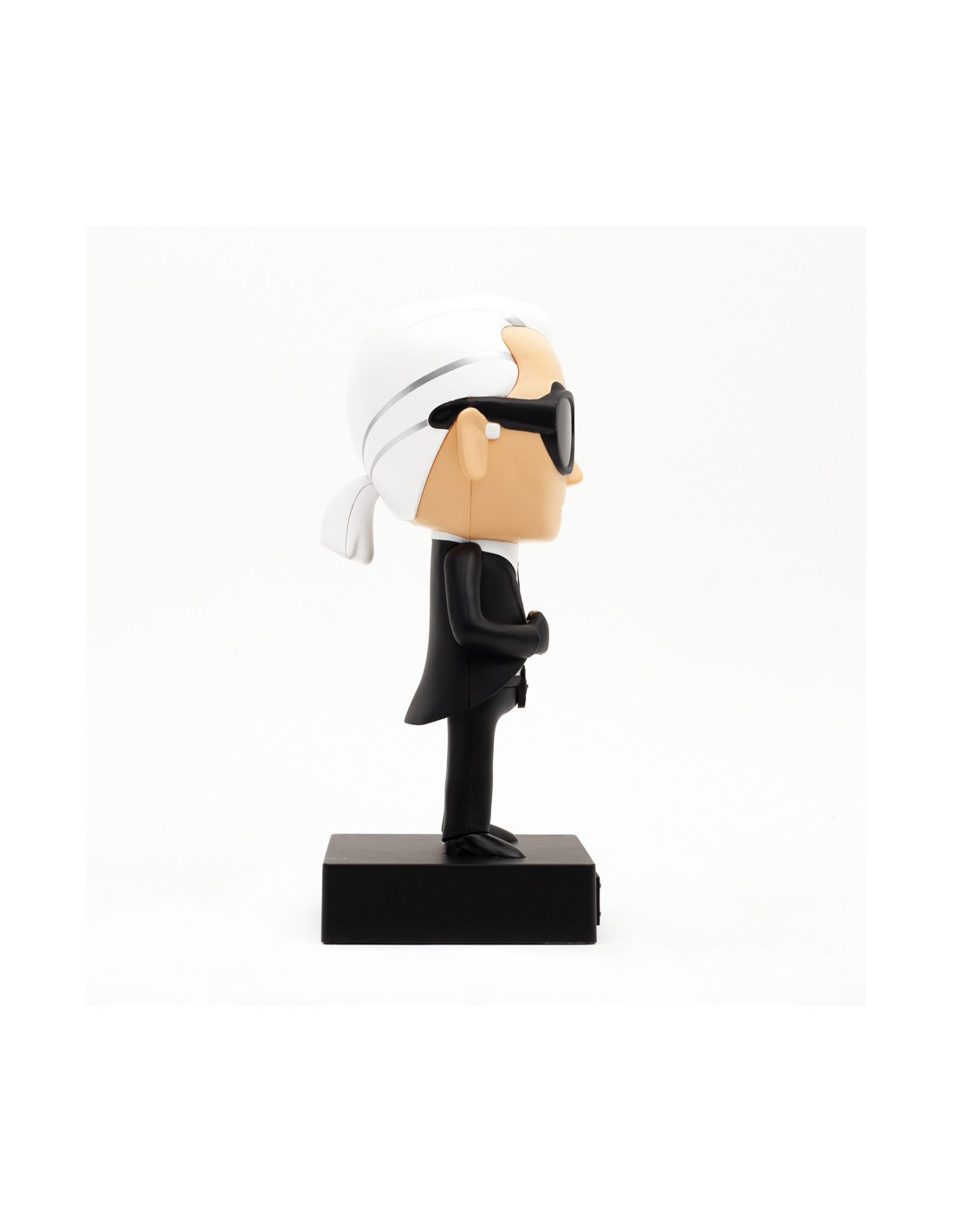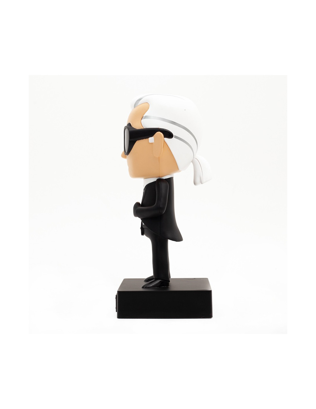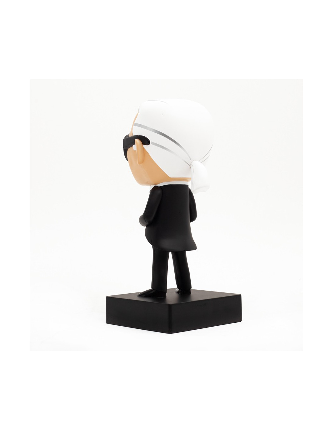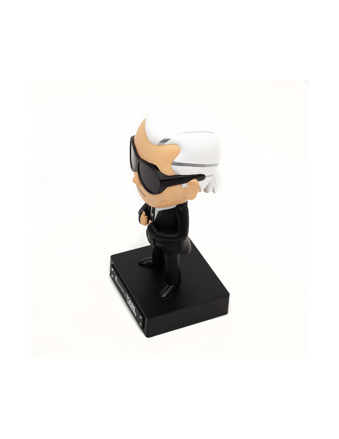 La marque s'inspire de l'univers du dessin animé pour créer ses figurines. Karl Lagerfeld s'éloignait rarement de son style vestimentaire, avec sa chemise blanche immaculée et sa veste cintrée et la 'incontournable paire de lunettes de soleil qui ont forgé son style iconique. Cette figurine est une parfaite copie de son look.