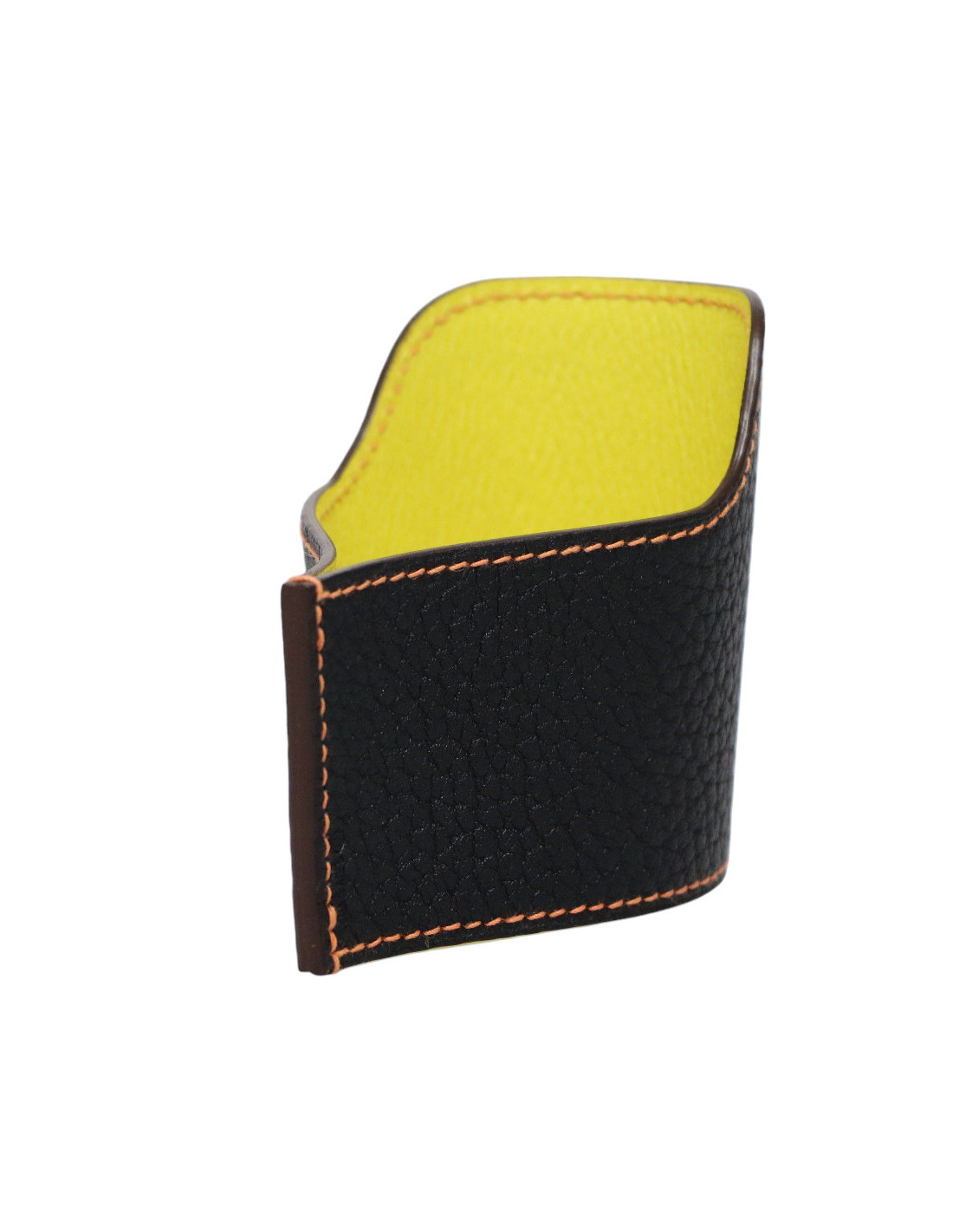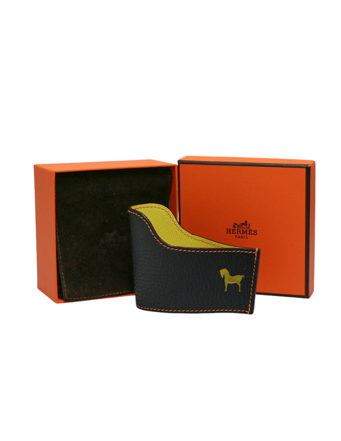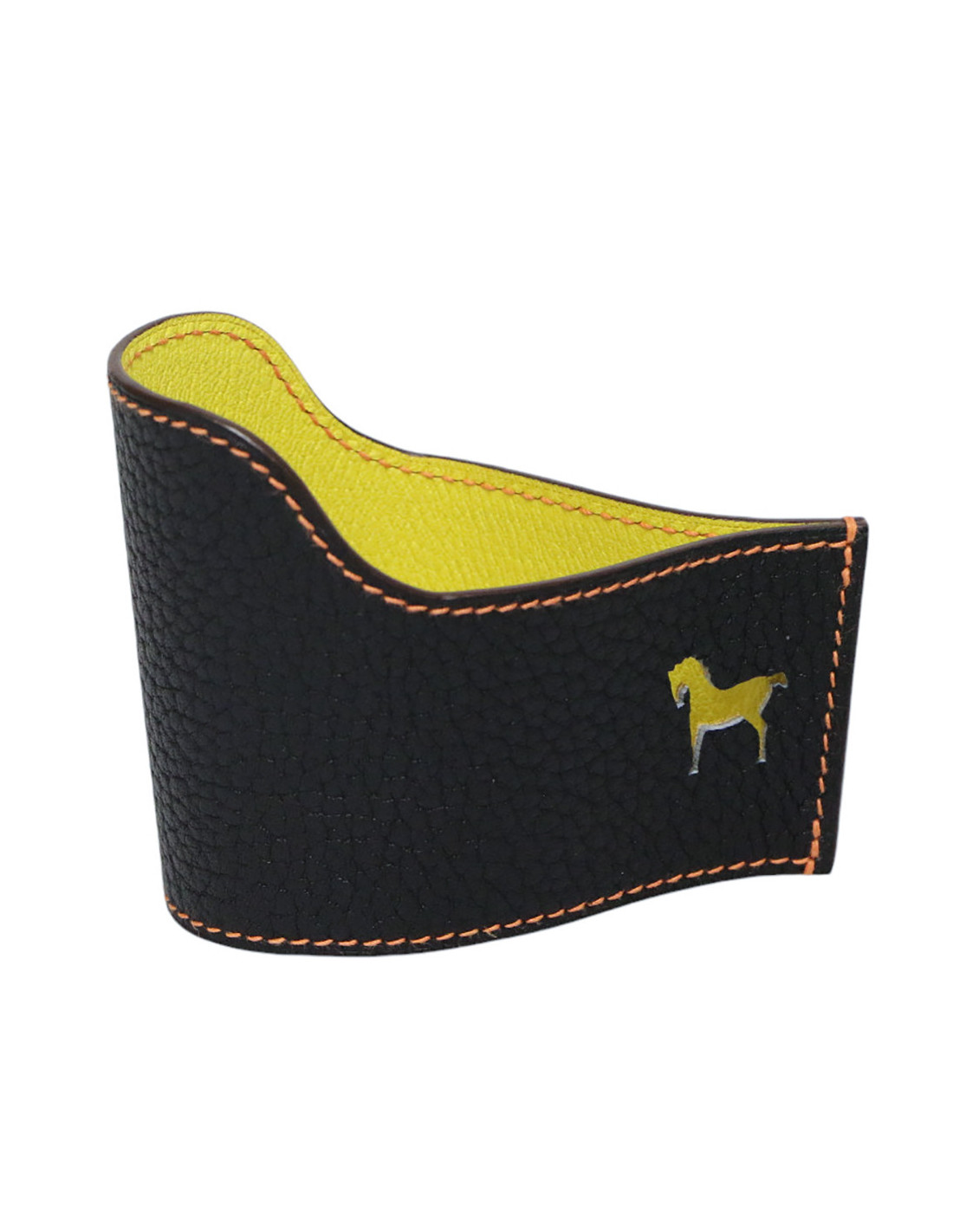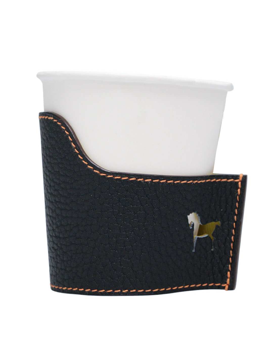 Détails : porte gobelet en cuir grainé bleu marine et couture orange, l'intérieur est en cuir grainé jaune. Sur un côté, le cuir est perforé en représentant un cheval.
