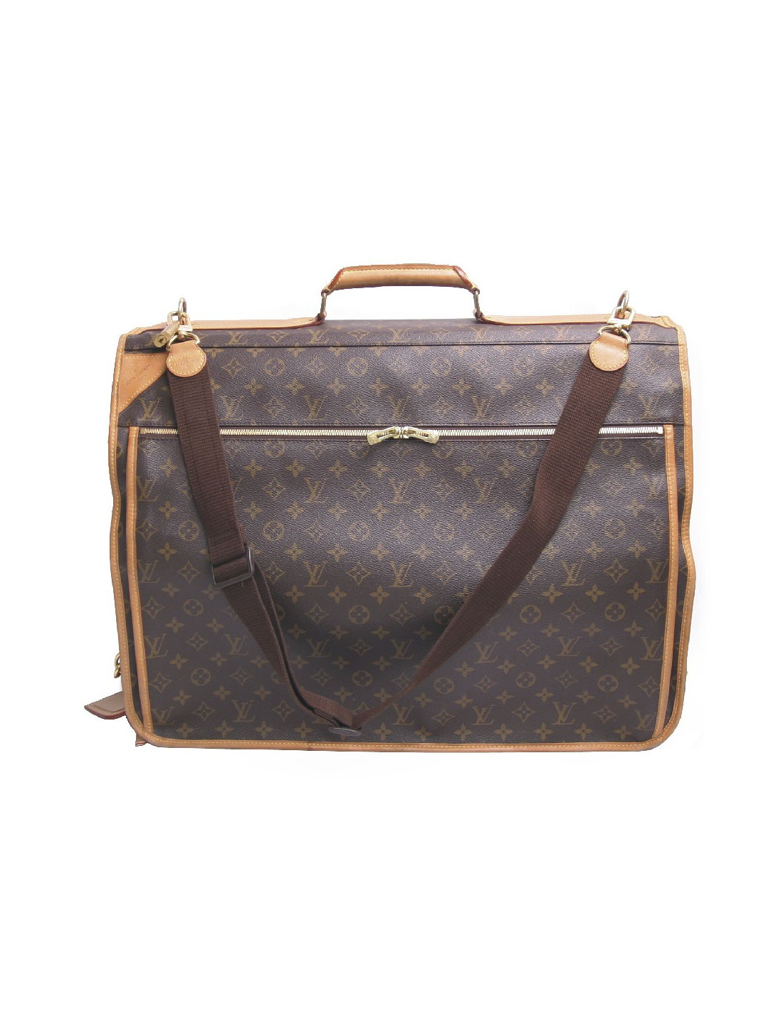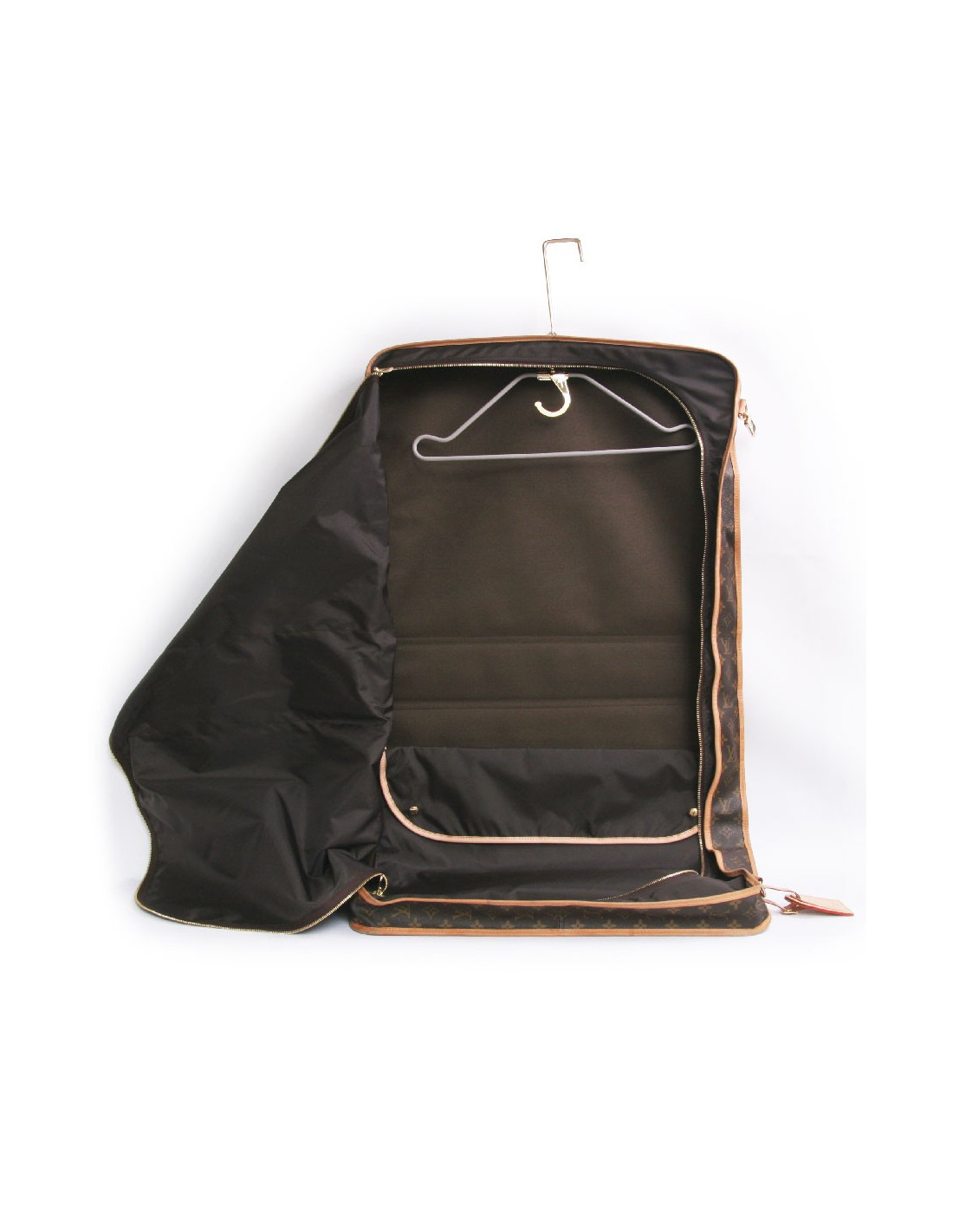 L'accessoire indispensable pour voyager avec style grâce au Porte habits Louis Vuitton en toile Monogram emblématique. Il combine un système de penderie avec un ceintre robuste et un espace intérieur spacieux pour vos accessoires, chaussures, chuassettes, etc. Les finitions sont en cuir de vache. Les pièces métalliques en laiton doré. Poignée en cuir et bandoulière amovible et ajustable. Porte-adresse en cuir amovible. Fermeture zippée intégrale. Doublure en toile. En très bon état. Les coins sont légèrement usés. Prix public: 1440 euros