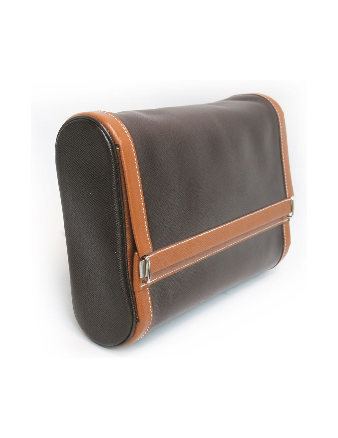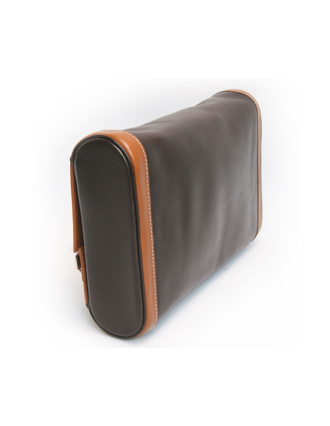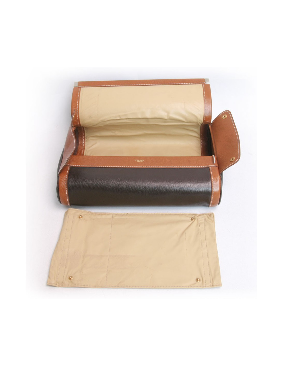 Trousse de toilette Hermès en toile et cuir marron et gold . En bon état. Légères traces à l'arrière ainsi que sur le rabat à l'intérieur, usure du cuir au niveau de l'ouverture. Voir photos.