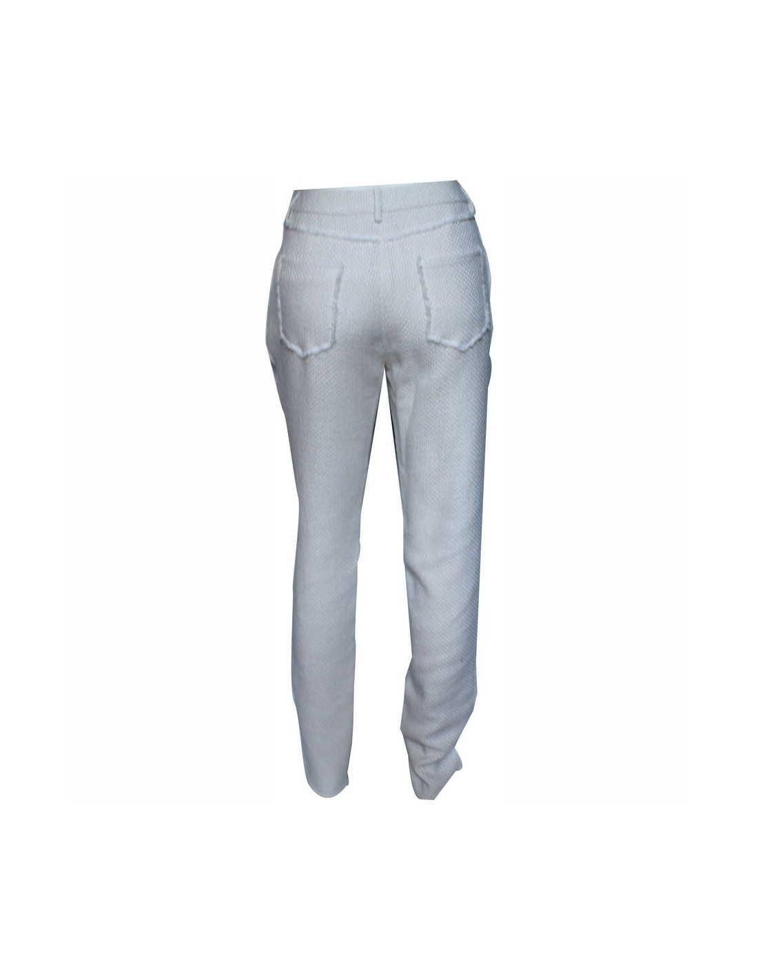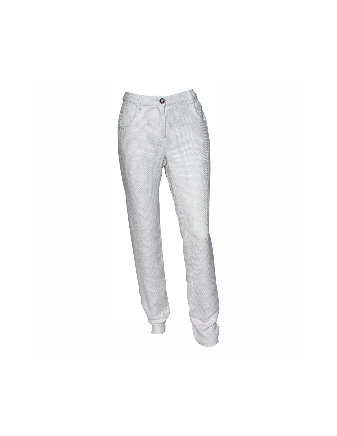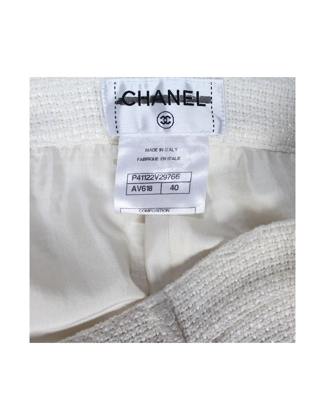 Sublime pantalon Chanel, en tweed de coton blanc taille 40. Il est entièrement doublé de soie. Il y a deux poches à l'avant et deux poches à l'arrière du pantalon. Une élégante frange courte est sur les extrémités de la longueur. Un élégant bouton bijou CC argenté ferme le pantalon. État impeccable, sort du teinturier.