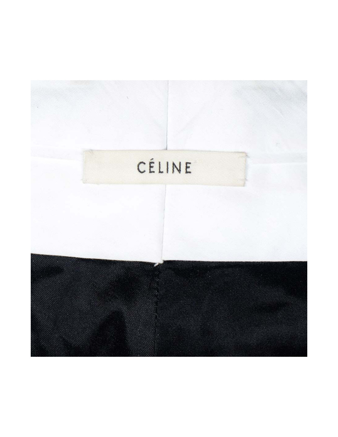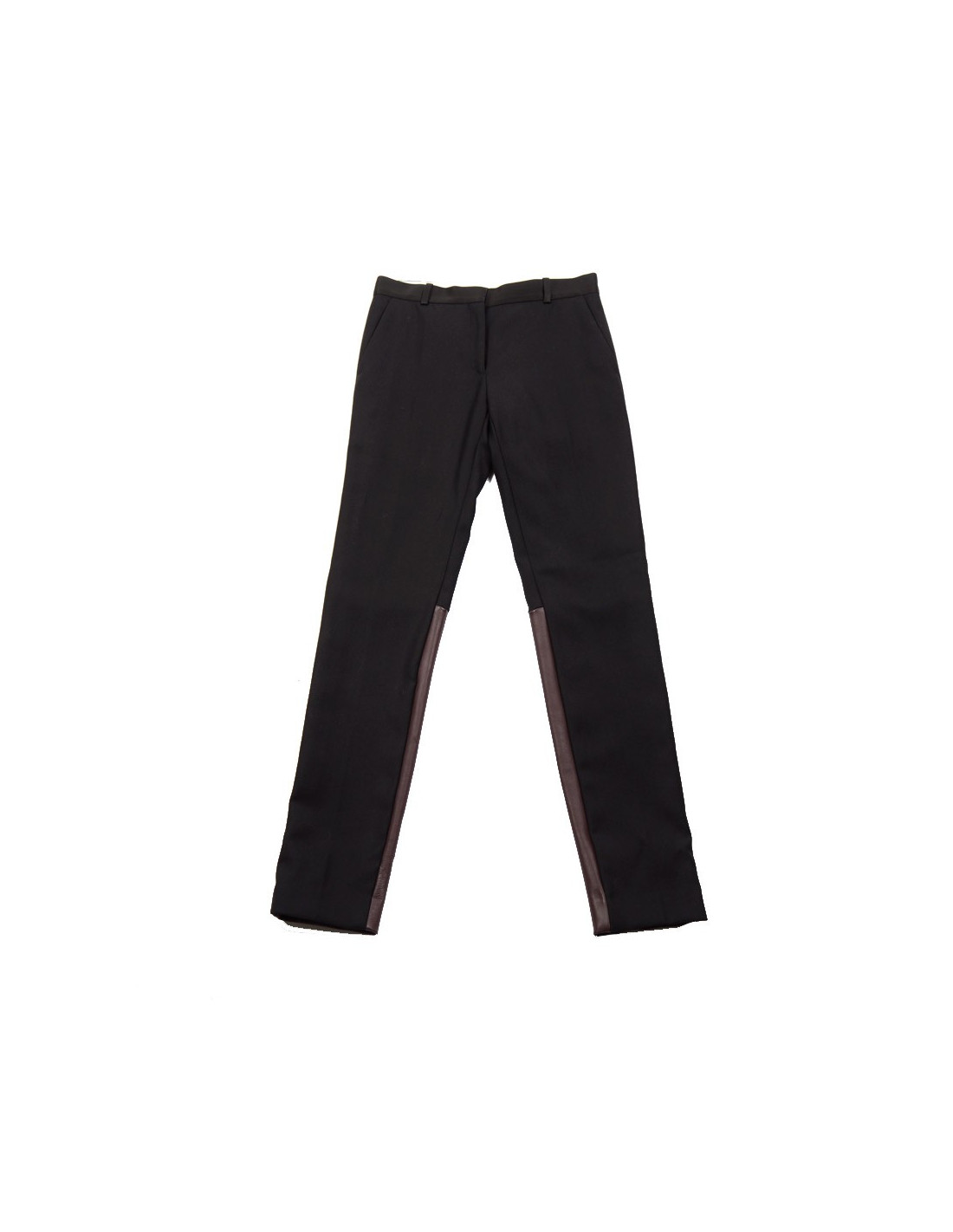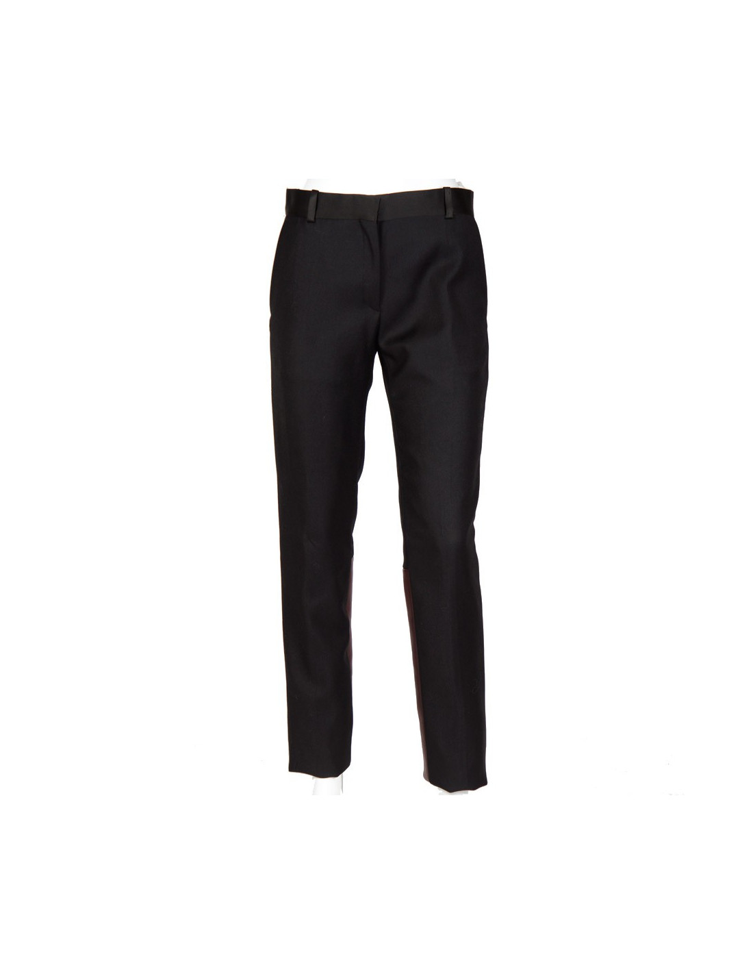 Pantalon Céline en laine de couleur noir et cuir d'agneau bordeaux au dos en bas du pantalon. 2 poches sur le devant du pantalon + 2 fausses poches à l'arrière du pantalon. Le pantalon se ferme par fermeture zippée, par fermeture à crochet et par fermeture à boutons, possibilité de rajouter une ceinture.Taille 36. Etat neuf.