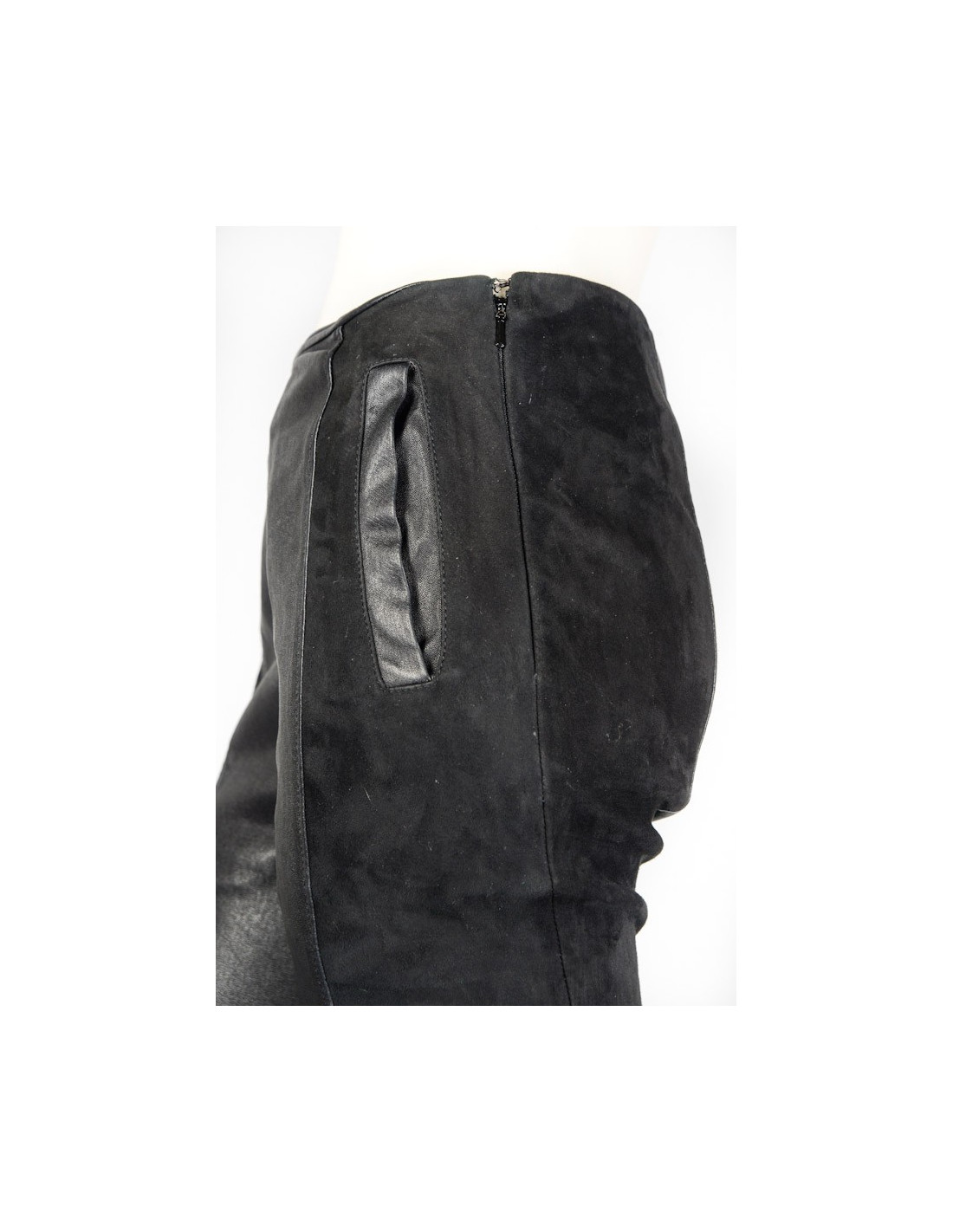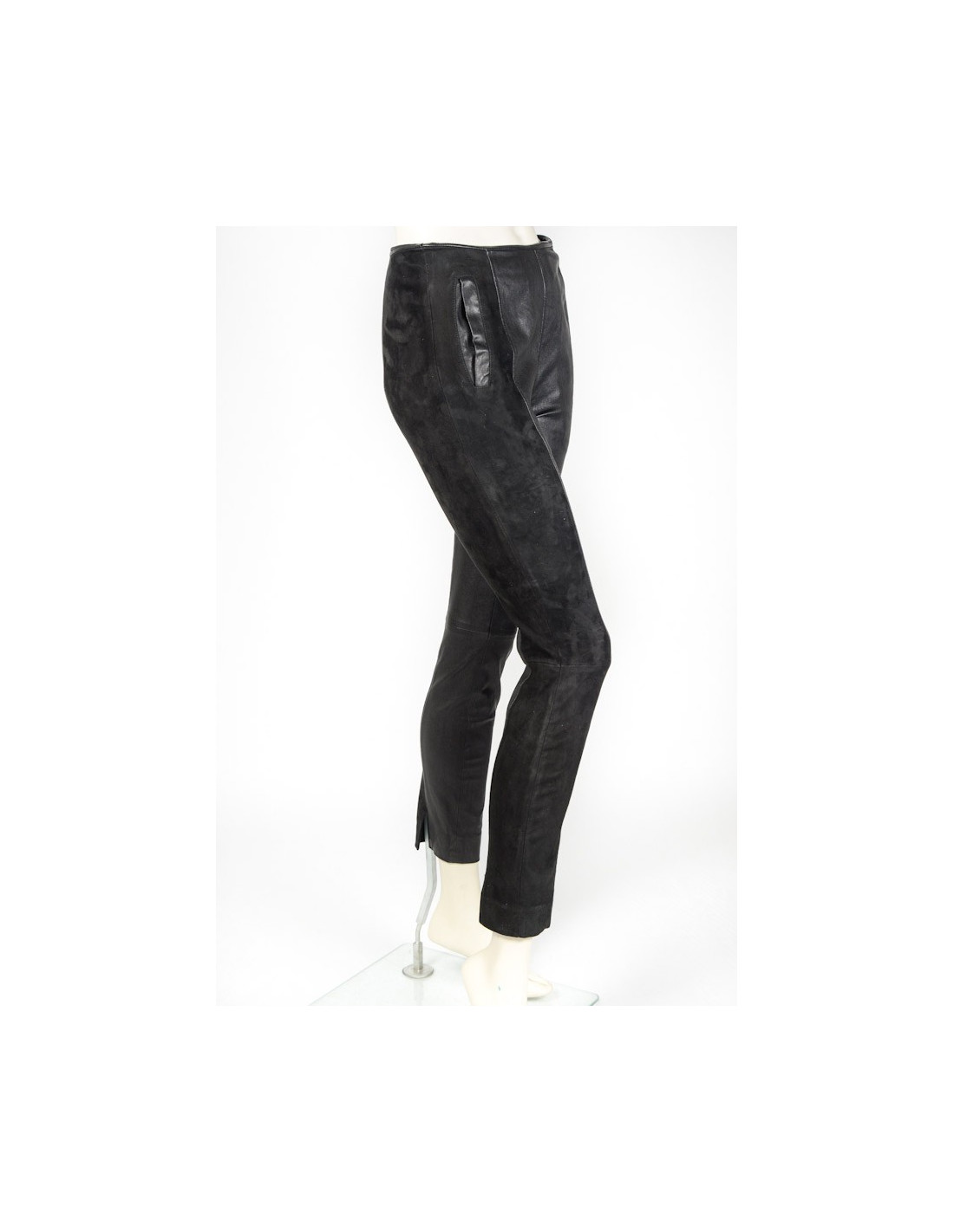 Fermeture zippée sur le côté. Taille 34. coupe cigarette. Le haut et l'entrejambe sont en cuir d'agneau et l'extérieur en veau velours. En très bon état.