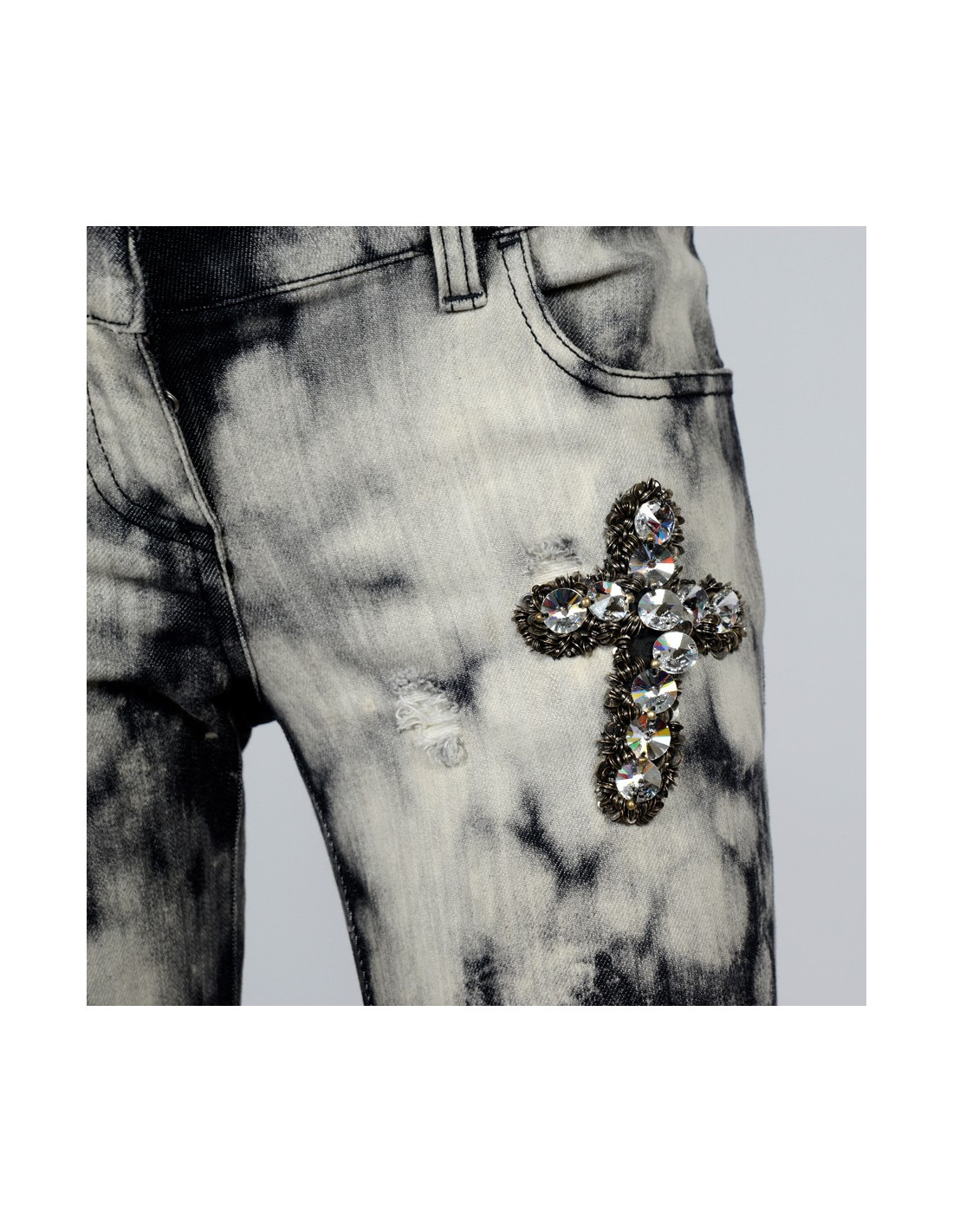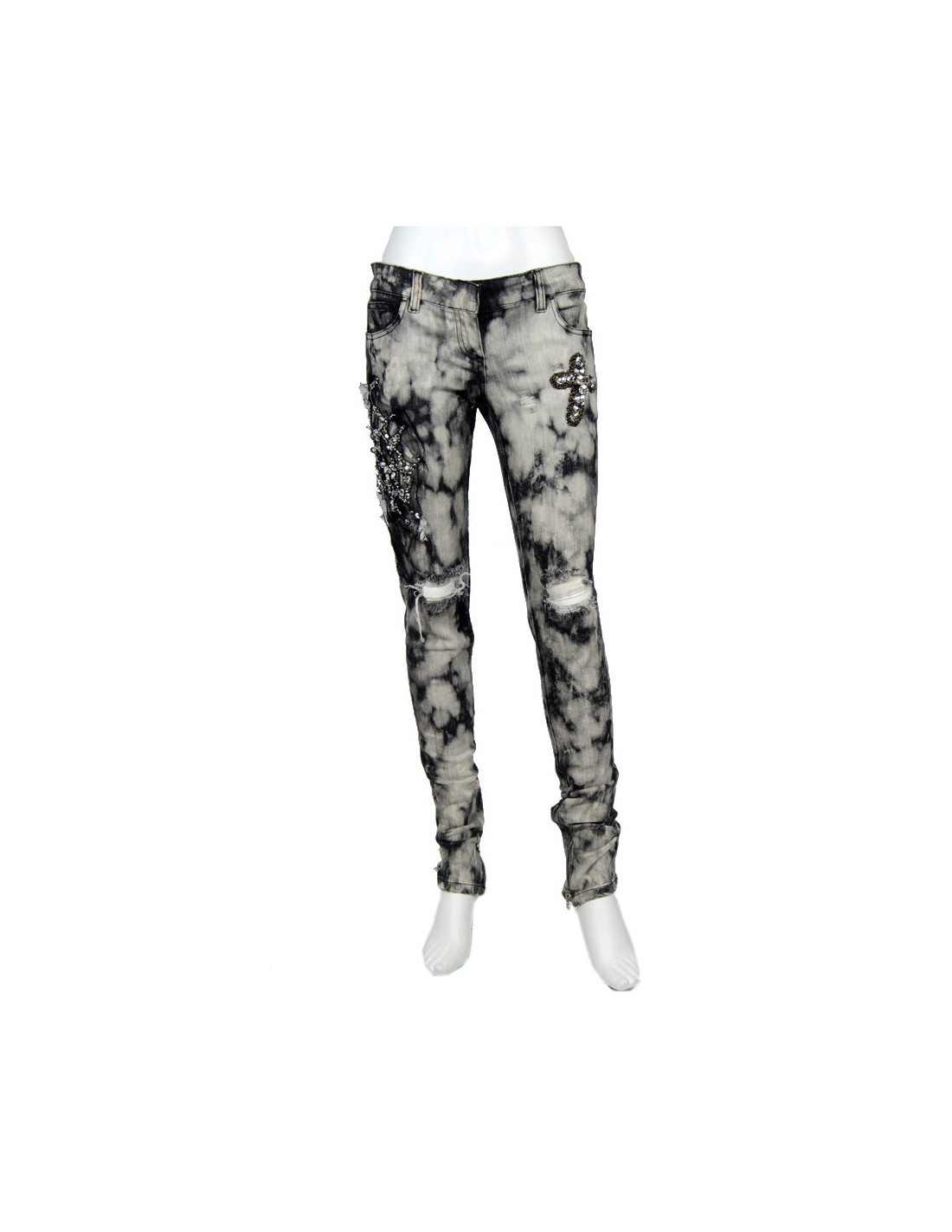 Jean's Balmain tye and dye bleuté. Pantalon délavé avec broderies sur les côtés strassés. Fermeture en zip sur la cheville.
