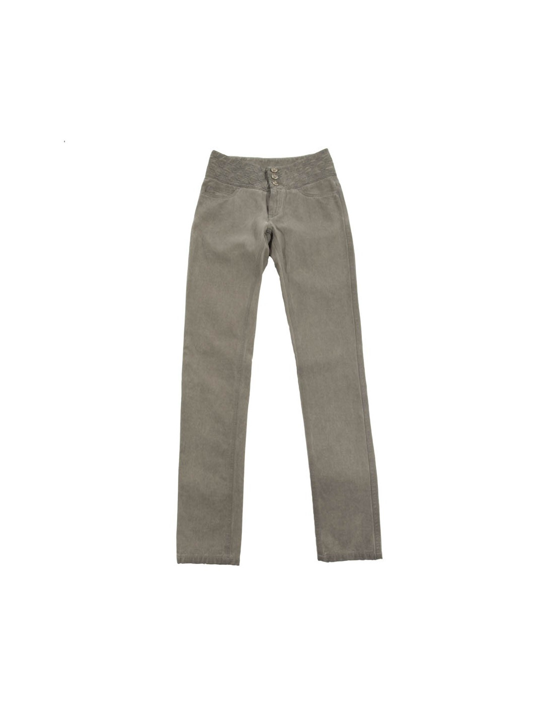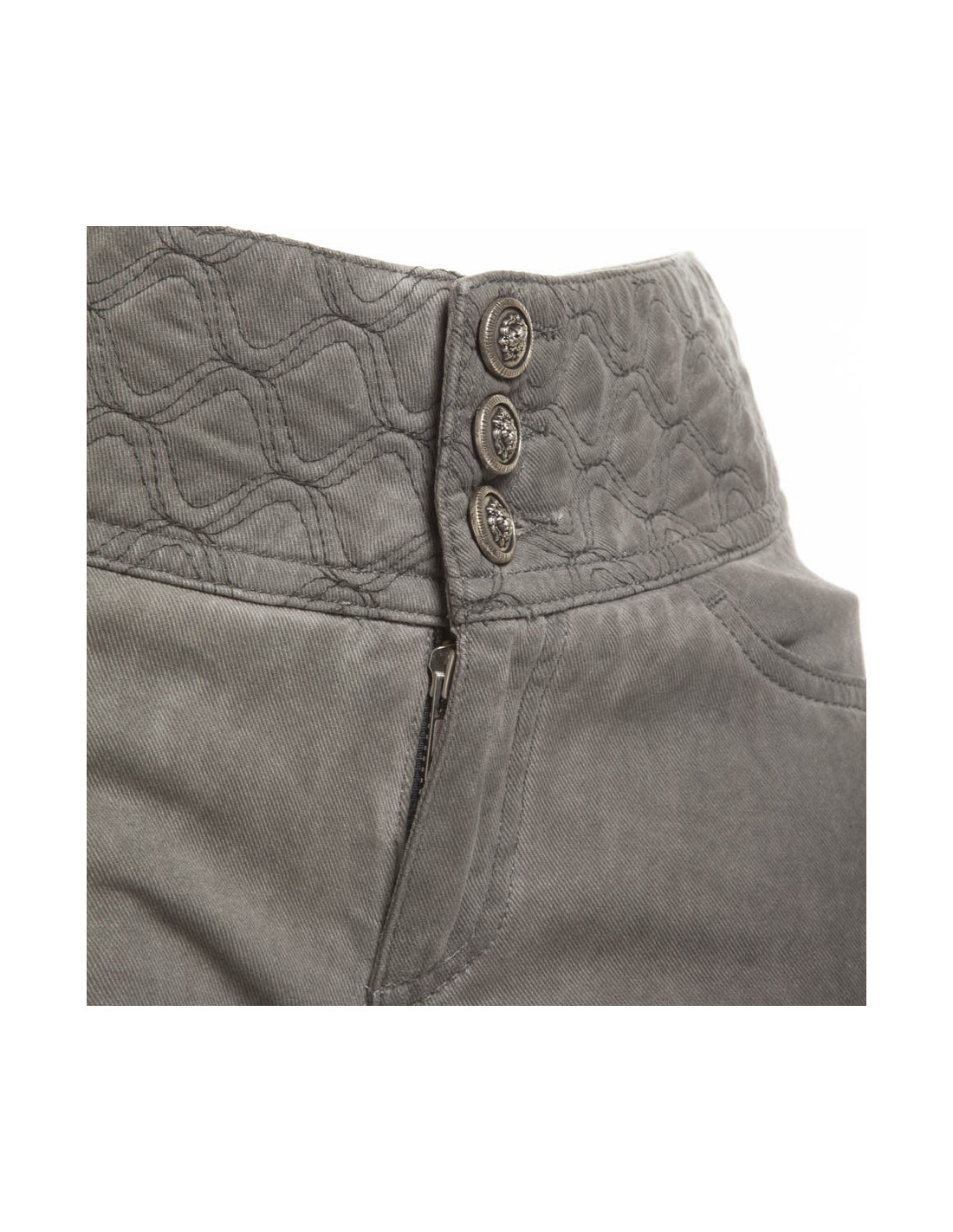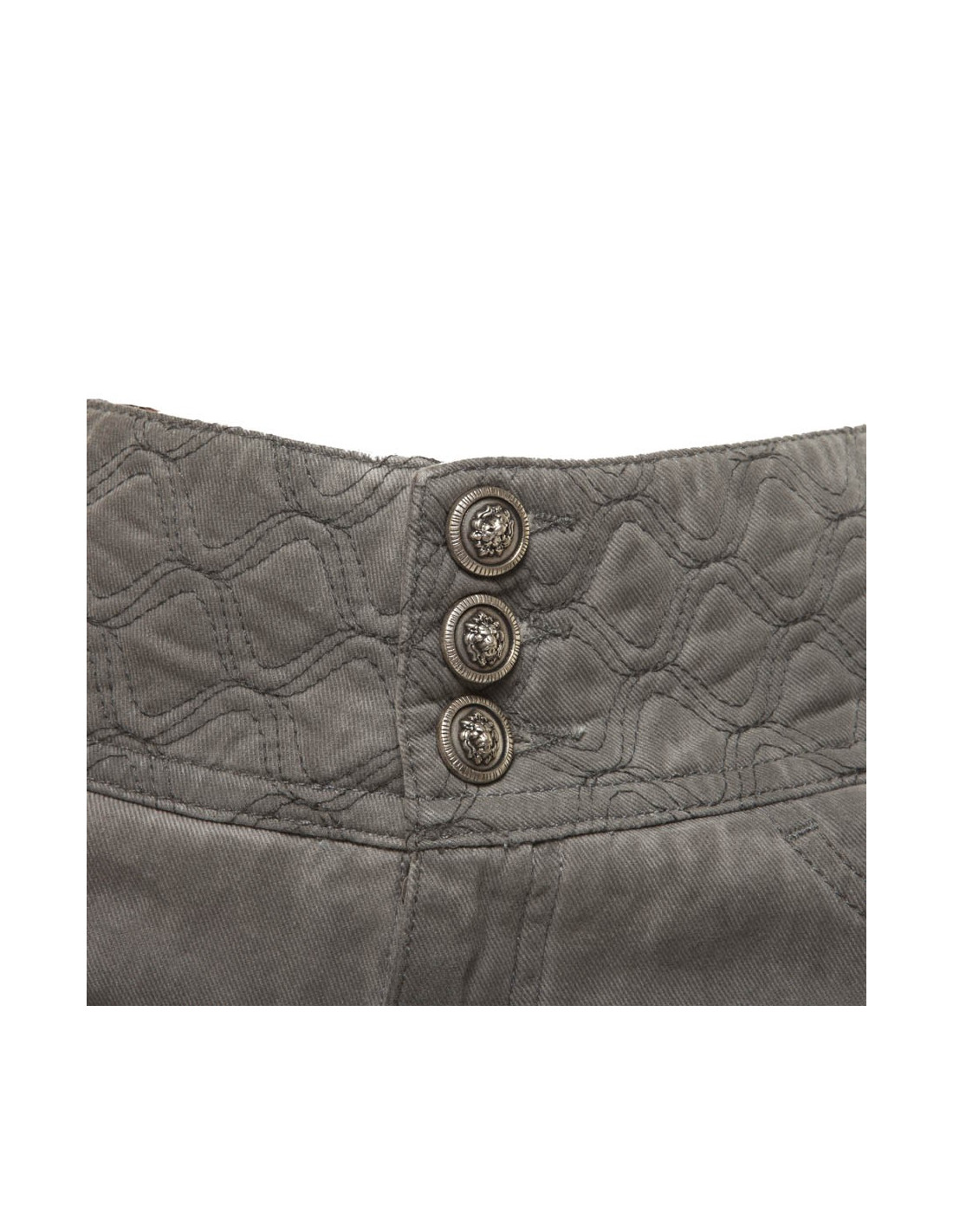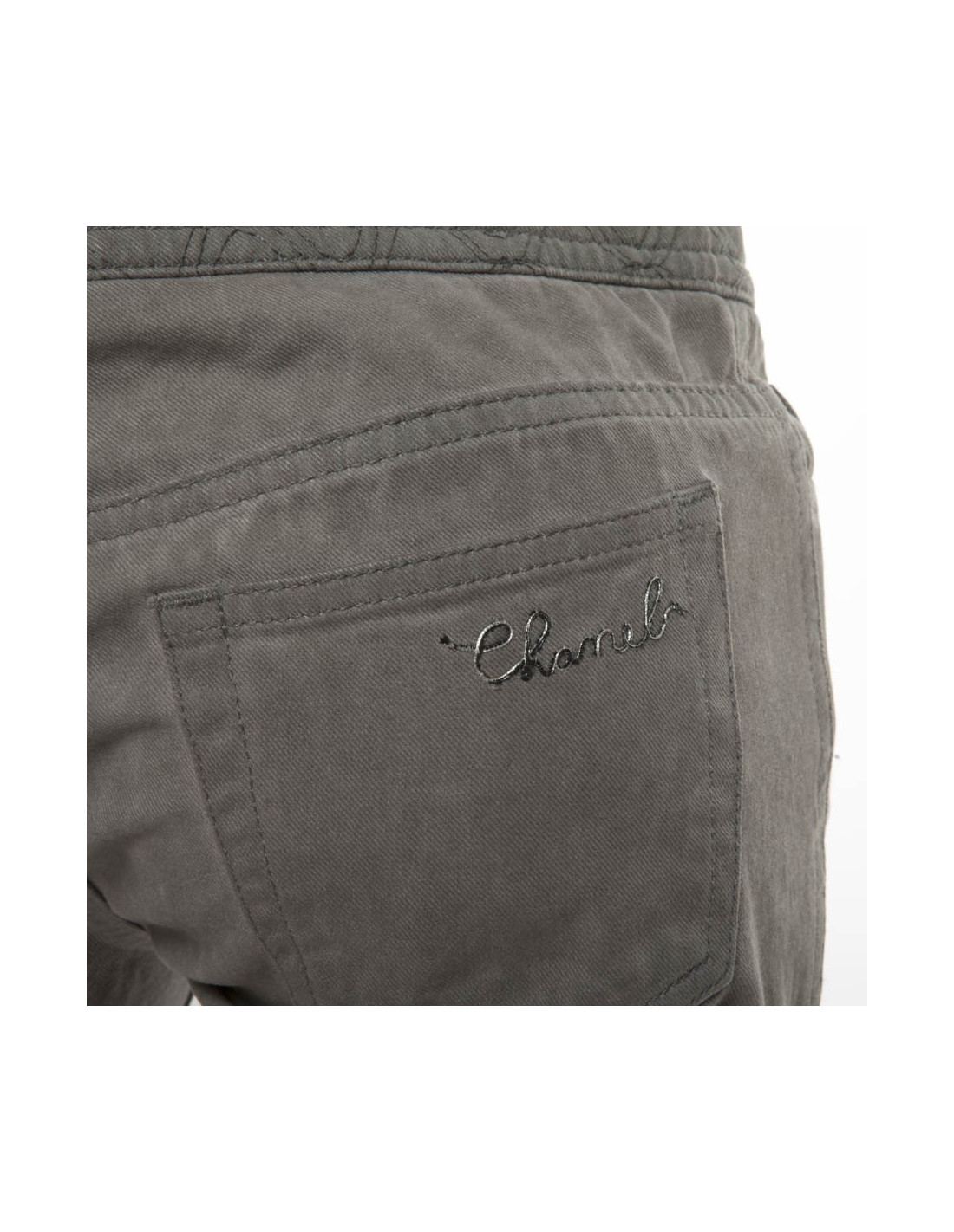 Pantalon jeans Chanel en toile de coton gris taille 36 issu du prêt-à-porter hiver 2010. Deux poches à l'avant et l'arrière du pantalon, il se ferme par fermeture zippée mais également par trois beaux boutons argent tête de lion, emblème de chez Chanel.