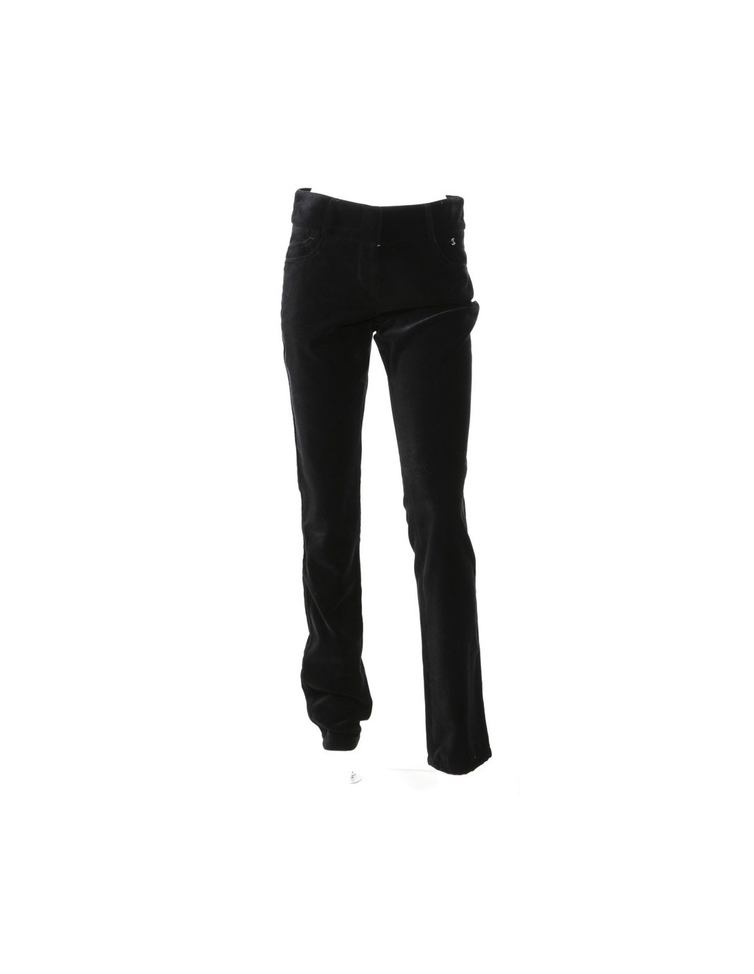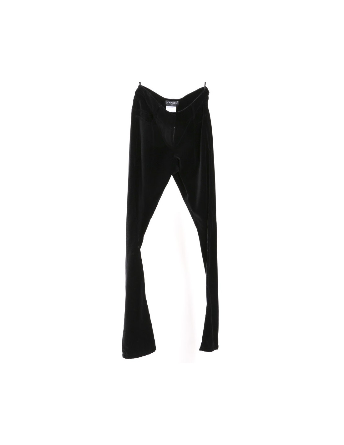 Sublime pantalon Chanel en coton touché velours noir, issu du prêt-à-porter automne 2004. C'est une taille 36. Le pantalon est muni de trois poches à l'avant, il se ferme par fermeture zippée et deux boutons crochet. Il est en très bon état. (recoudre le sigle CC au dessus du pantalon)