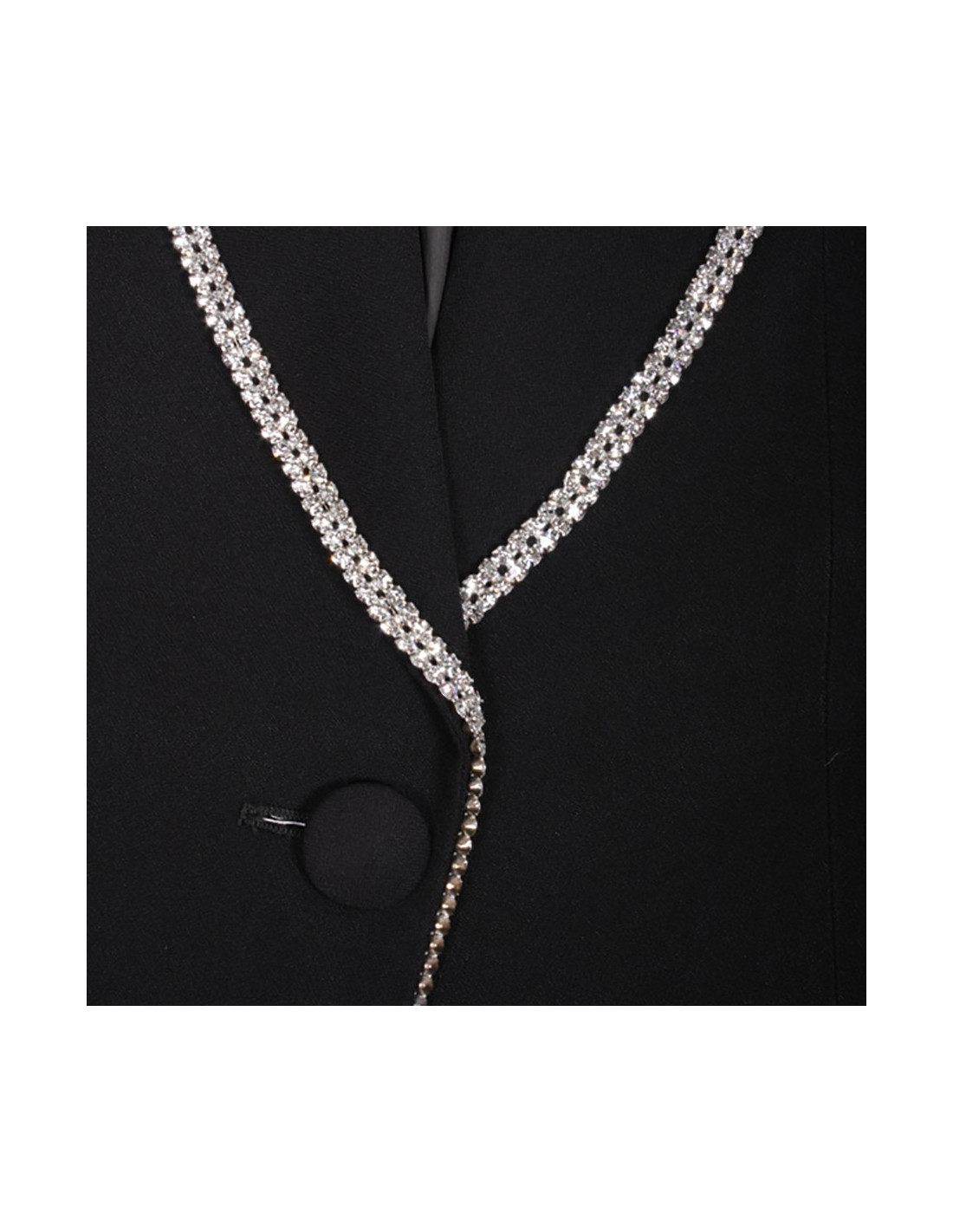 La veste se ferme a l'aide un grand bouton du même tissu et possède 2 poches a revers sur les côtés.
