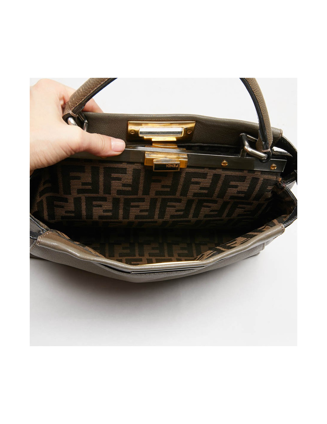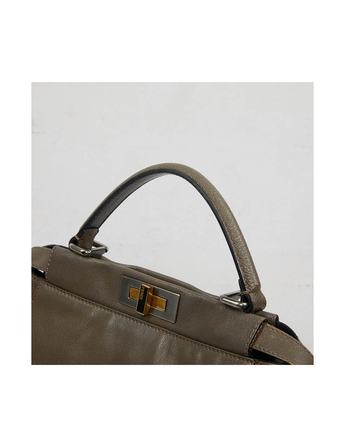 Porté par les strars. Sac classique de chez Fendi, ce sac Peekaboo est en cuir grainé taupe. Il a deux grands soufflets de rangements dont un avec une poche zippée. L'intérieur est en toile monogramme "FF" marron. La bijouterie est bicolore, argent et or. Il se porte à l'épaule ou à la main. La couleur du cuir de la poignée à certain endroits est passée. Les coins se sont patinés avec le temps. Une décoloration est visible sur le cuir coté gauche.