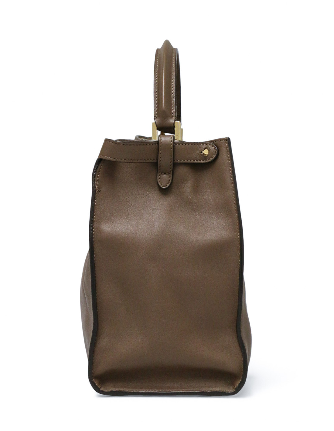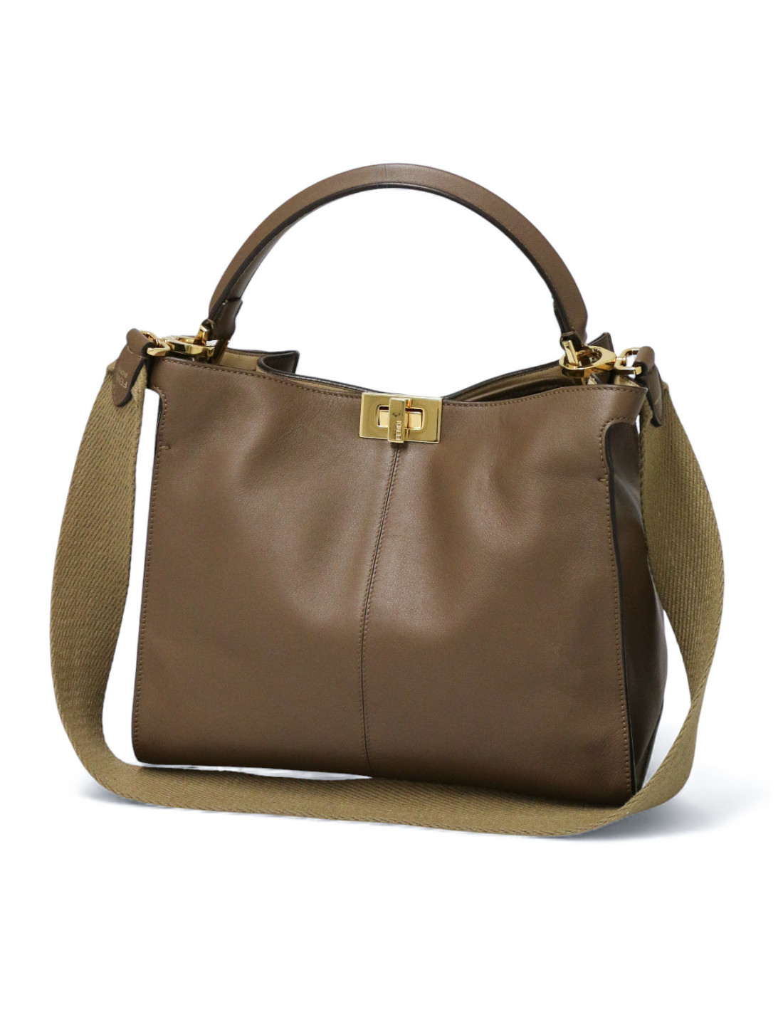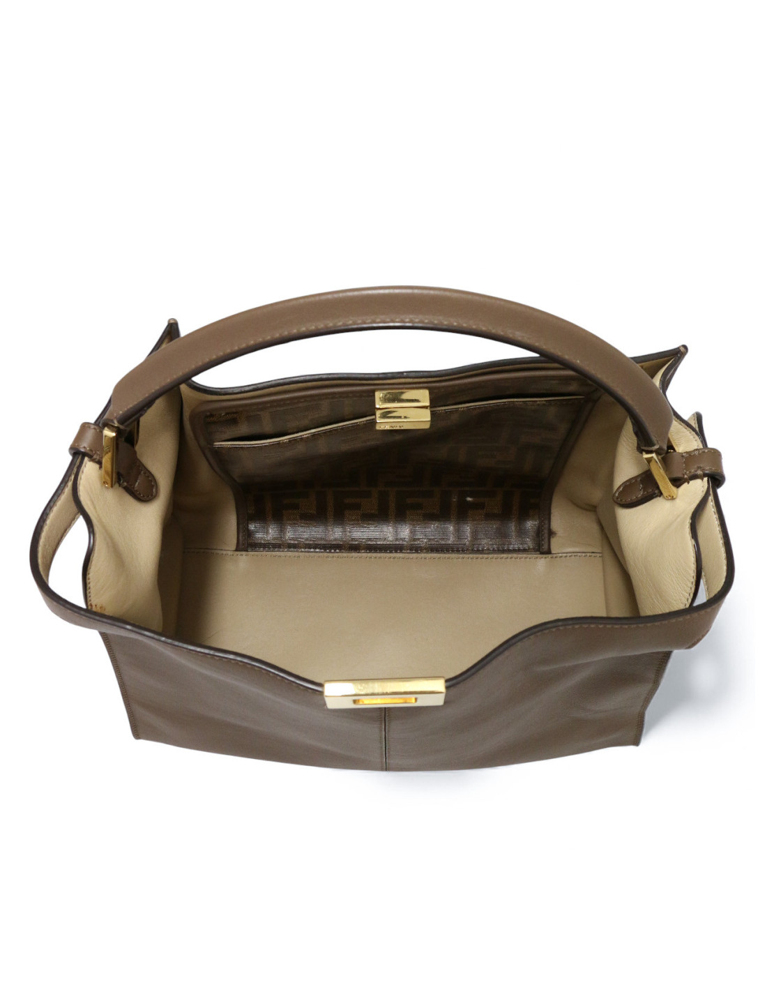 Détails : sac en cuir souple "Cuoio Romano" taupe fermé par l'emblématique twist lock. Il a une petite poche intérieure en cuir avec l'iconique imprimé jacquard FF. De légères traces à l'intérieur. Livré avec son protège pluie et instruction d'entretien.