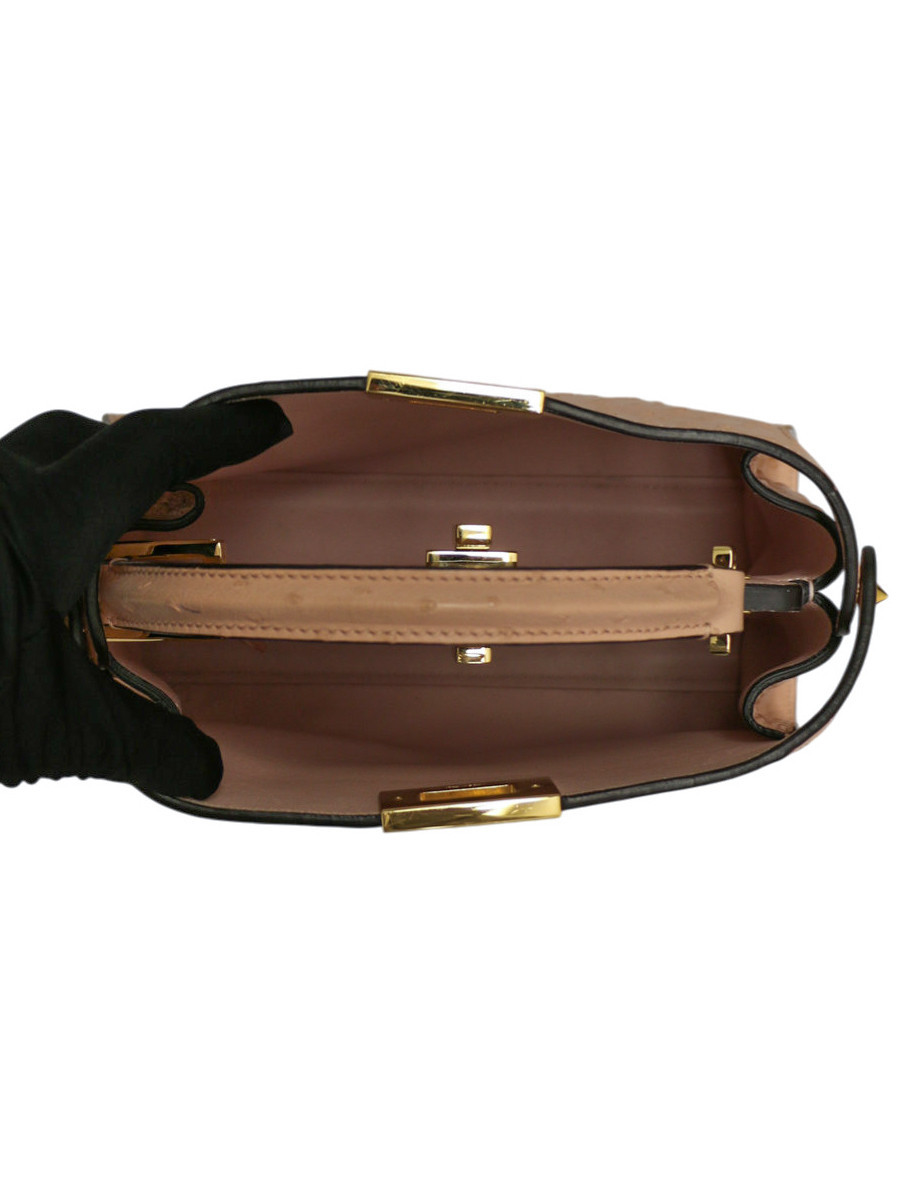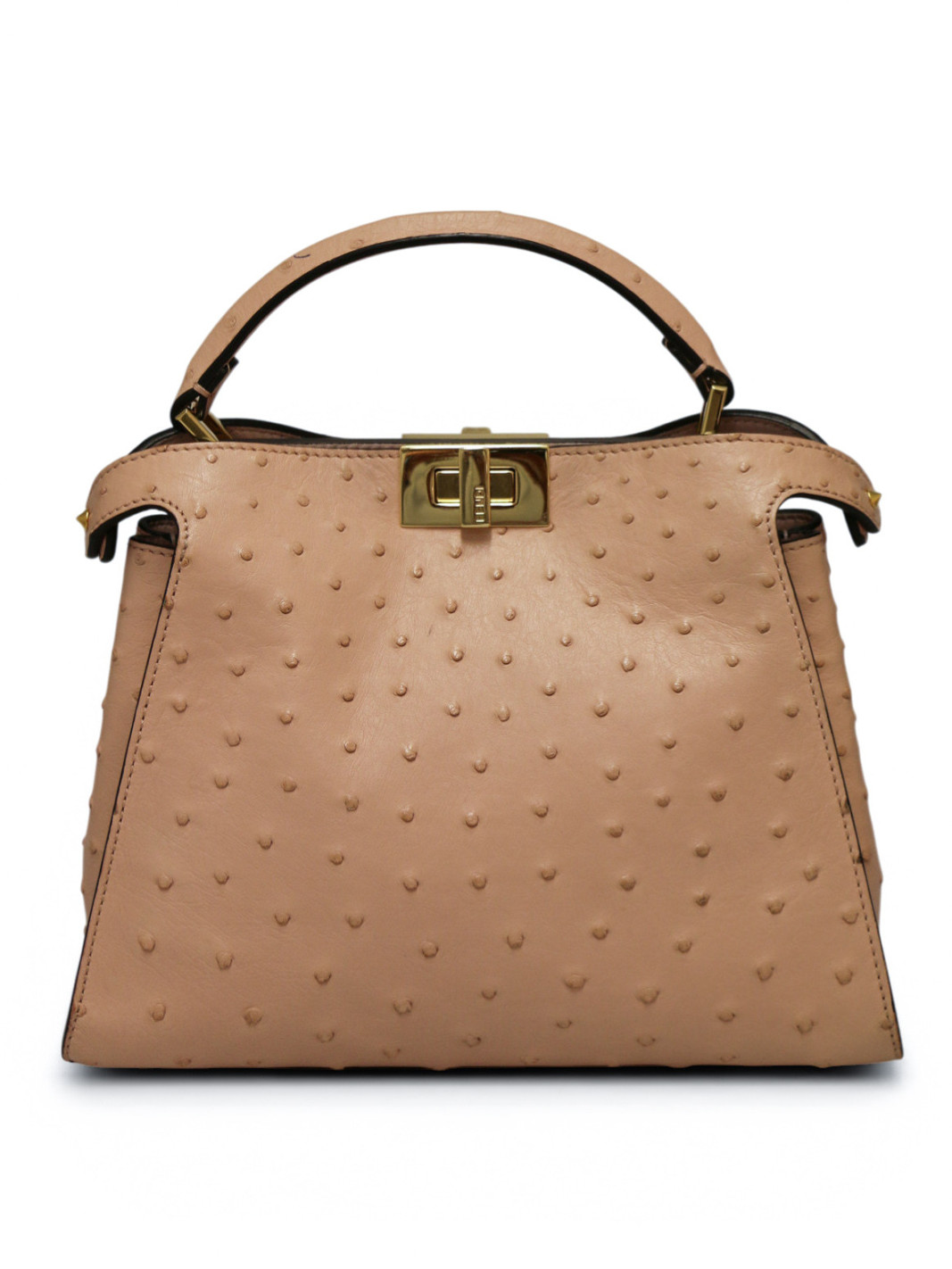 Découvrez l'élégance intemporelle avec sac Fendi Peekaboo Small, confectionné en cuir d'autruche rose poudré. Sa silhouette emblématique, reconnue pour sa structure sophistiquée et son design polyvalent, en fait une pièce iconique de la Maison Fendi.