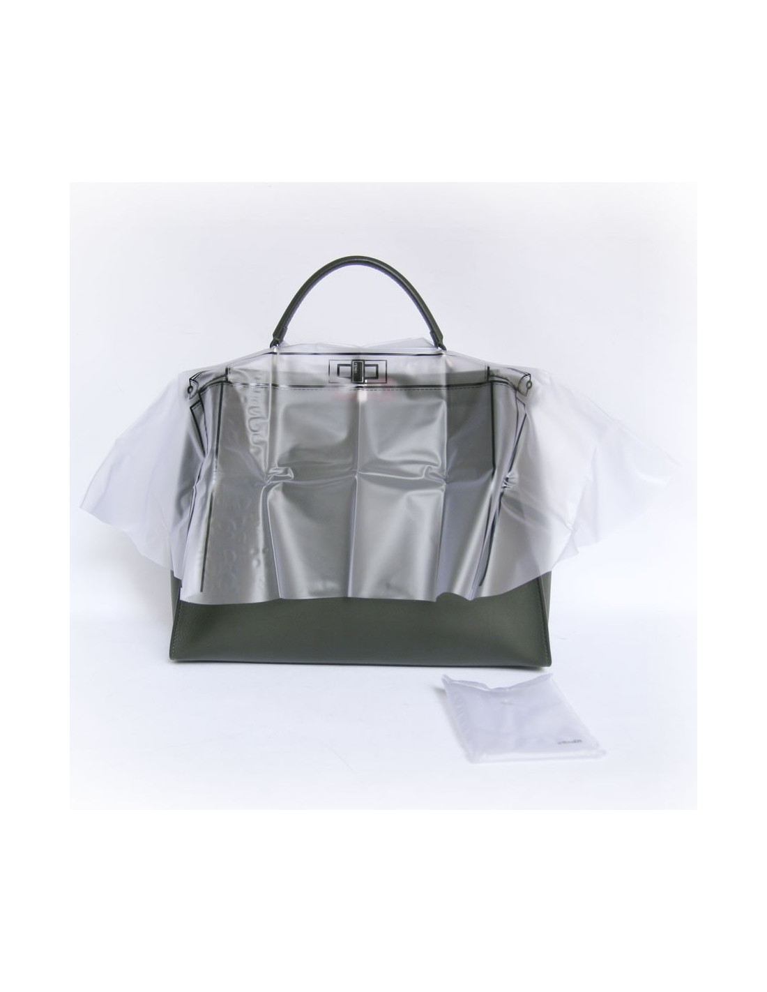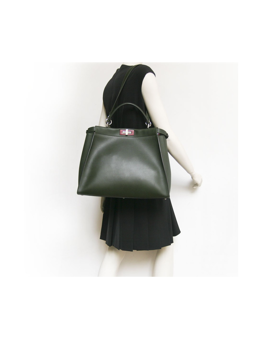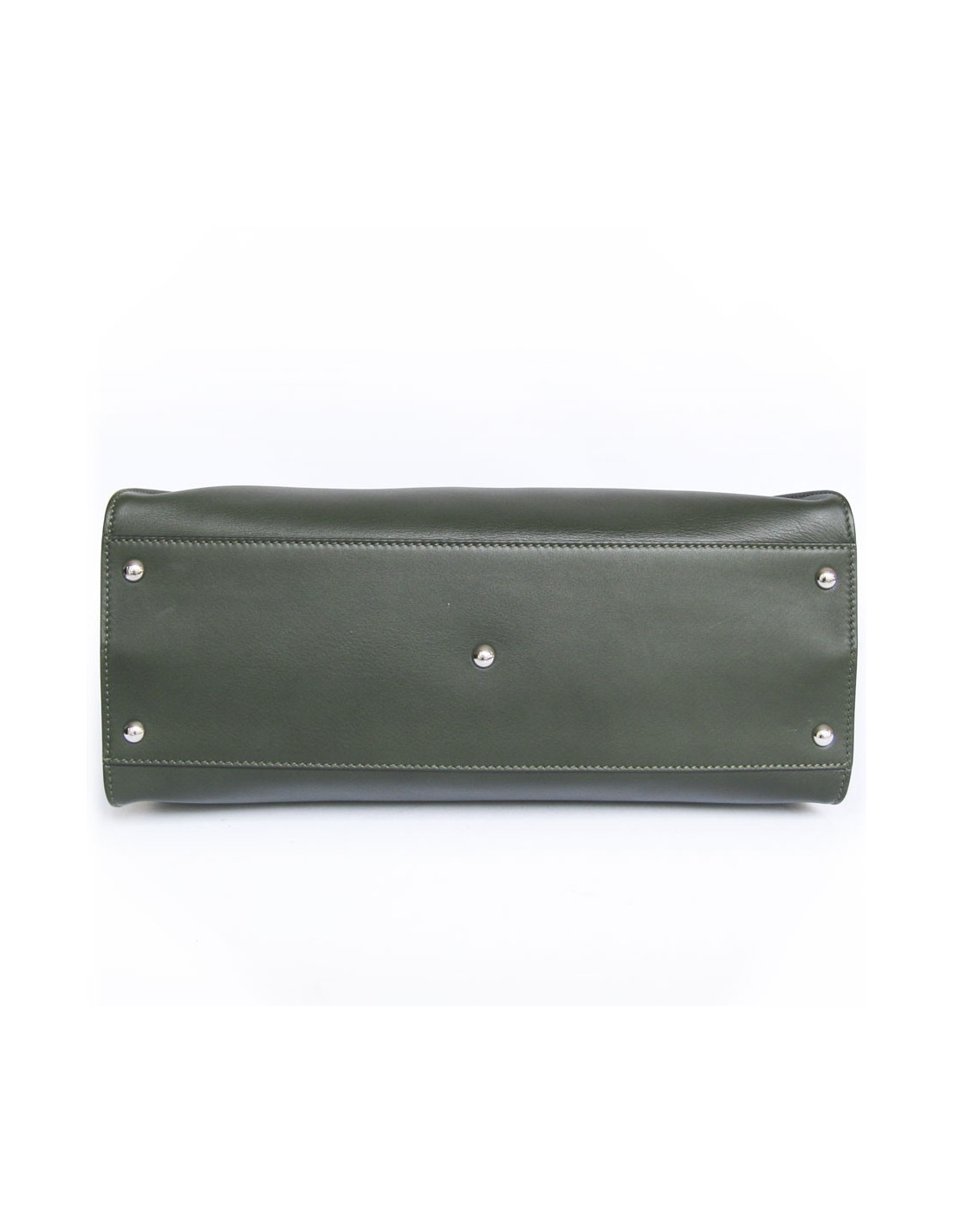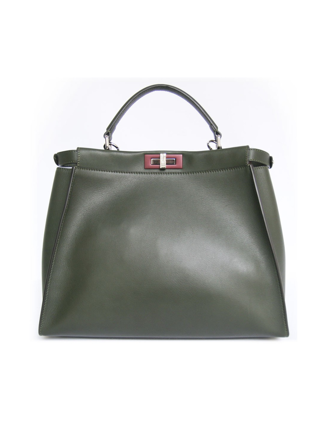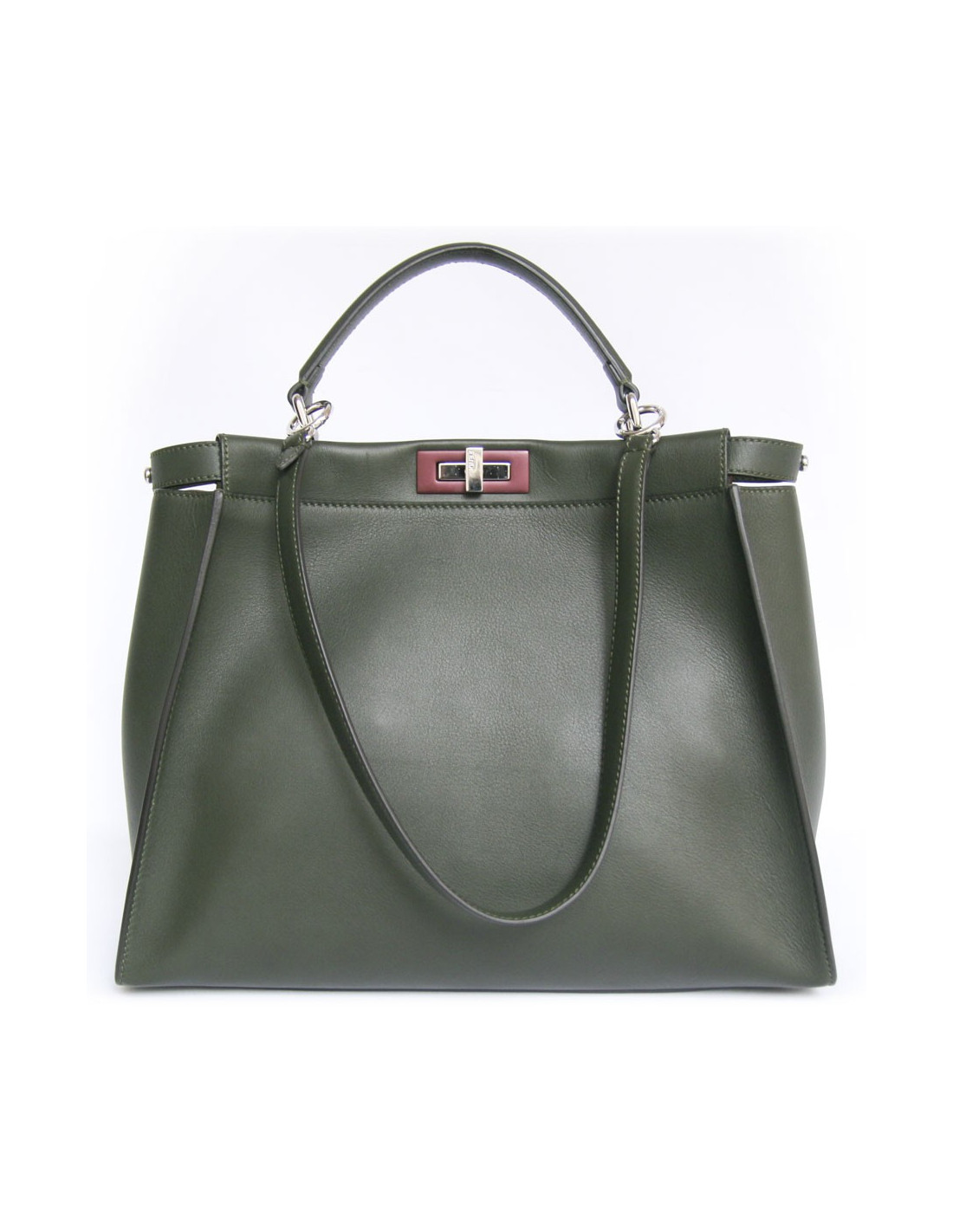 Sac Peekaboo de la Maison Fendi en cuir d'agneau vert kaki. L'accastillage est en métal argenté. L'intérieur est en veau velours bleu marine et cuir bordeaux. Il dispose de deux compartiments séparés avec une poche zippée. Il se porte à la main à l'aide d'une poignée et également à l'épaule grâce à une bandoulière amovible. Il sera fourni avec un sac de pluie. En très bon état.