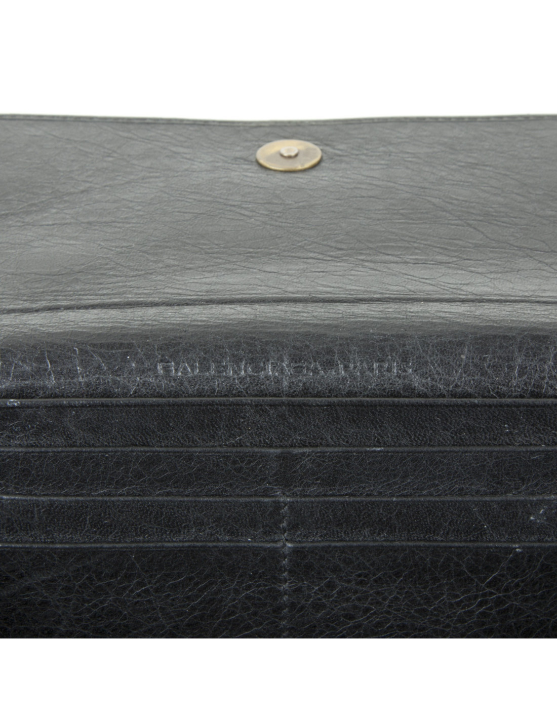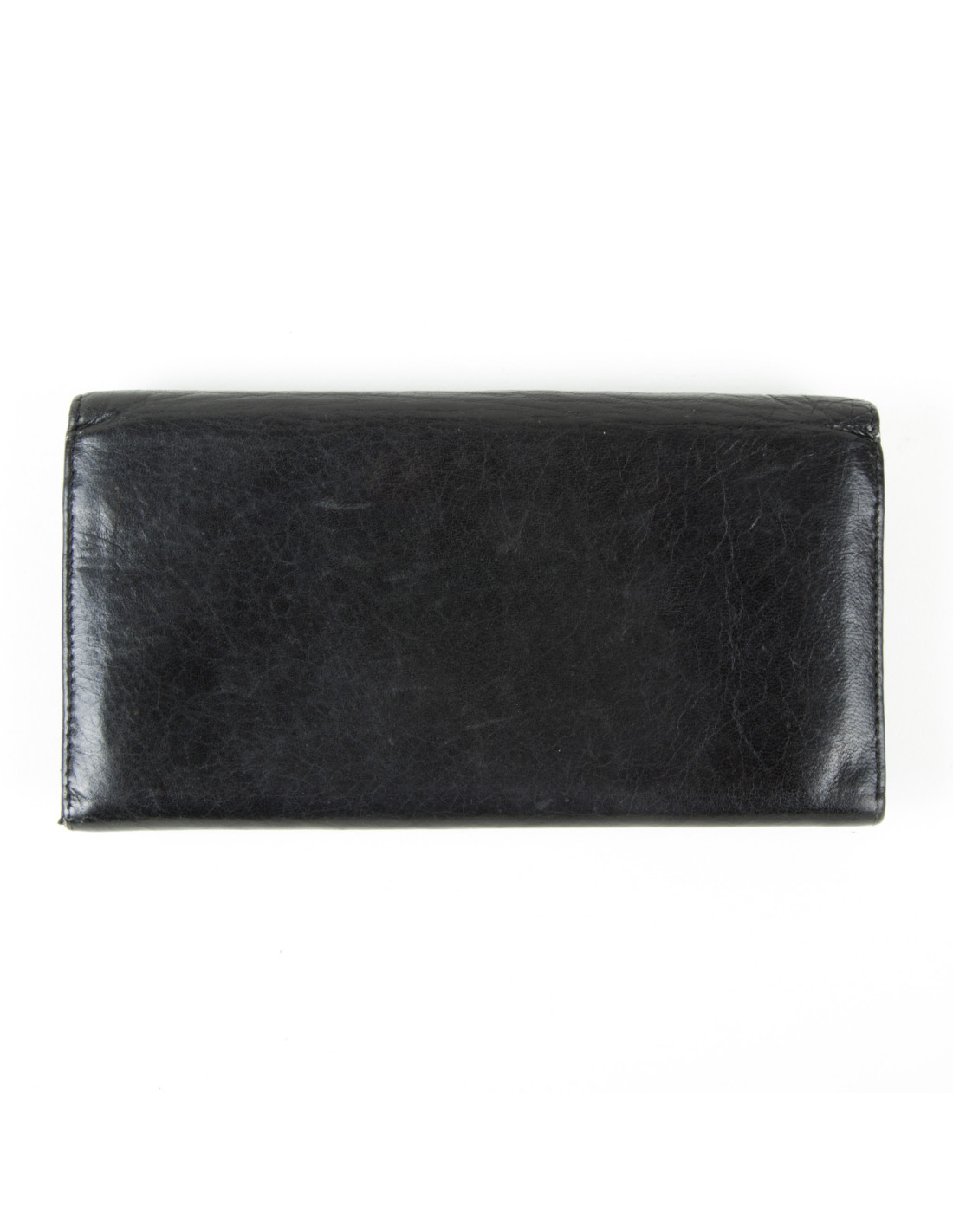 Joli portefeuille Balenciaga en cuir noir, ferrures dorées. L'intérieur est composé d'un porte-monnaie zippé et de 4 compartiments pour billets et 8 fentes pour les cartes bancaires.