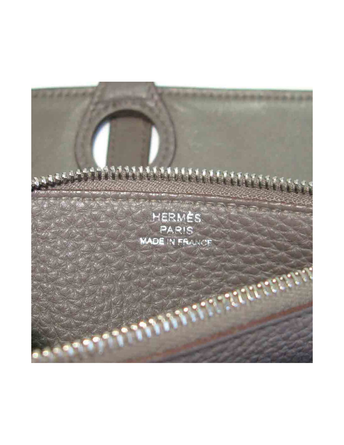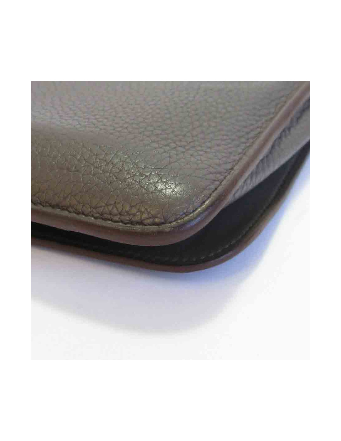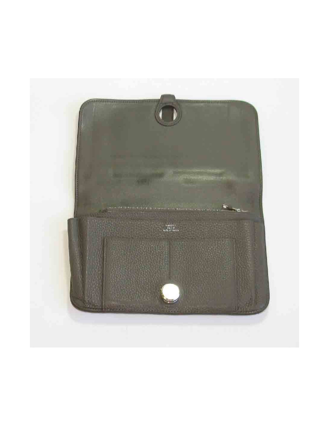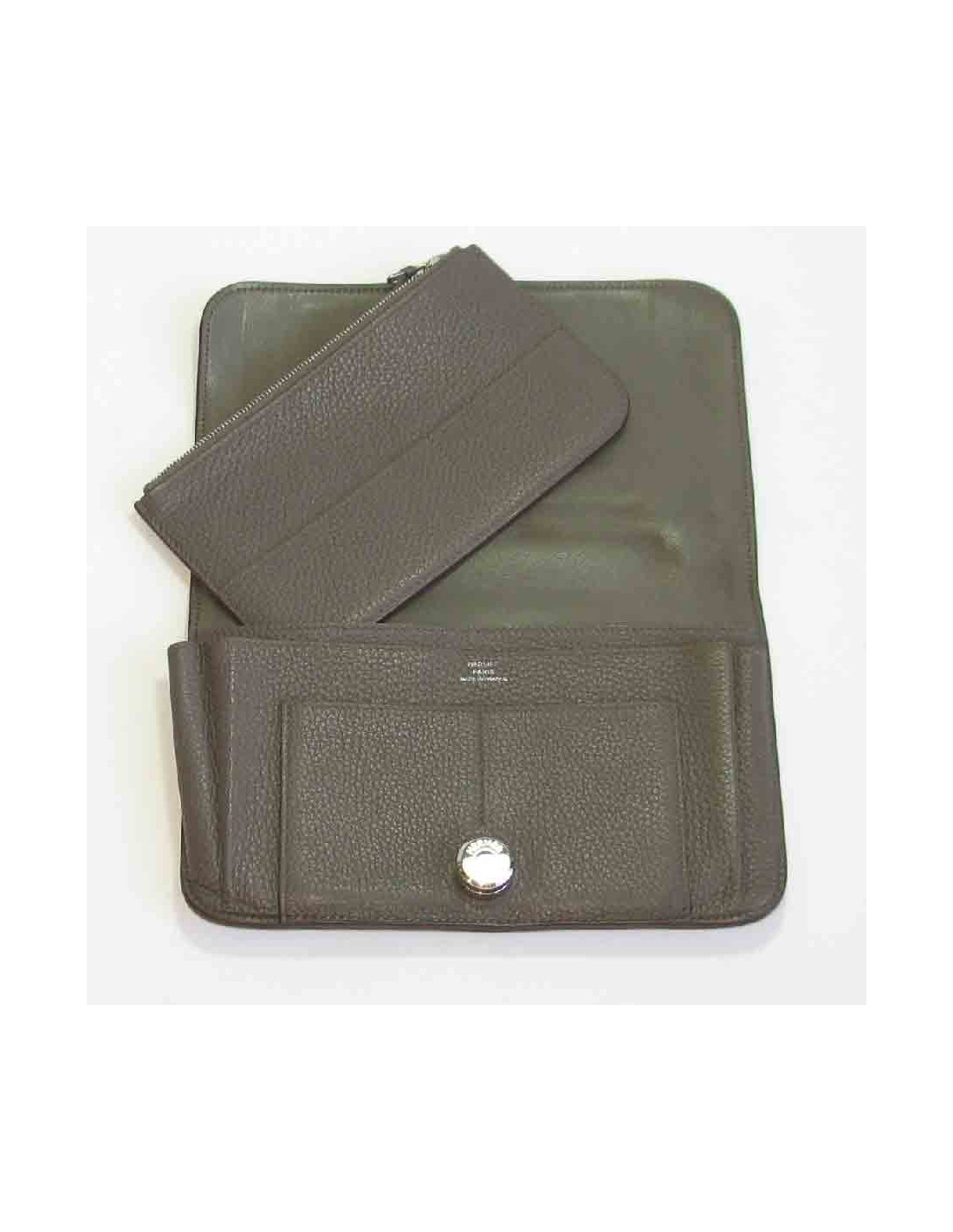 Portefeuille Hermès Dogon Duo en cuir togo étoupe. Fermoir clou de selle en métal argenté. Il a un porte-monnaie amovible zippé.