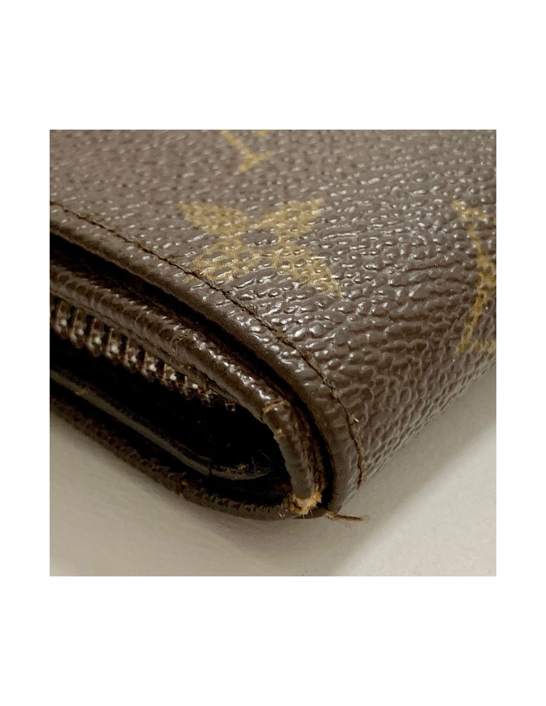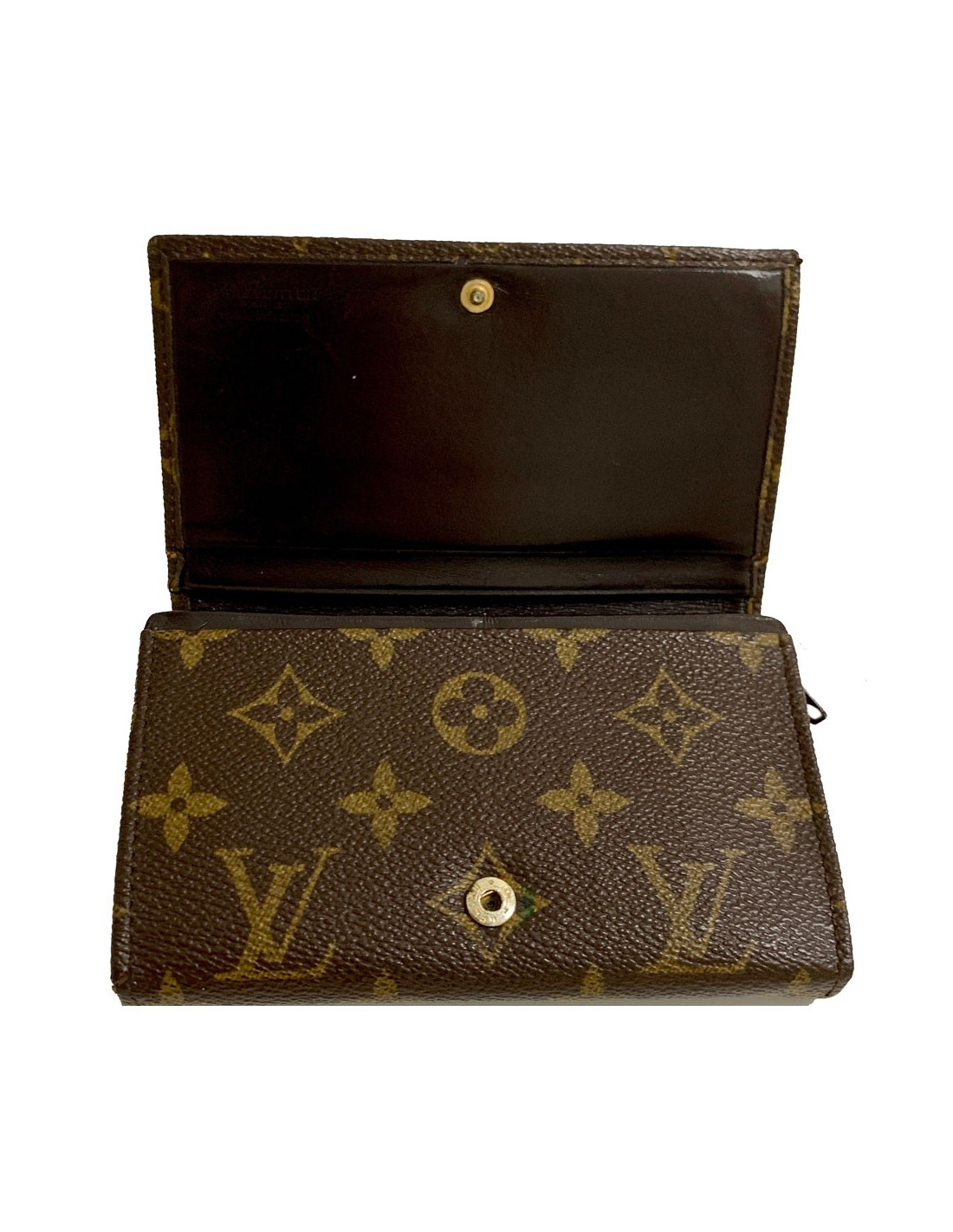 Portefeuille en toile monogram marron de la Maison LOUIS VUITTON. C'est un accessoire vintage. L'intérieur se compose d'un porte-monnaie zippé, 1 soufflet à billet, 1 soufflet à papiers, 2 fentes à cartes et autres.