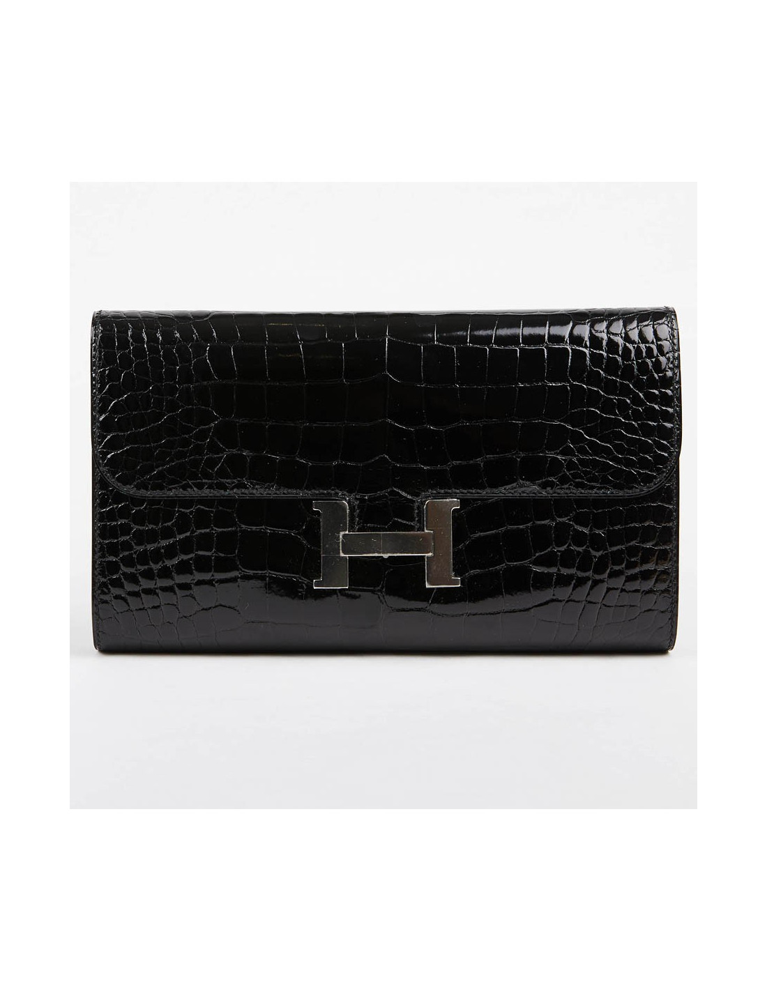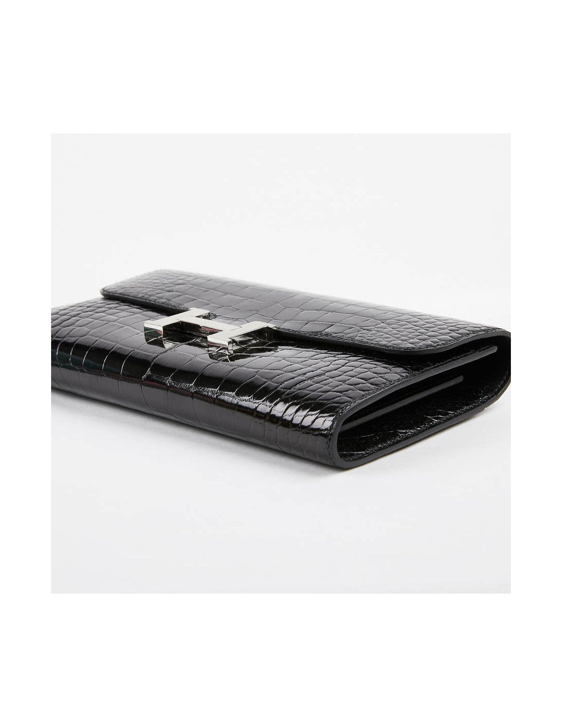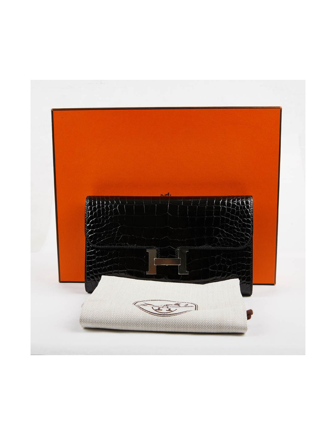 Très beau portefeuille Constance en Alligator du Mississippi noir de la Maison HERMES. Il est doublé en cuir lisse noir. La poche pour pièces qui sépare les deux soufflets de rangement se ferme par une fermeture à glissière. Quatorze poches cartes de crédit et trois poches plates. A l'arrière une poche plaquée. La bijouterie est en argent palladié. Les plastiques sont toujours présents sur le H. Il n'a jamais été porté.