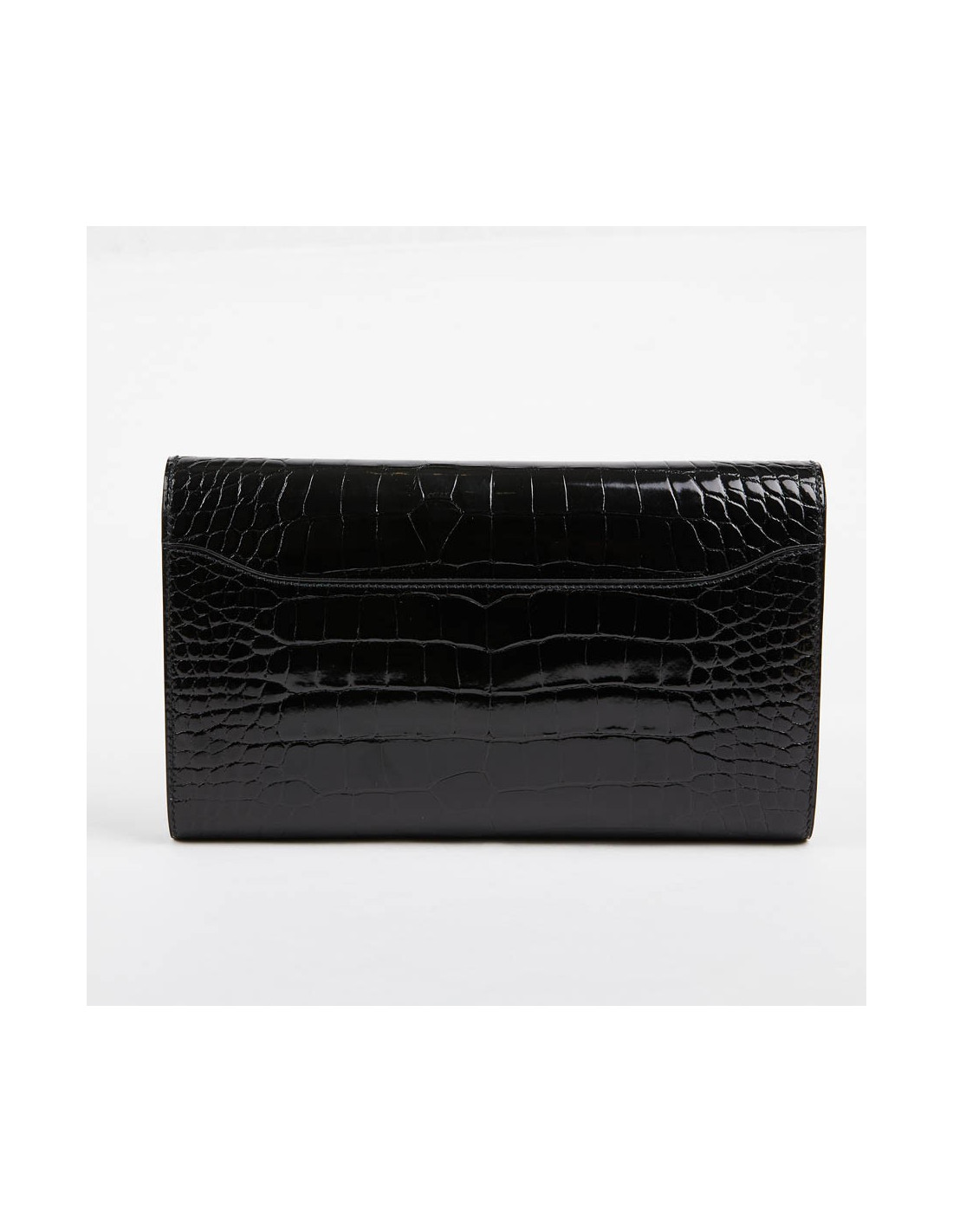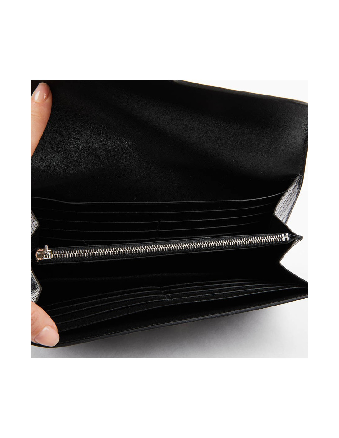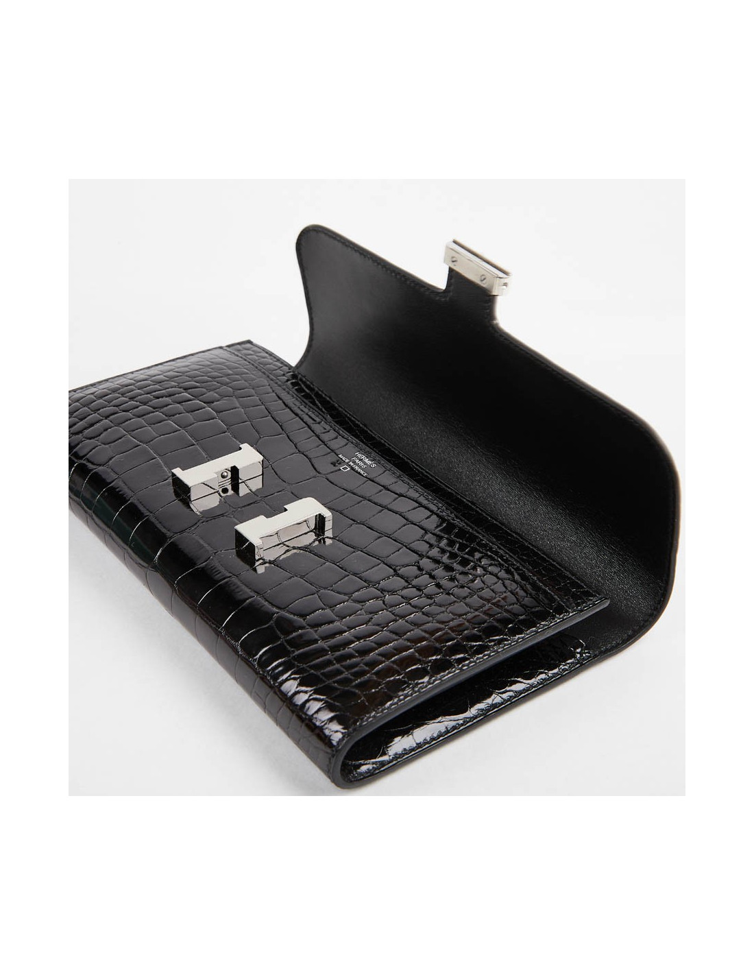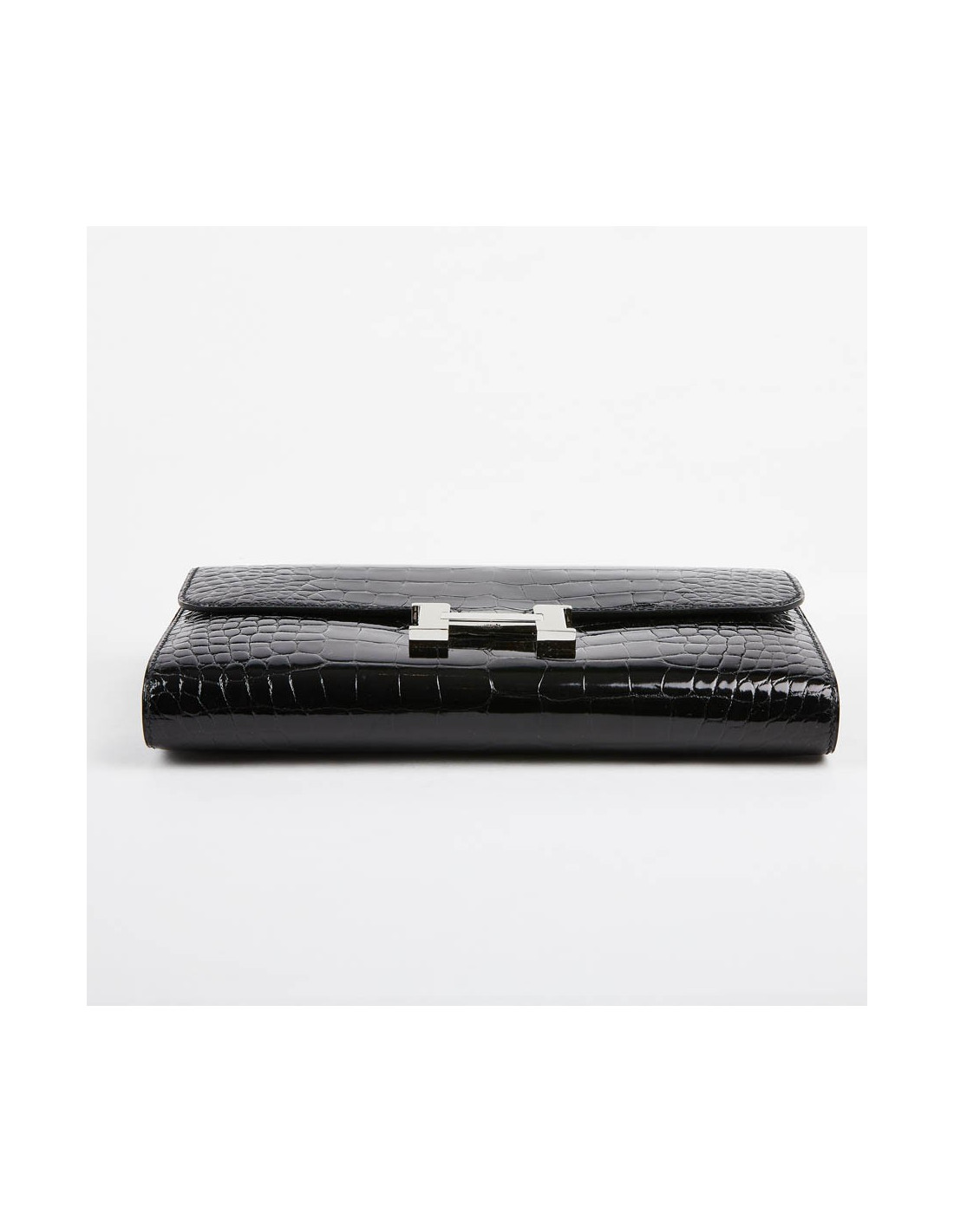 Très beau portefeuille Constance en Alligator du Mississippi noir de la Maison HERMES. Il est doublé en cuir lisse noir. La poche pour pièces qui sépare les deux soufflets de rangement se ferme par une fermeture à glissière. Quatorze poches cartes de crédit et trois poches plates. A l'arrière une poche plaquée. La bijouterie est en argent palladié. Les plastiques sont toujours présents sur le H. Il n'a jamais été porté.