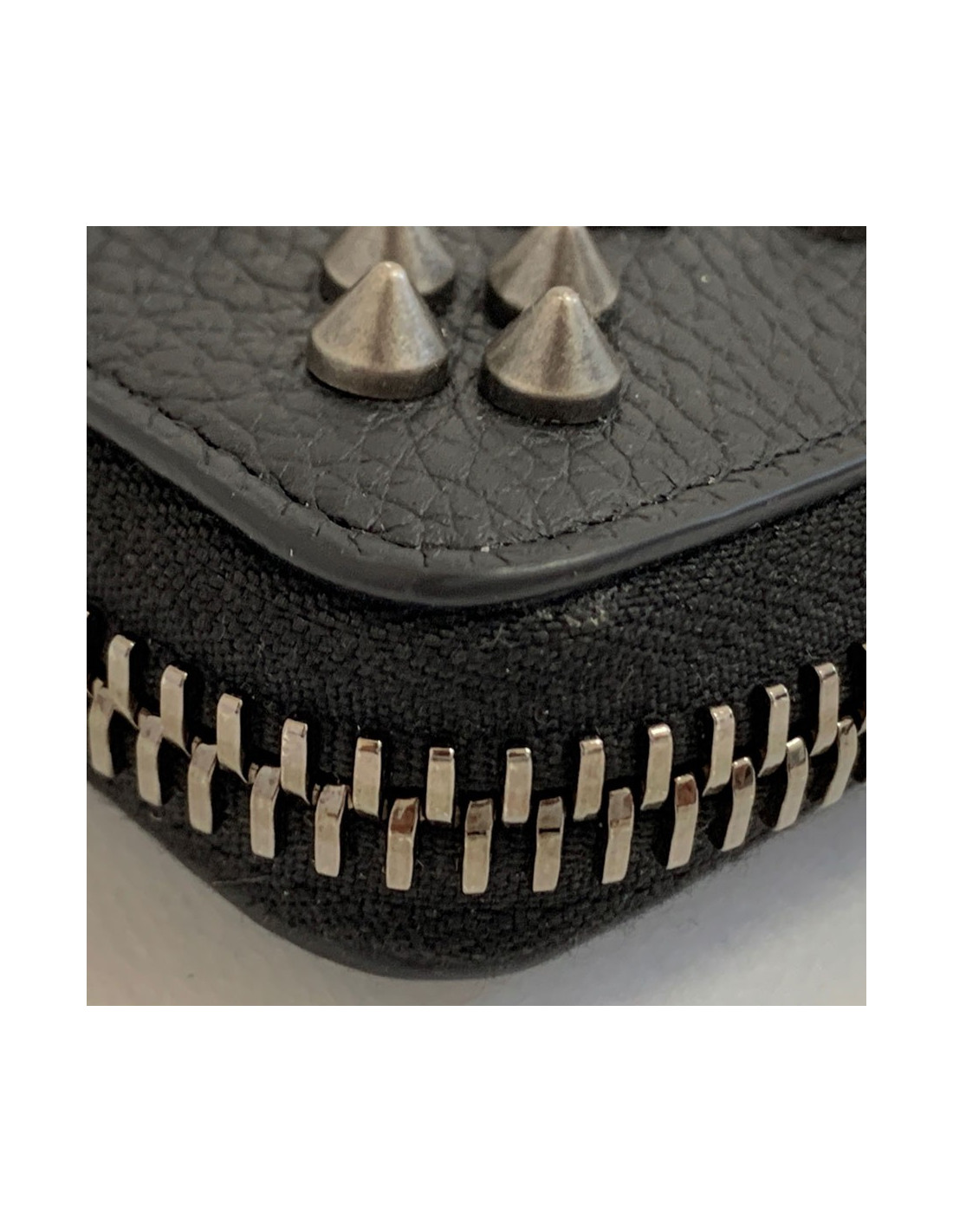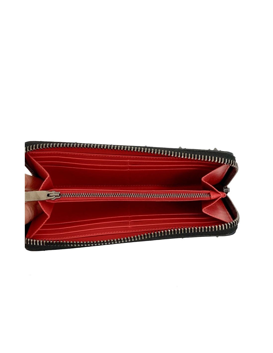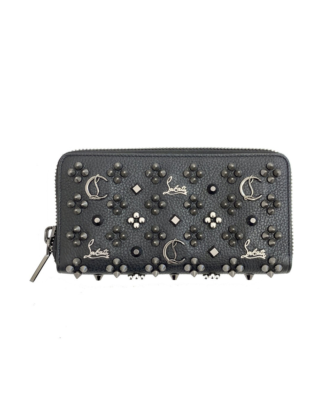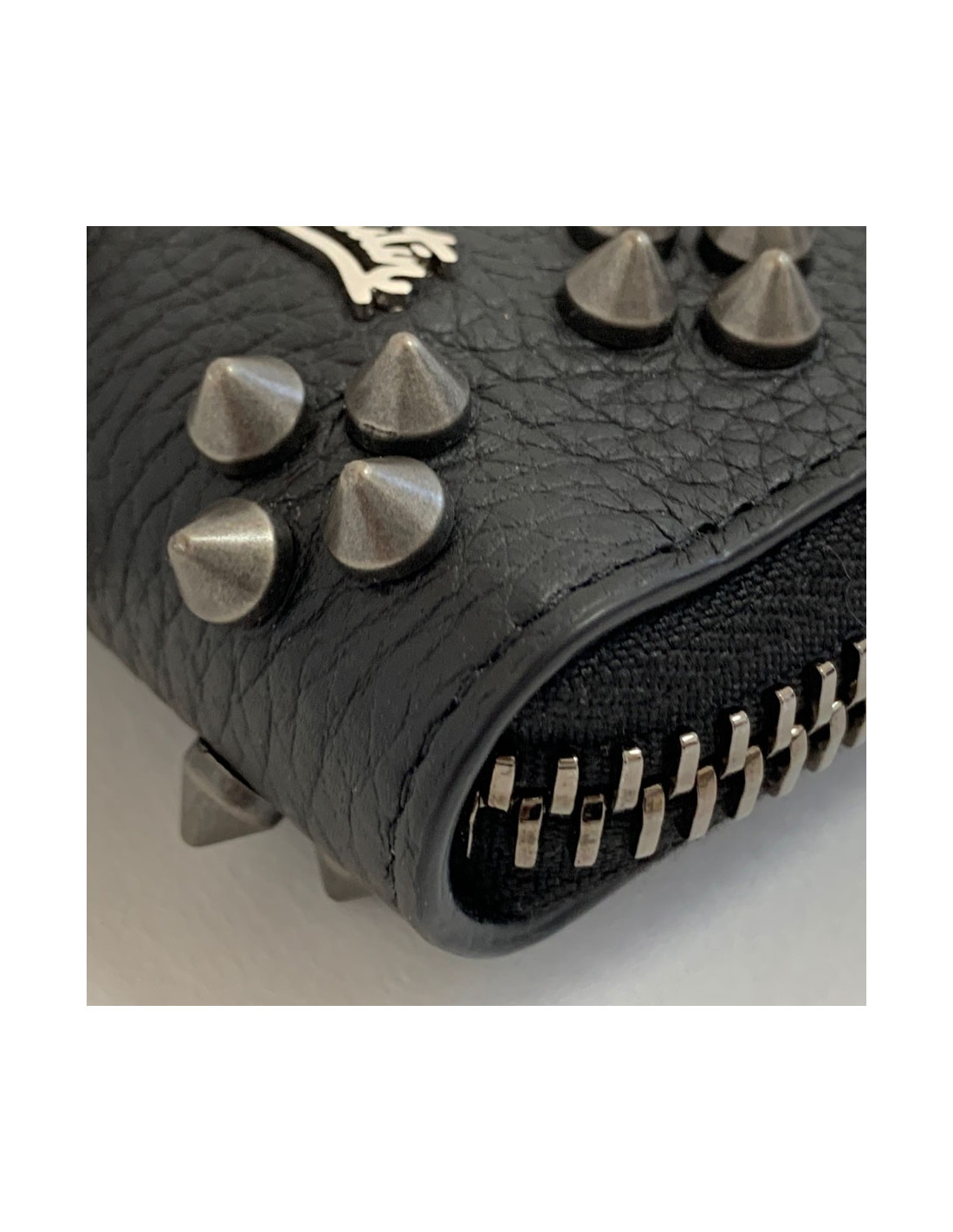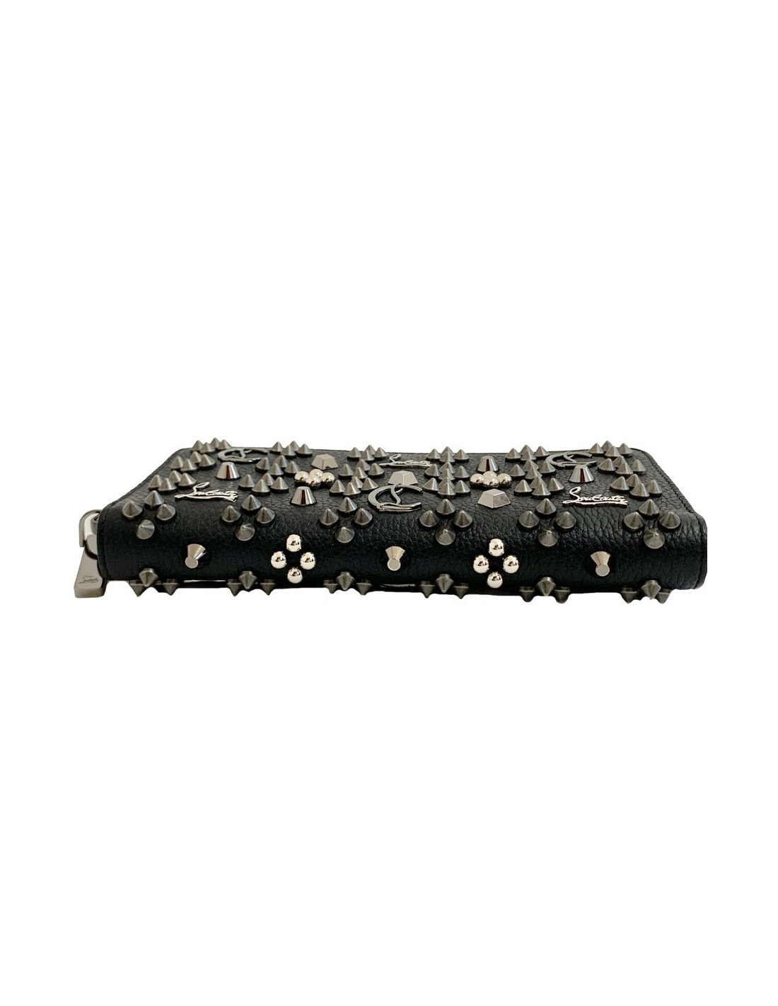 Raffiné et original! Le portefeuille CHRISTIAN LOUBOUTIN, modèle Panettone, est en cuir de veau grainé noir orné de spikes, du logo et de la marque en métal argenté et ruthénium.