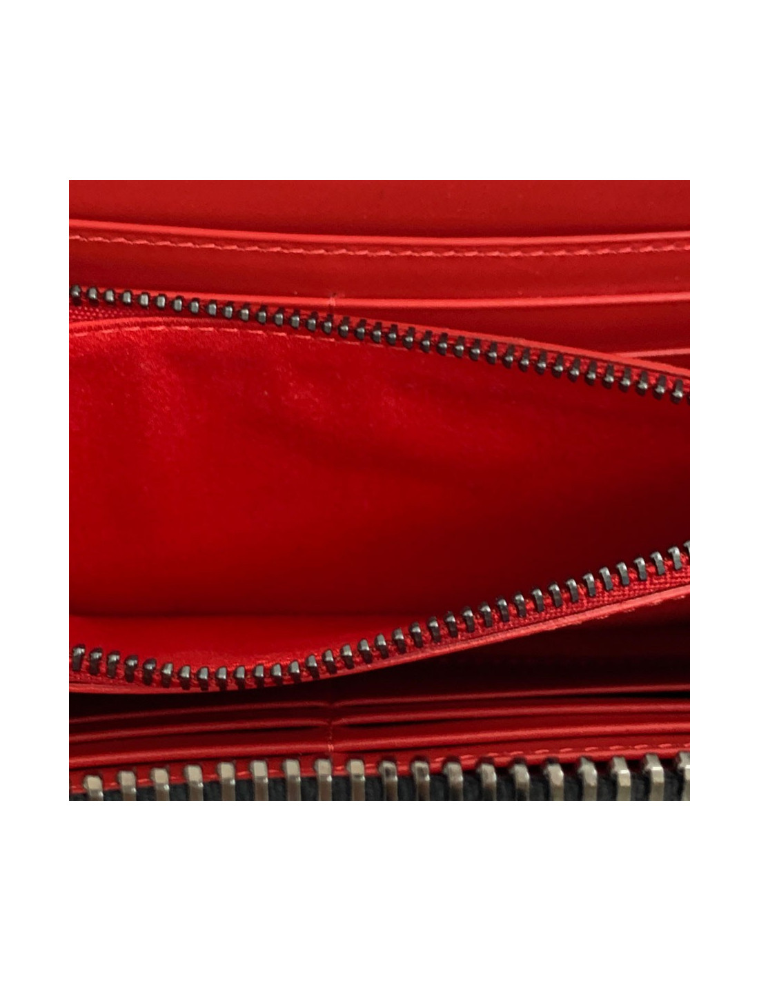 L'intérieur en cuir rouge (couleur emblématique de la marque) est composé de - Quatre poches plates, un porte-monnaie zippé, douze fentes à cartes. Made in Italy.